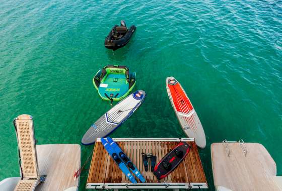 RIB 13ft/4m with an outboard 40hp engine, 2x SUP, Wakeboard, Towable inflatable sofa for 2 persons, Water skis adult & children,