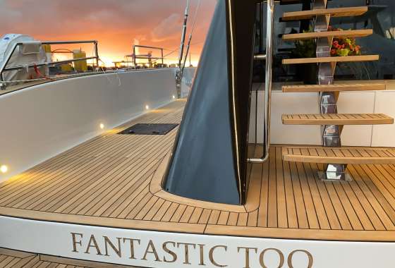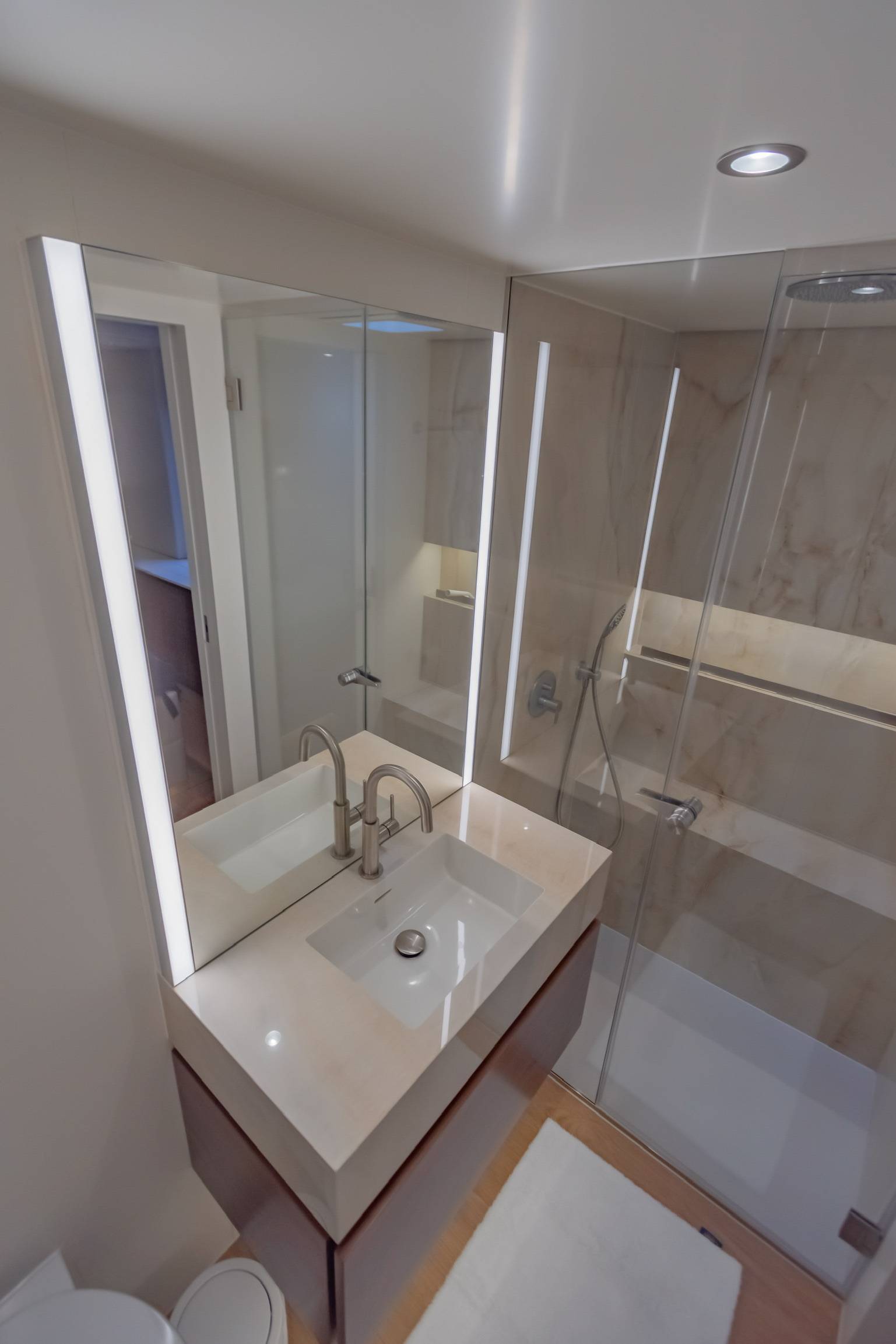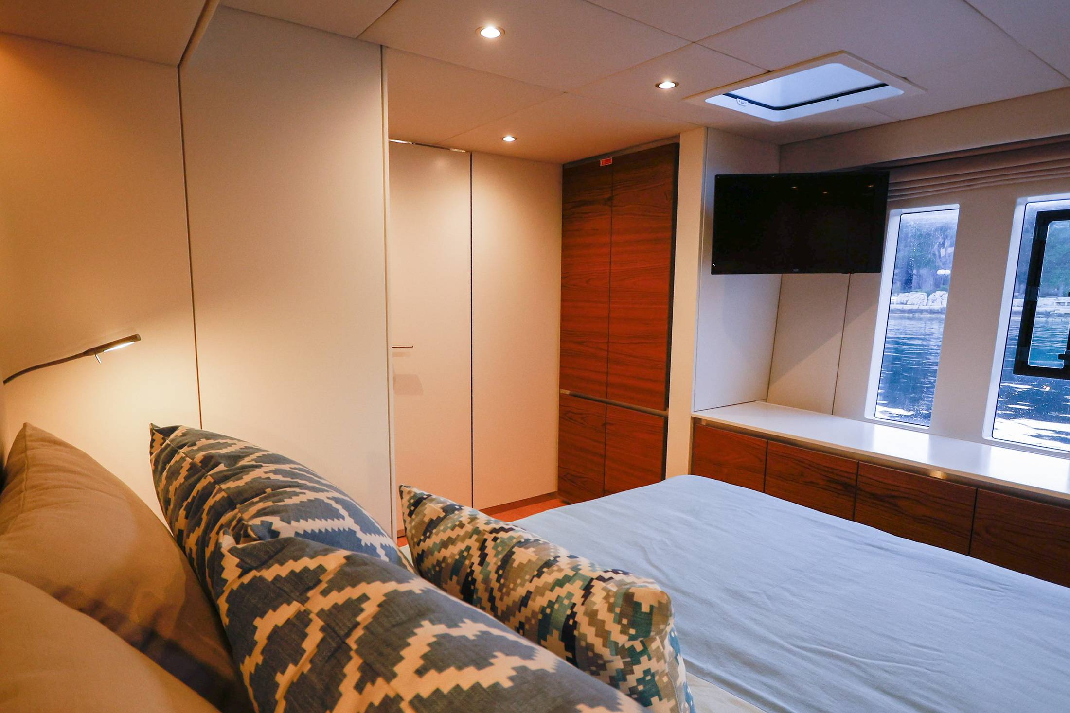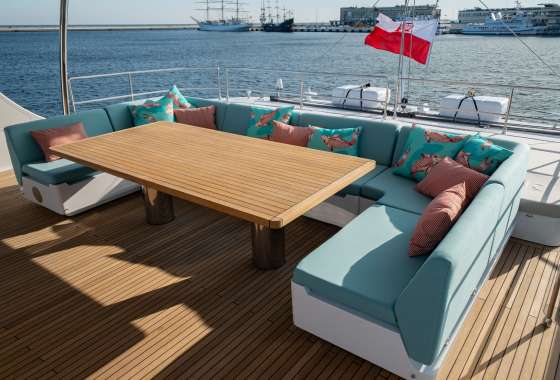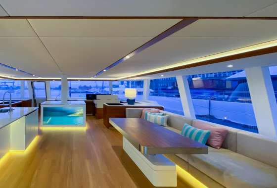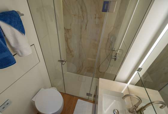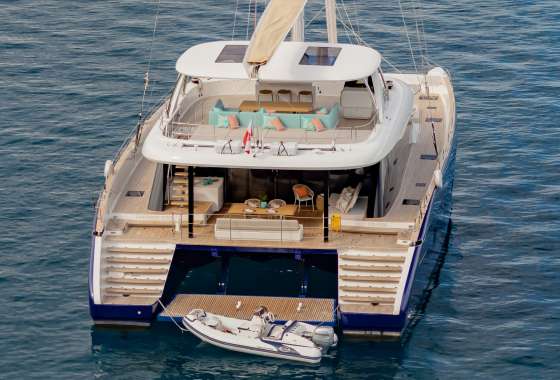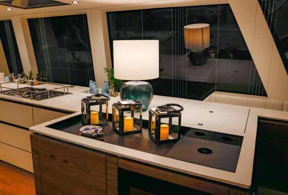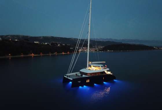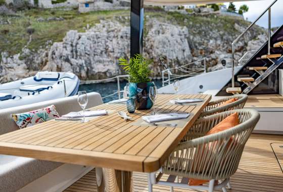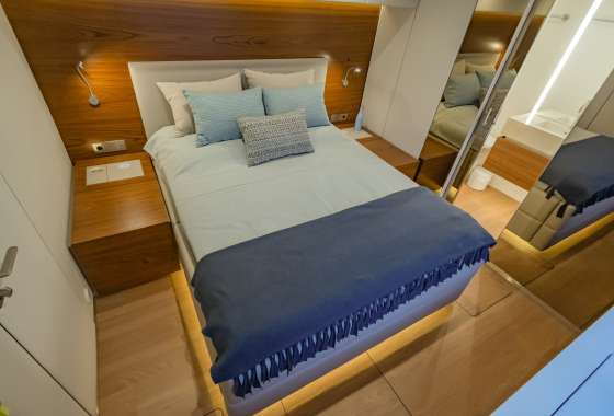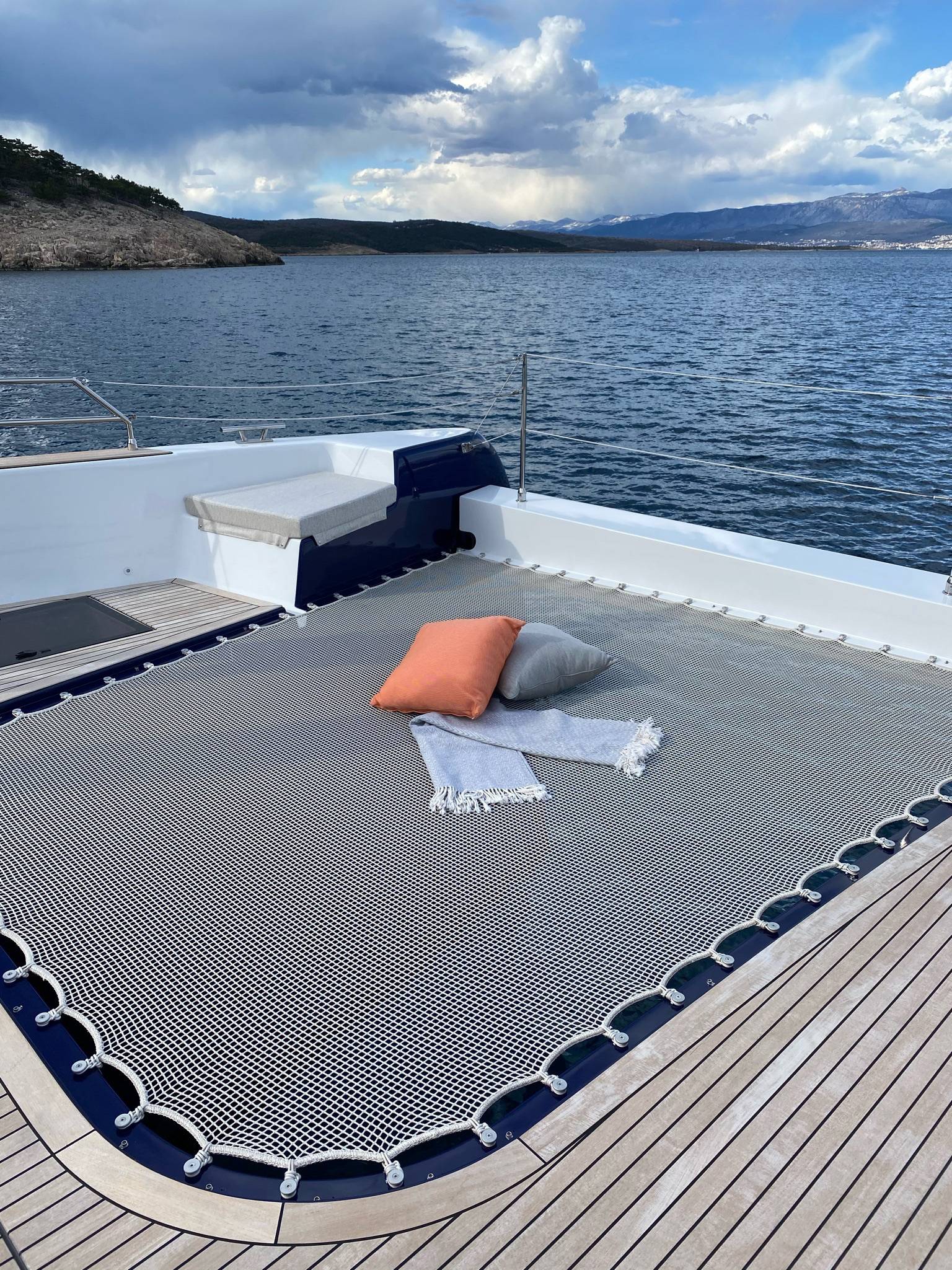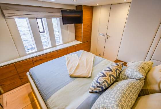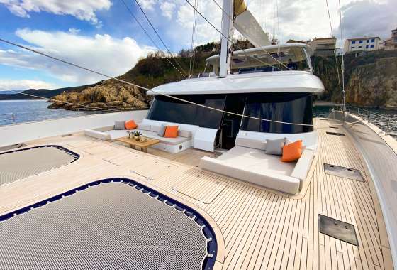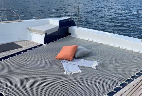 Electric winch, 2x Bow thruster, electric Air condition, 140000 BTU Generator, 2x Watermaker - desalinator Sea recovery (280I), Cockpit/stern, Outside shower, Hydraulic gangway, Opacmare Kitchen (fully equipped), Dryer and Washing machine, Wine cooler, Underwater lights, Wi-Fi Full speed flat rate, Sound System - Sonos throughout the boat, Grill (Barbeque), LCD TV (all cabins and saloon), Sunbeds (bow, stern, fly), Net trampoline on bow, Hydraulic bathing platform, Netflix