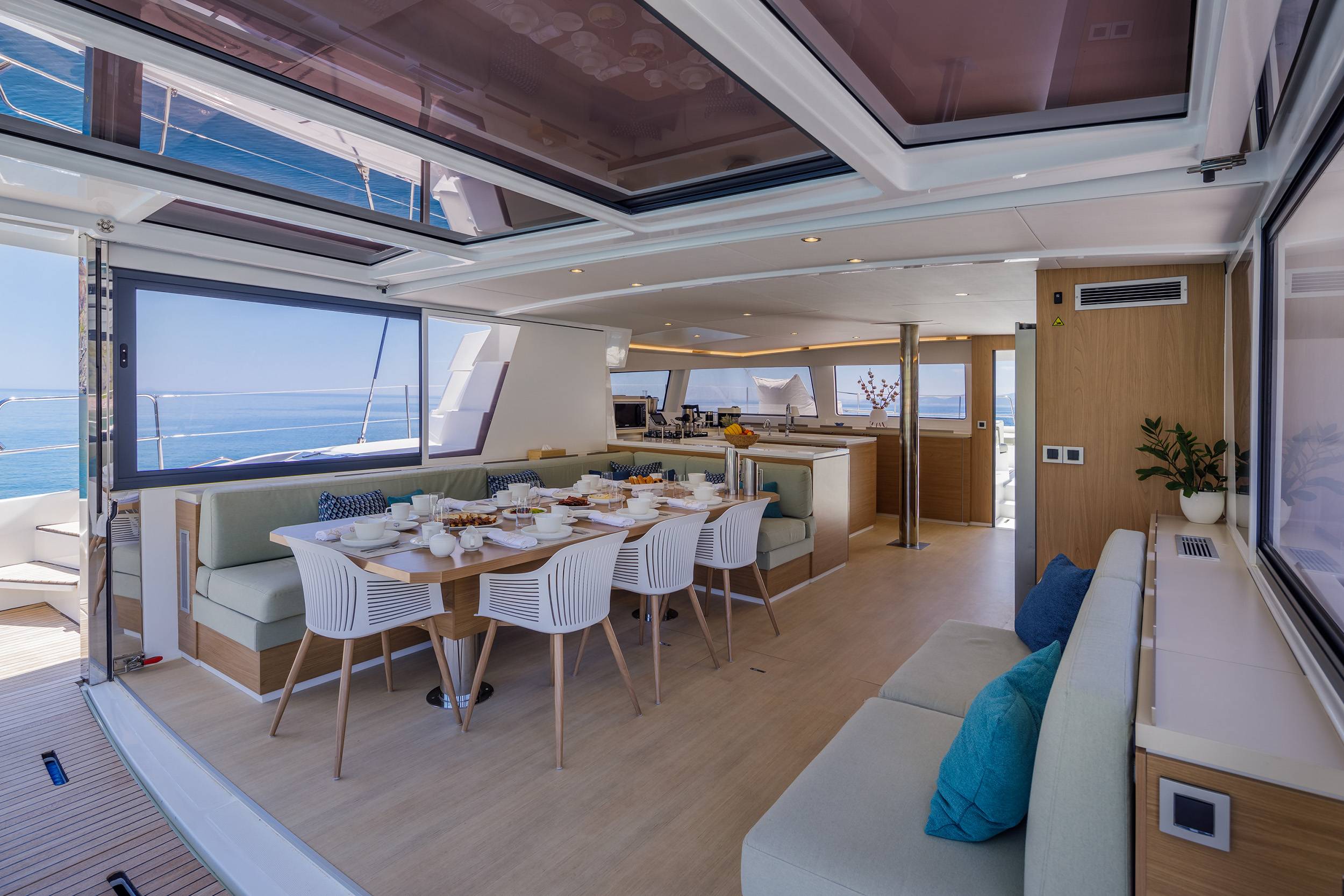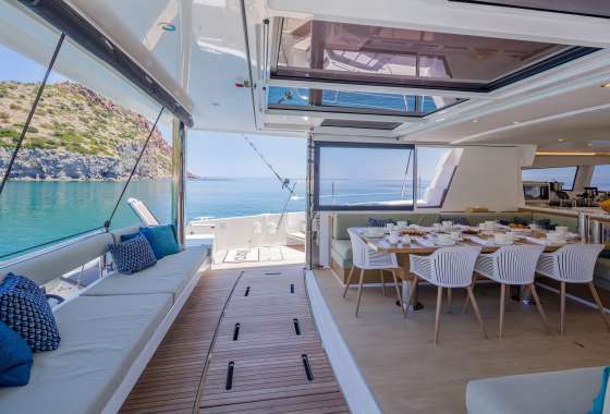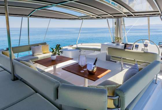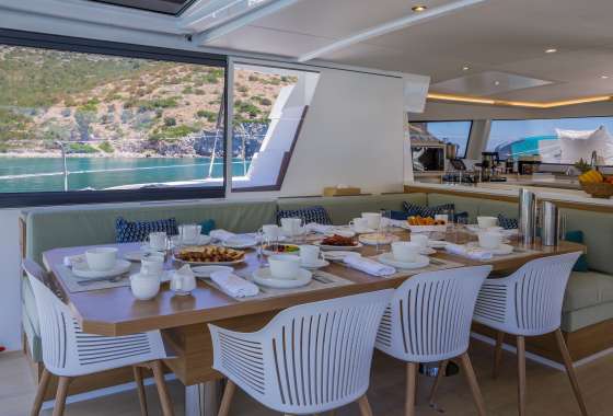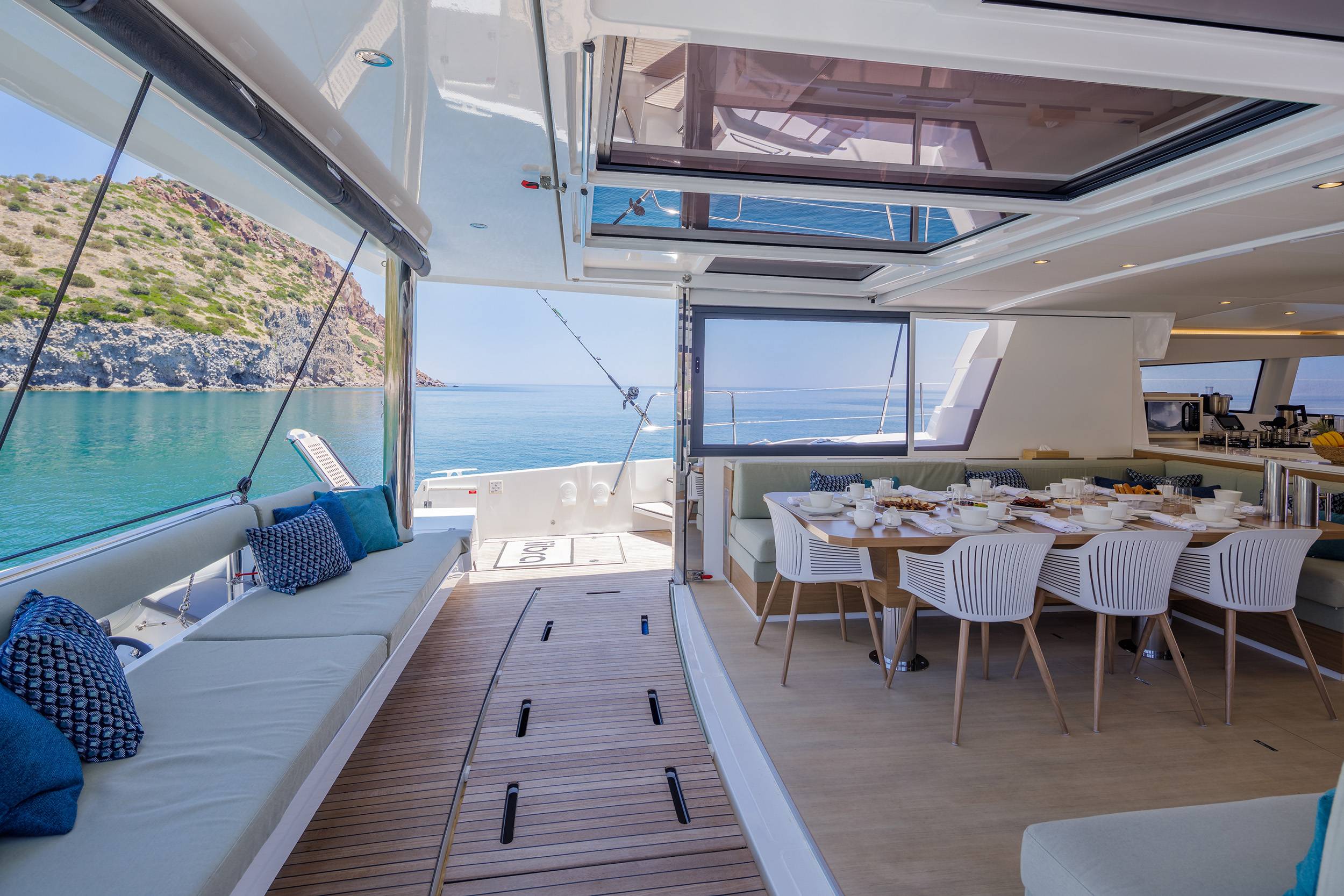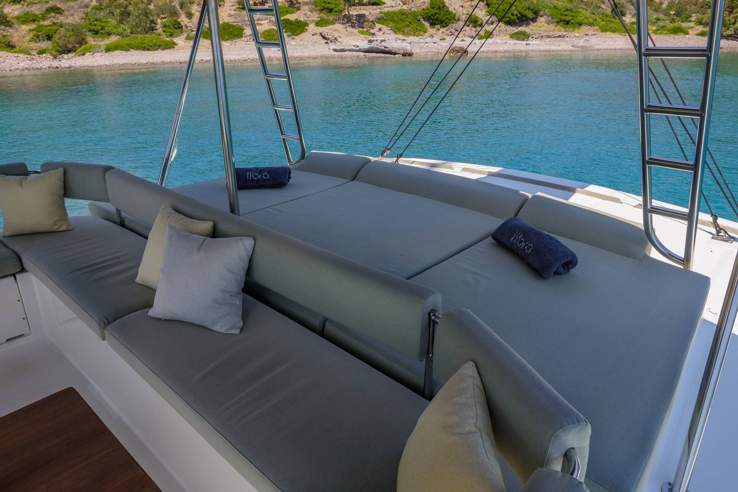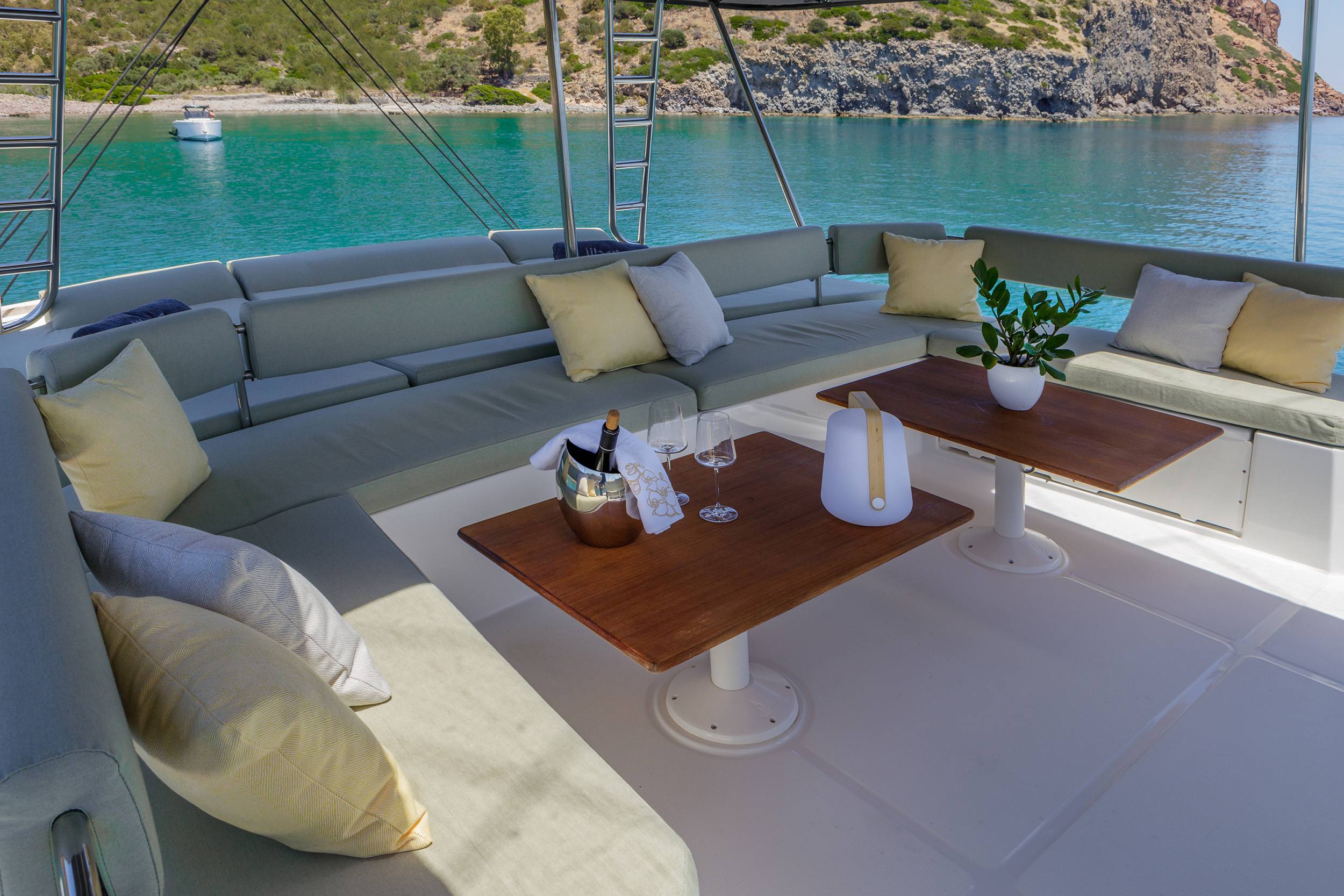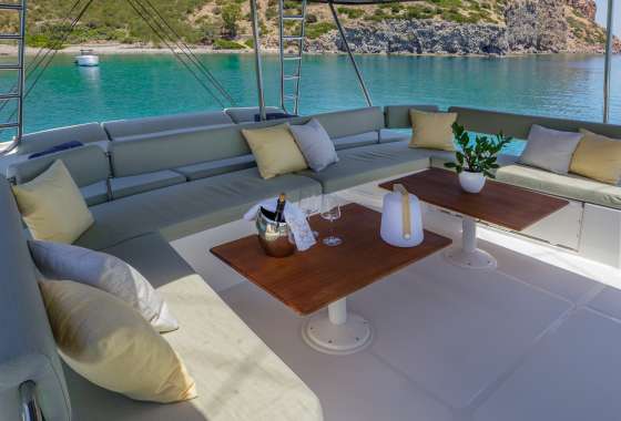 Libra is characterized by the enormous outdoor & indoor spaces! Guests can enjoy sitting comfortably in the forward deck saloon which is accessed directly from inside, open to the water.