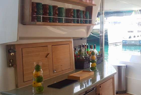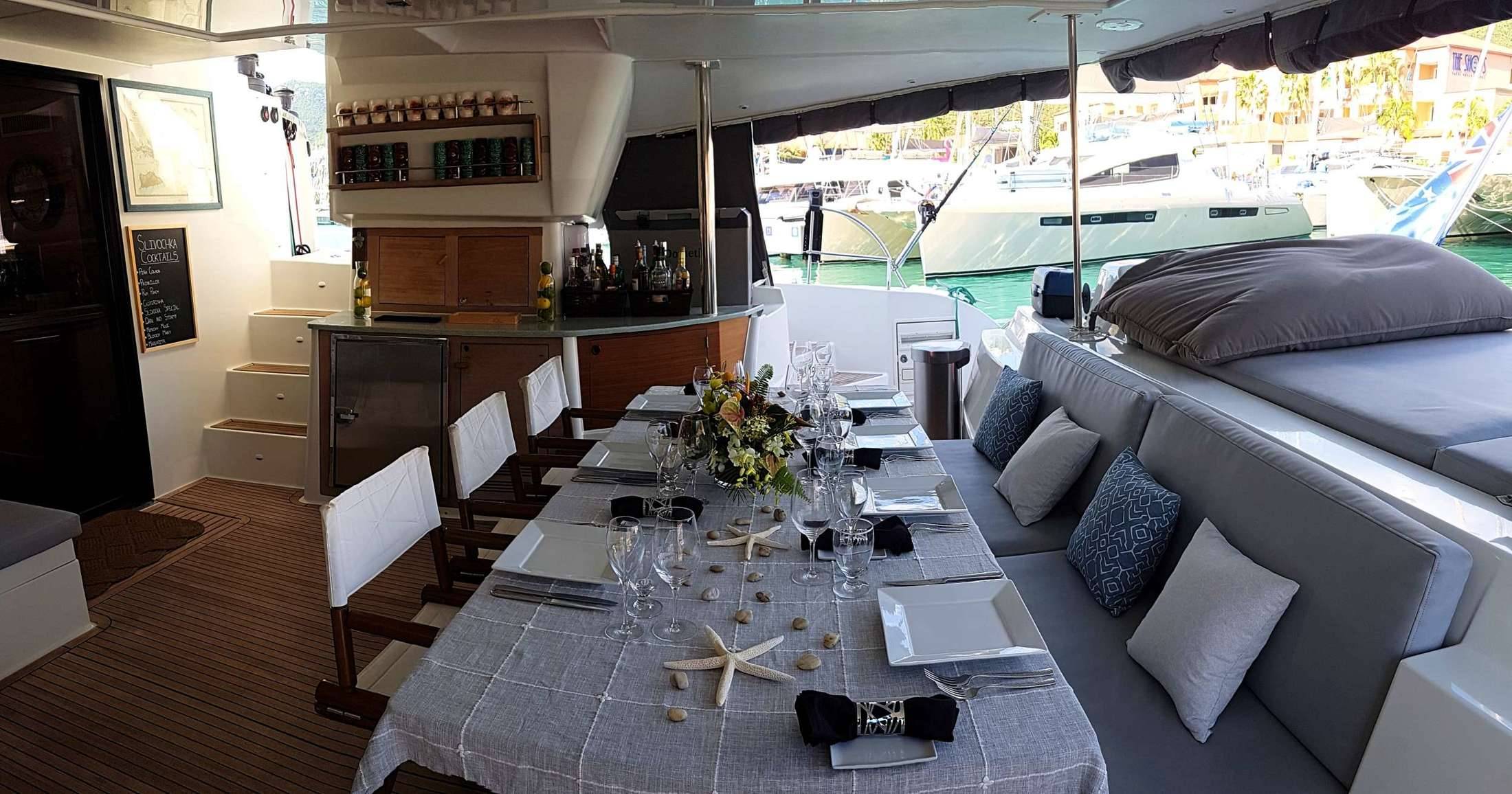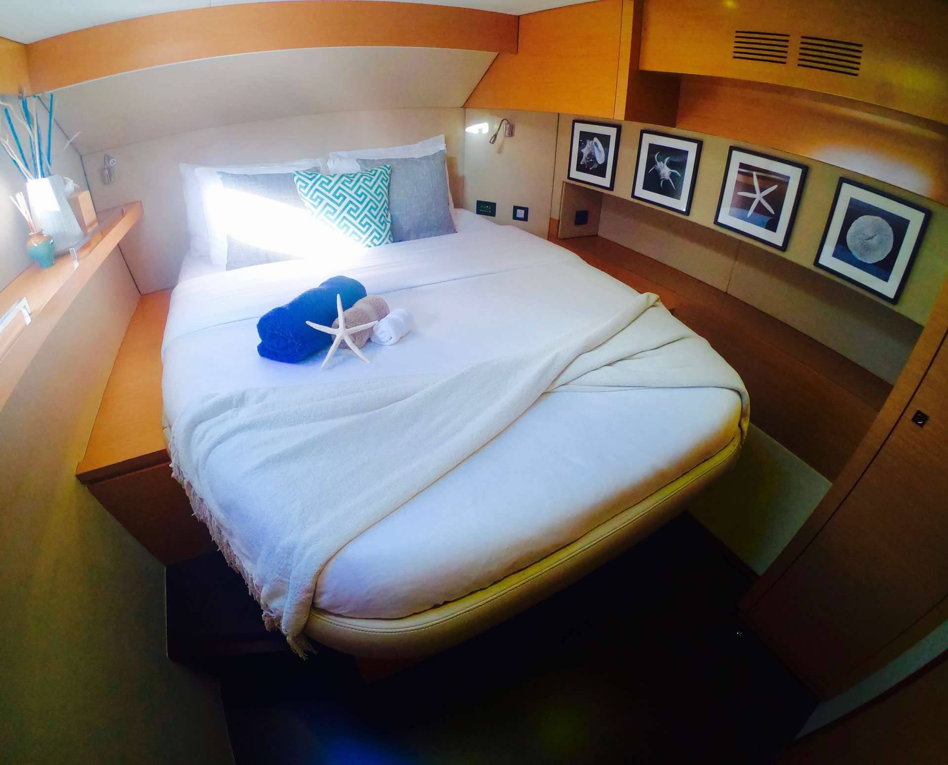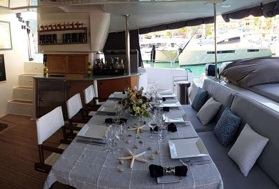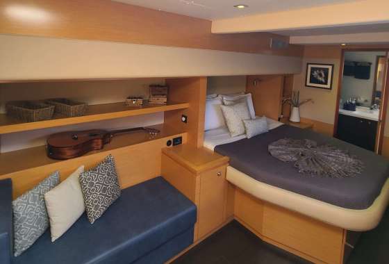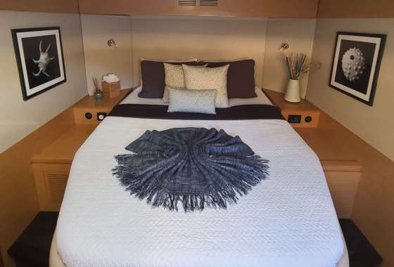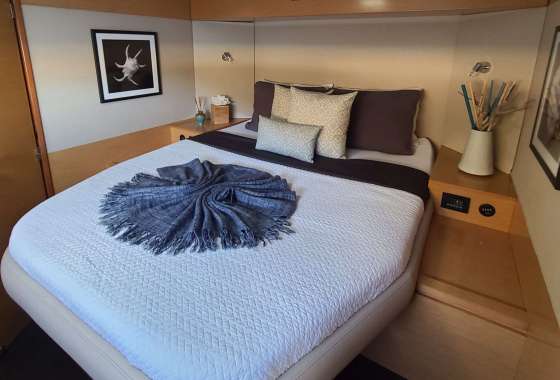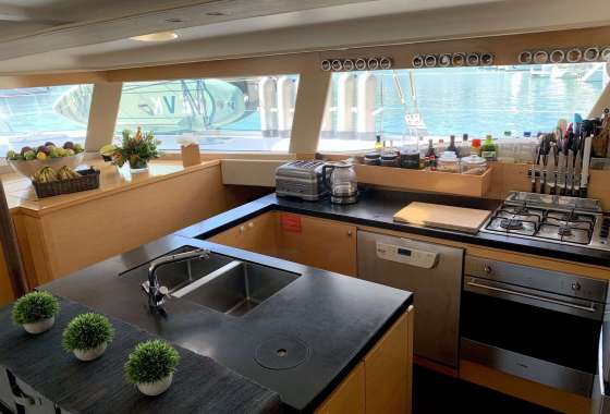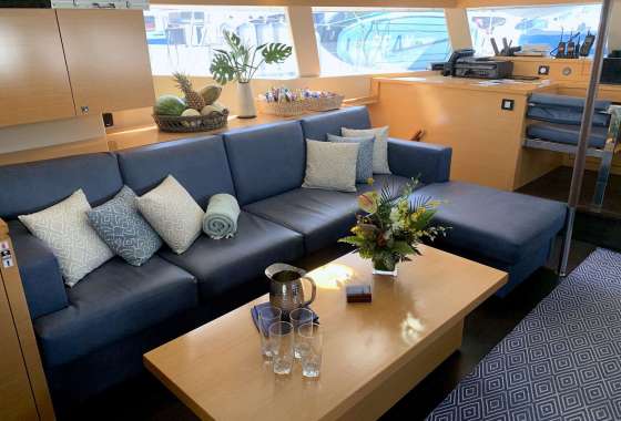 ODYSSEA Is An Extremely Spacious Fountaine-Pajot Sailing Catamaran With Four Queen Cabins Accommodating Up To 8 Guests. Enjoy outdoor dining in the fresh air with a large aft deck seating table and also has a very high ceiling. ODYSSEA has a spacious salon with a galley-up where are delicious meals are made and dining indoors is an option. Plenty of lounging and a wet bar so a cold beverage is never too far away. Large sky lounge above the salon roof where guests love to suntan or sit with their captain while sailing. A favorite spot to enjoy happy hour treats and one of the yacht’s signature delicious cocktails. This catamaran is ideal for larger groups with so much space and comfort without compromising on sailing performance.