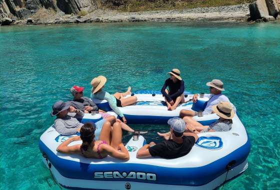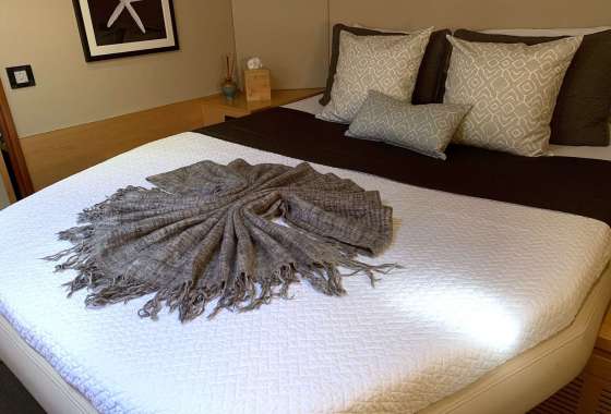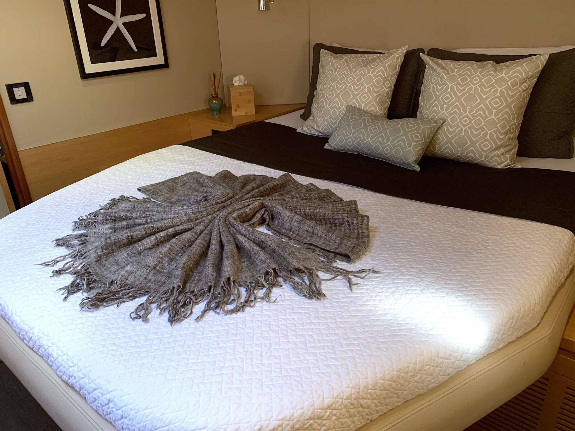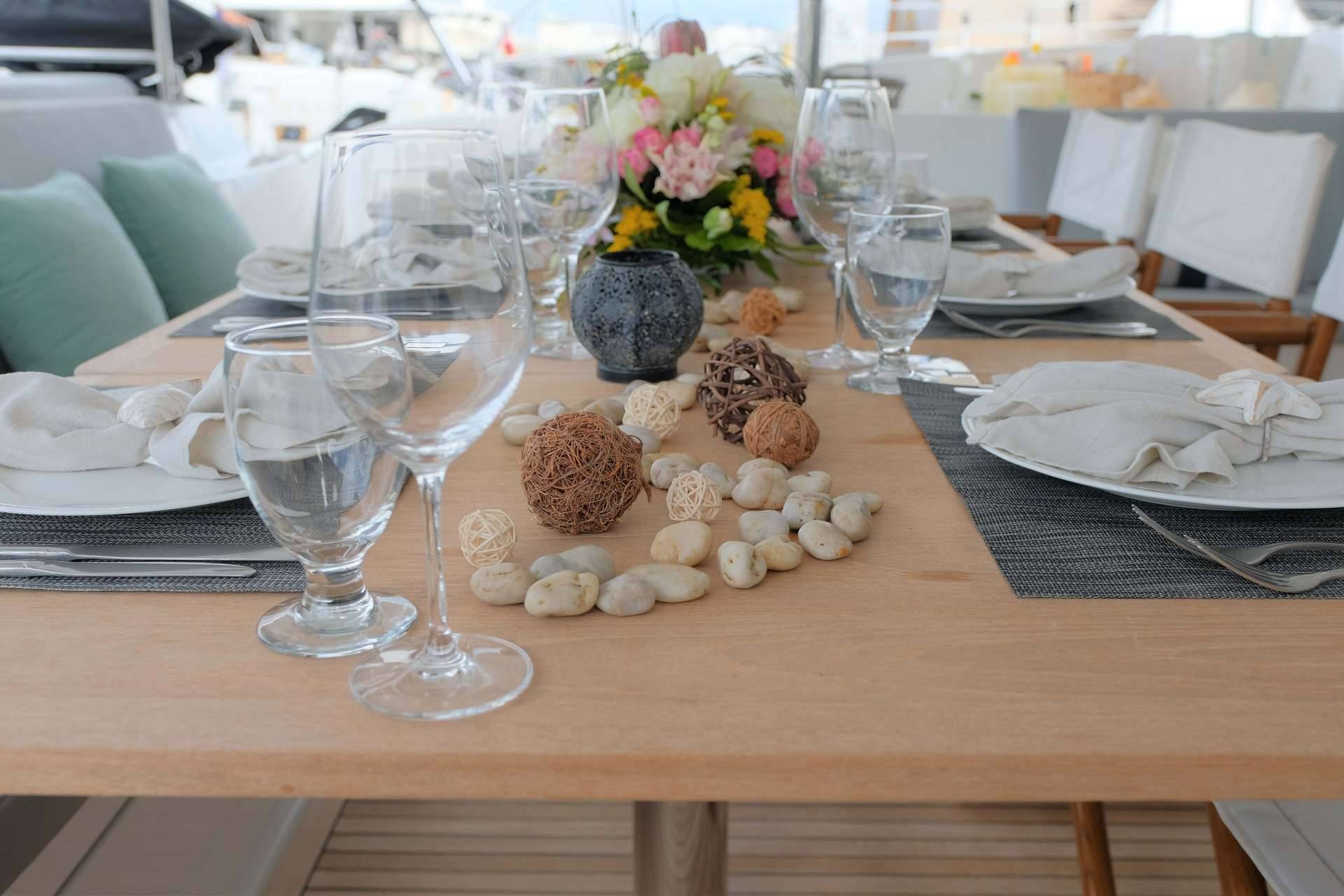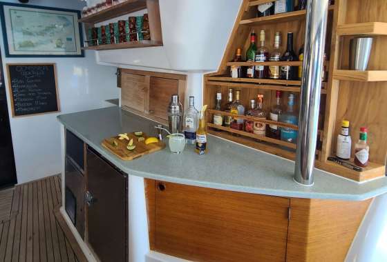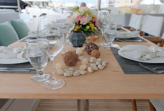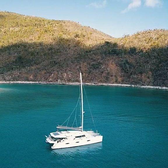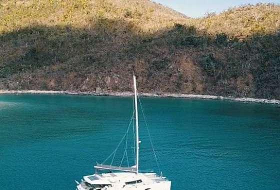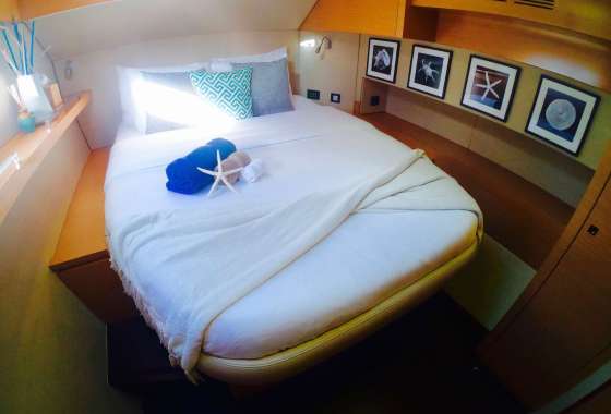 ODYSSEA Is An Extremely Spacious Fountaine-Pajot Sailing Catamaran With Four Queen Cabins Accommodating Up To 8 Guests. Enjoy outdoor dining in the fresh air with a large aft deck seating table and also has a very high ceiling. ODYSSEA has a spacious salon with a galley-up where are delicious meals are made and dining indoors is an option. Plenty of lounging and a wet bar so a cold beverage is never too far away. Large sky lounge above the salon roof where guests love to suntan or sit with their captain while sailing. A favorite spot to enjoy happy hour treats and one of the yacht’s signature delicious cocktails. This catamaran is ideal for larger groups with so much space and comfort without compromising on sailing performance.
