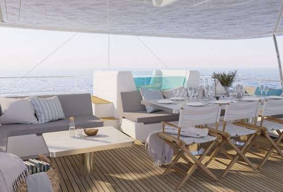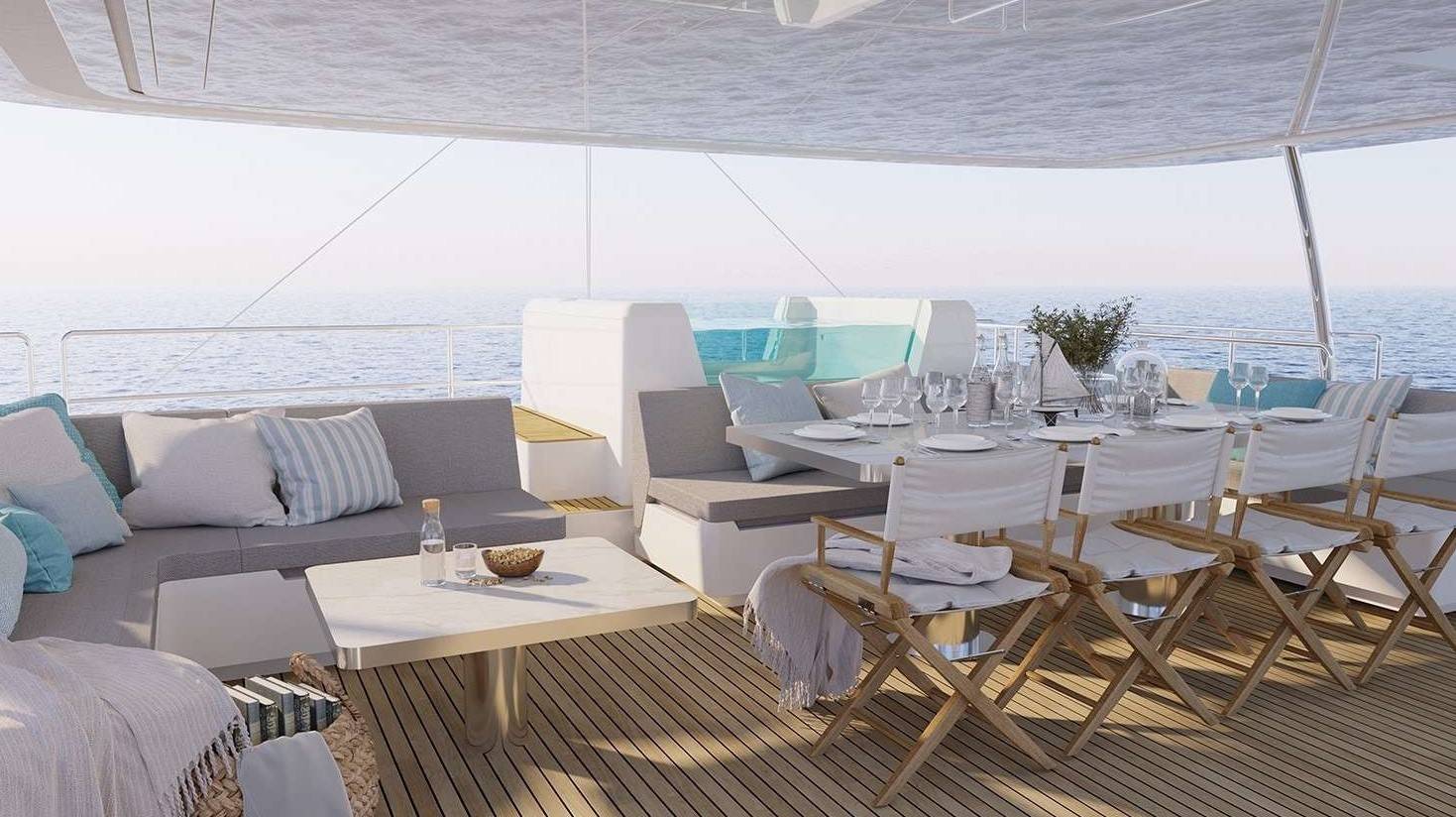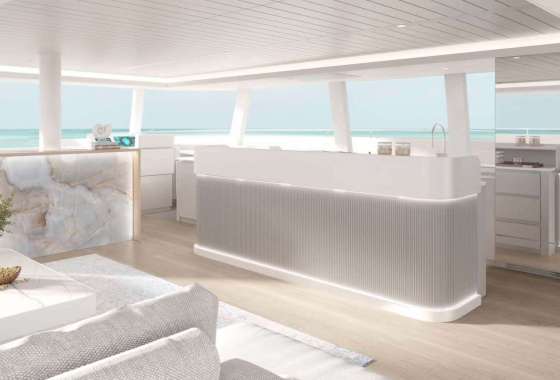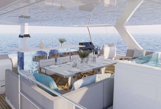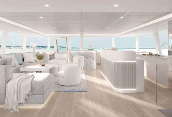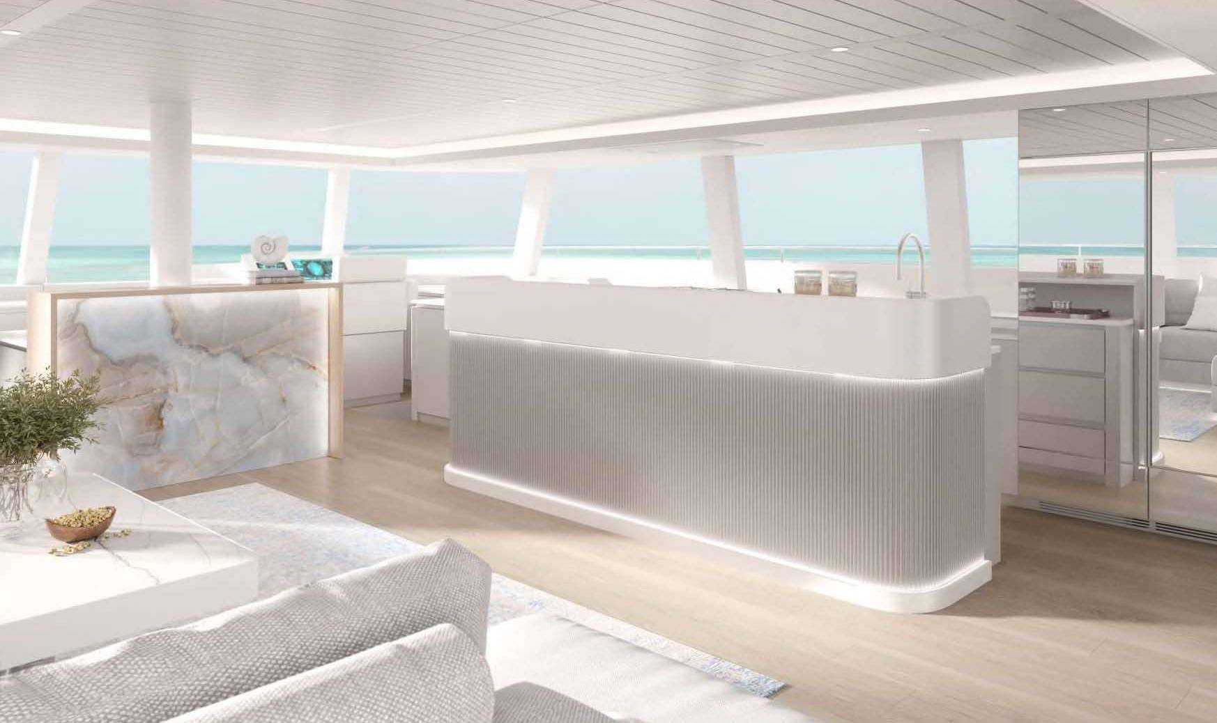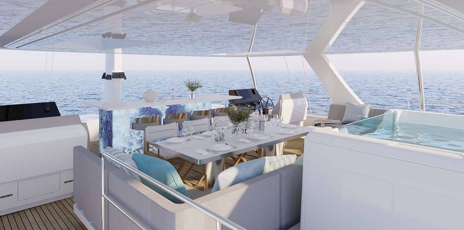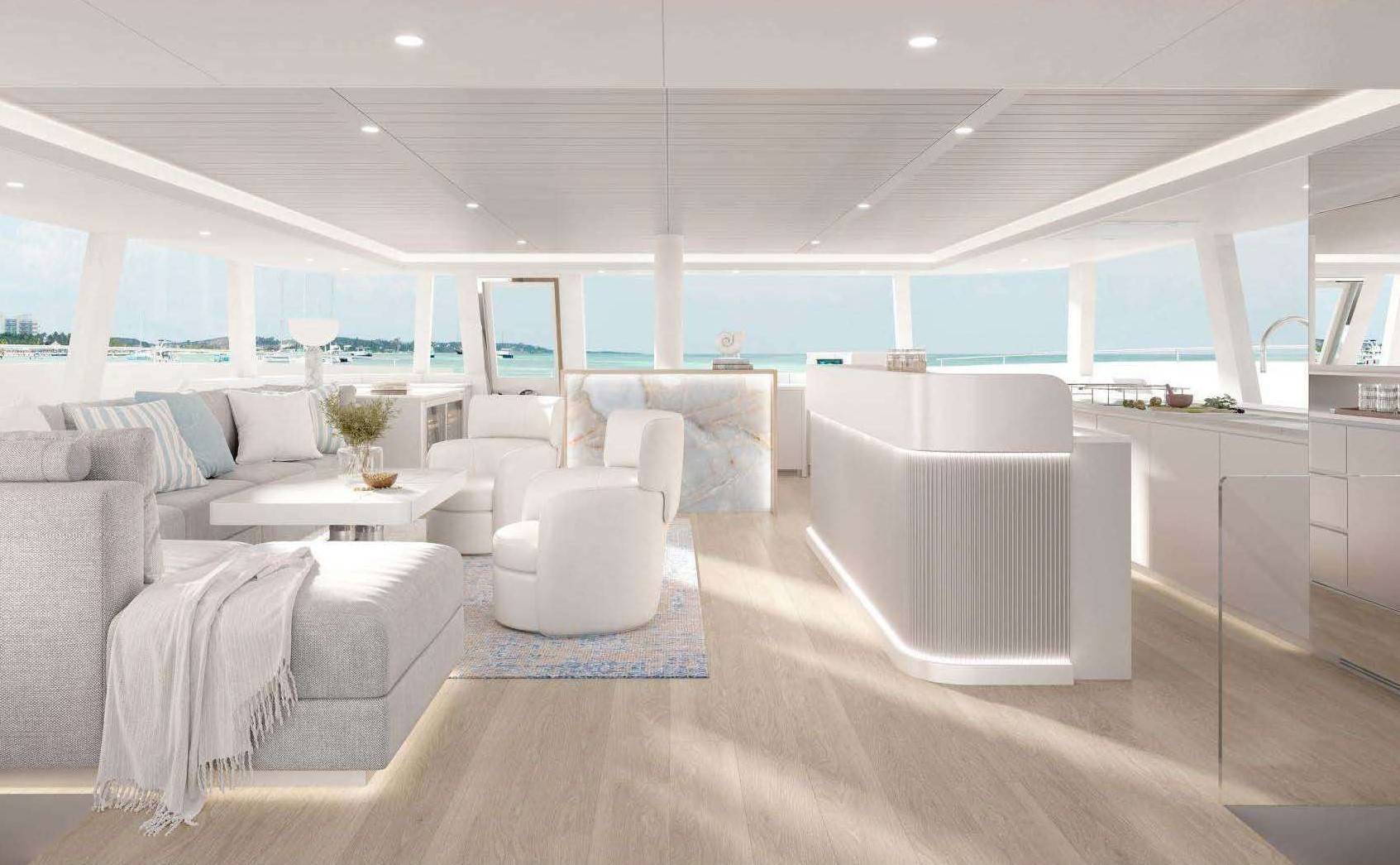Three fully-equipped wet bars, Two Designated Wine Fridges, Five Designated Drink/Beer Fridges, Three Ice Makers, plus Commercial Ice Maker in Bilge, Day Head with Wall-Mounted Baby Changing Table, Wireless Charging Pads located in Salon, Bar Areas and Cabins Luxury, Hypoallergenic Linens and Towels, Reef-Safe and Organic Toiletries, Two Outdoor Waterfall Showers, Hot Tub on Flybridge, Large Screen Smart TV on Flybridge, Onboard Dive Compressor.