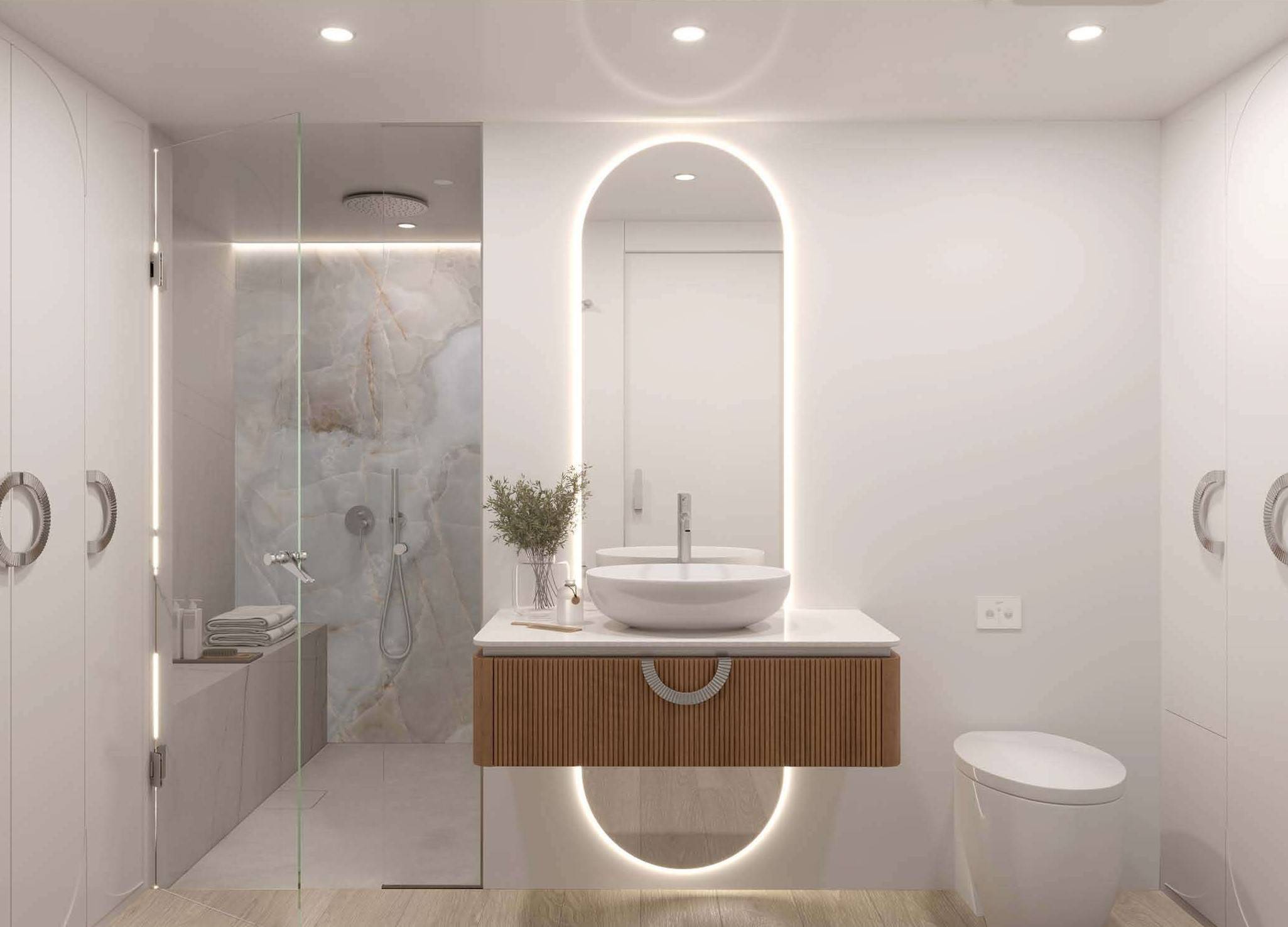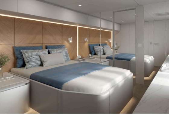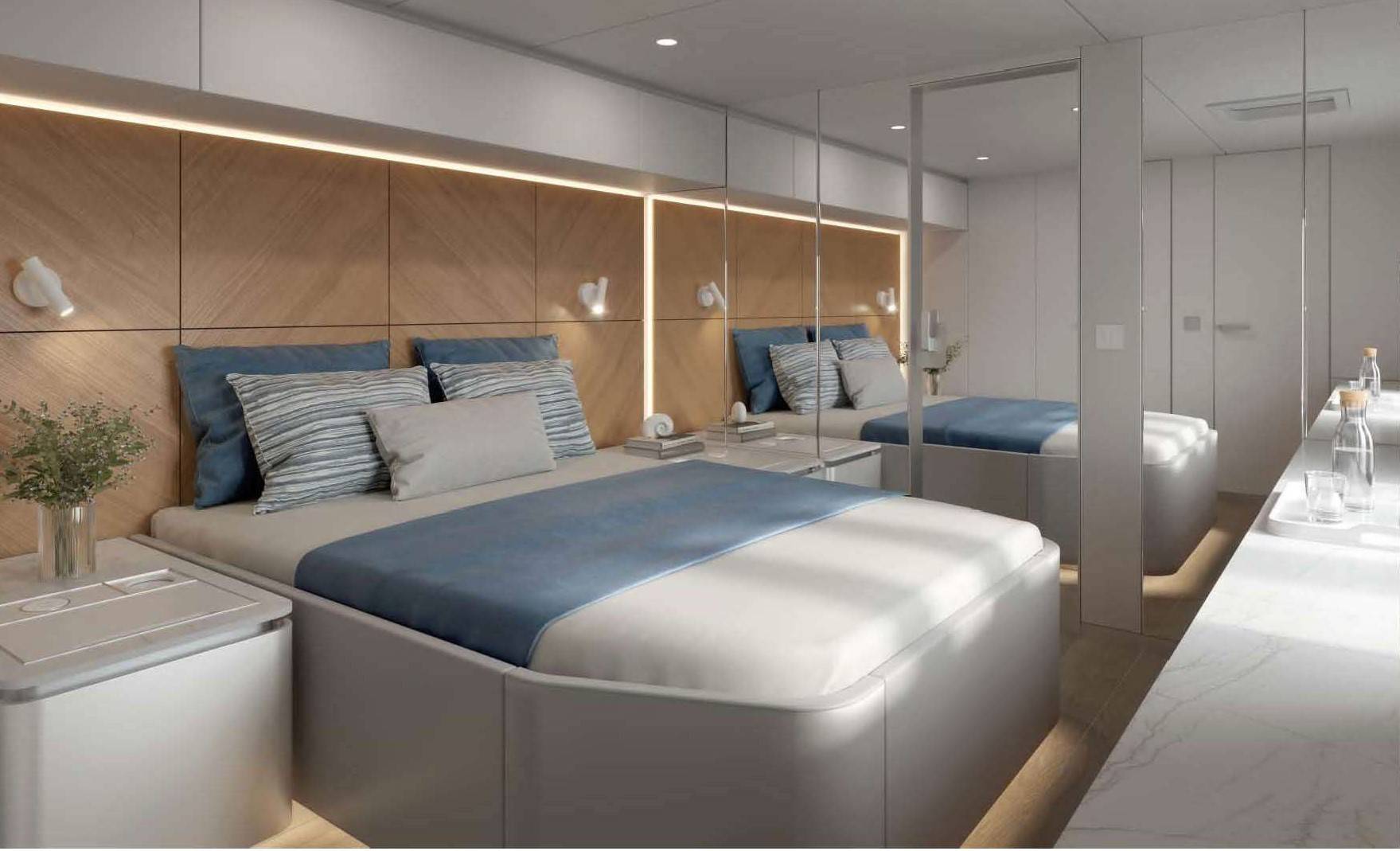 Ohana sleeps up to ten guests in five deluxe, king-size ensuite cabins. The king beds are all floor-level berths with full-walk around access. Each cabin boasts a mirror-covered wall to allow for maximum light during the day and lend an airy vibe to the comfortable cabins. Five spacious heads are ensuite featuring spa-like, waterfall shower heads and full-size commodes. Cabins each have their own temperature control and TVs.