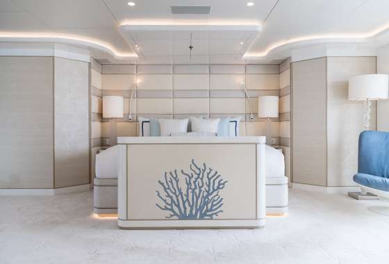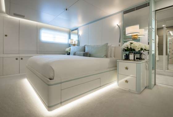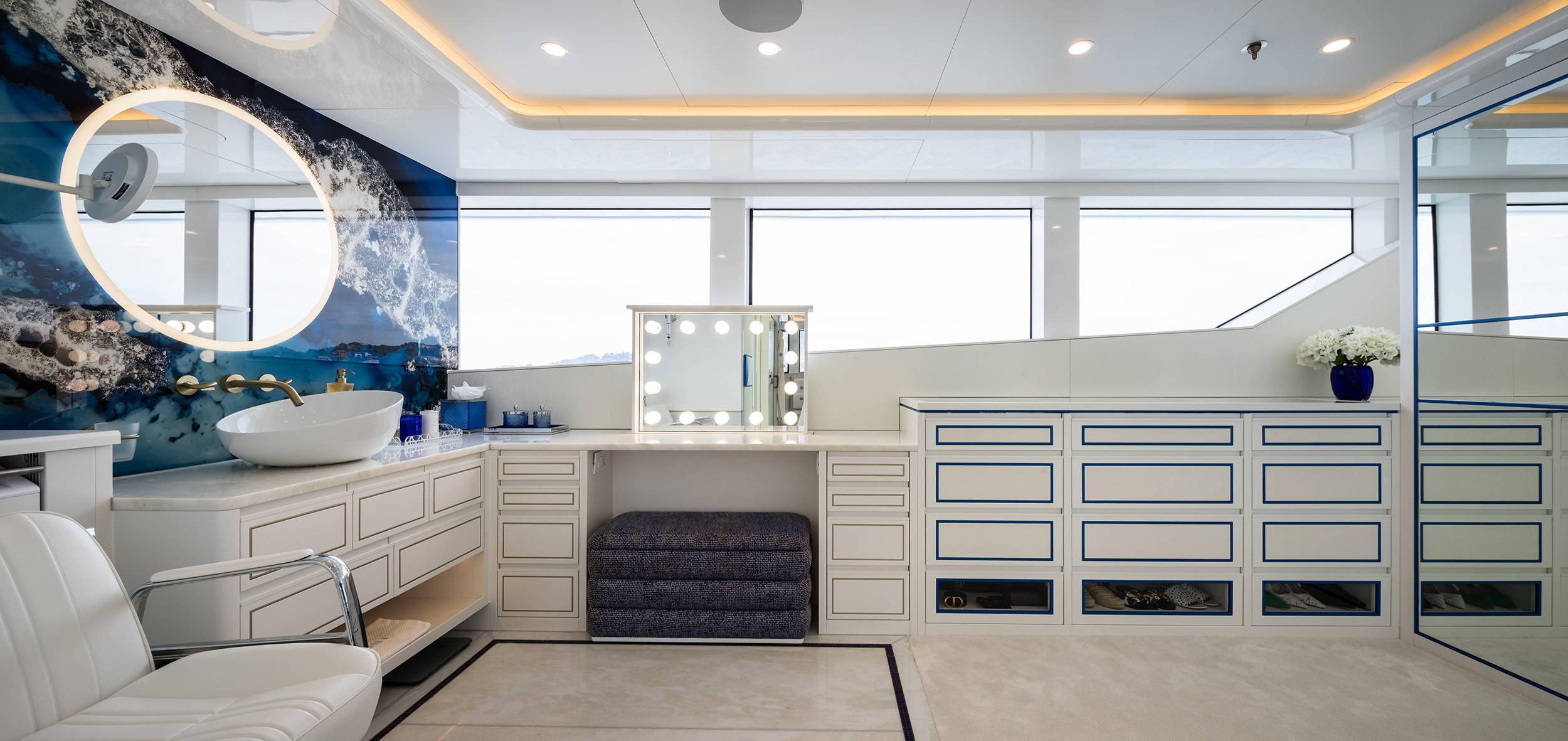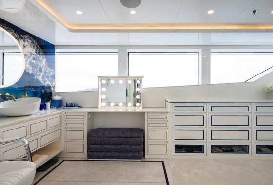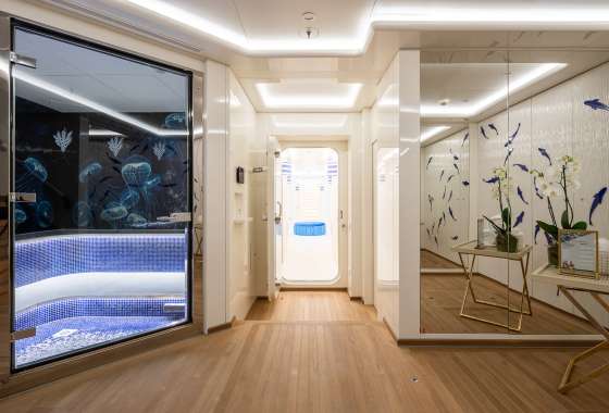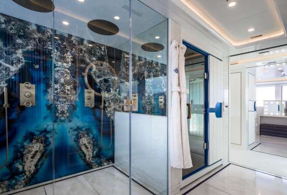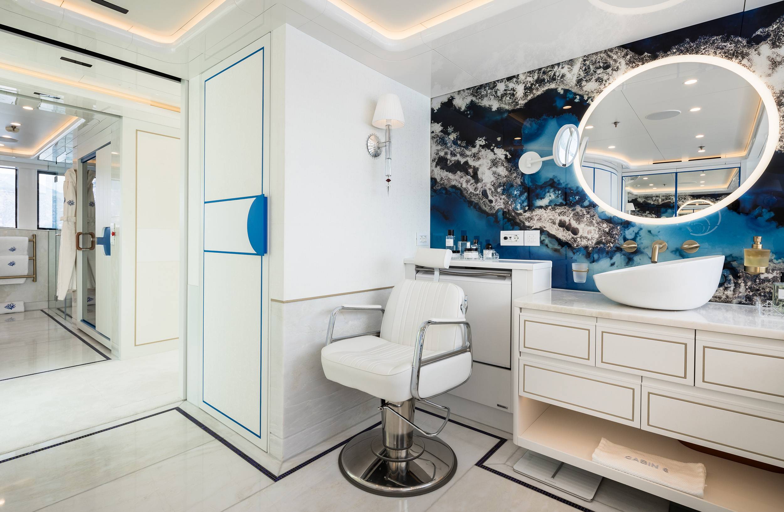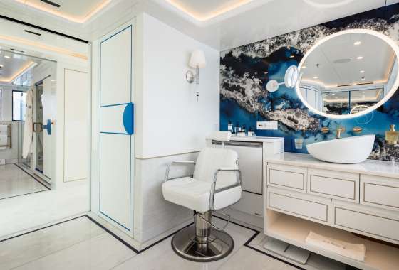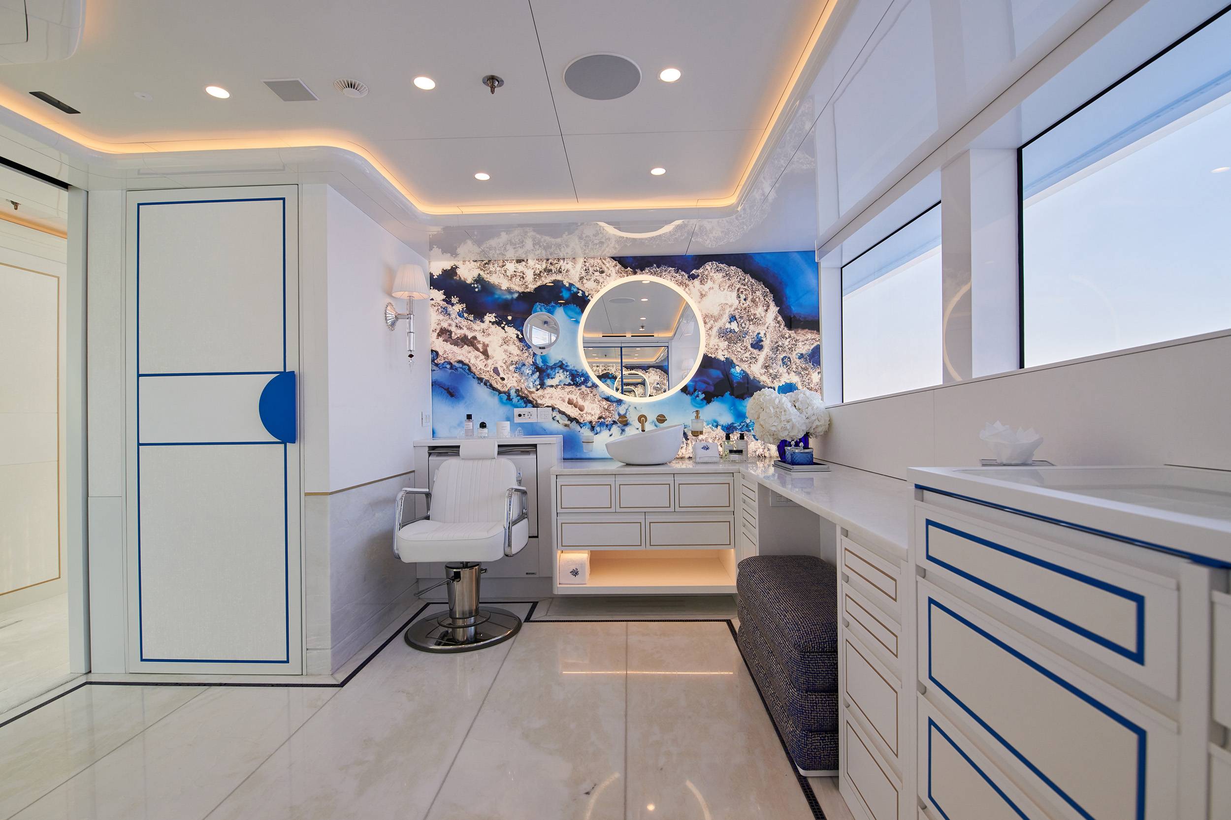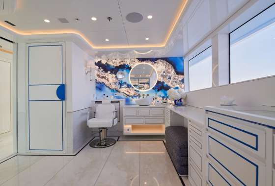 The master bedroom treatment room is equipped with an infrared sauna, a hair salon, luxurious bathrooms, and an onboard beauty therapist for massages, manicures, pedicures, and facials.