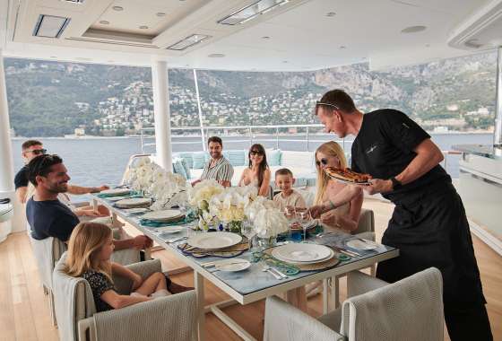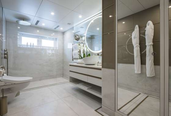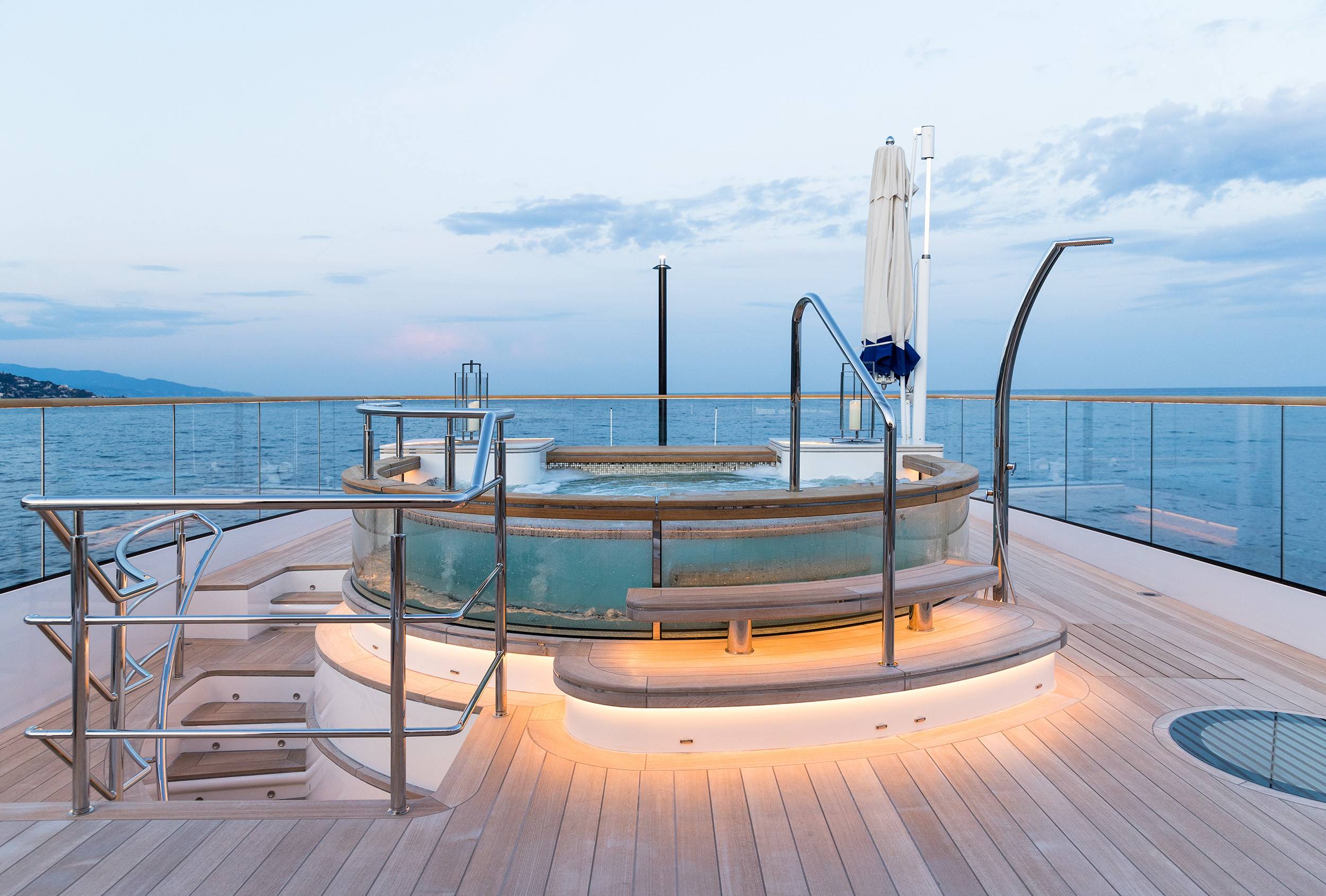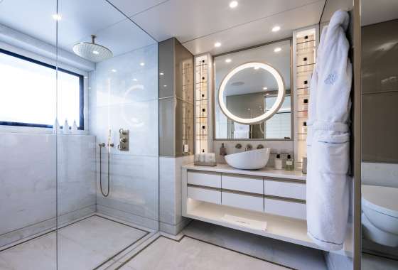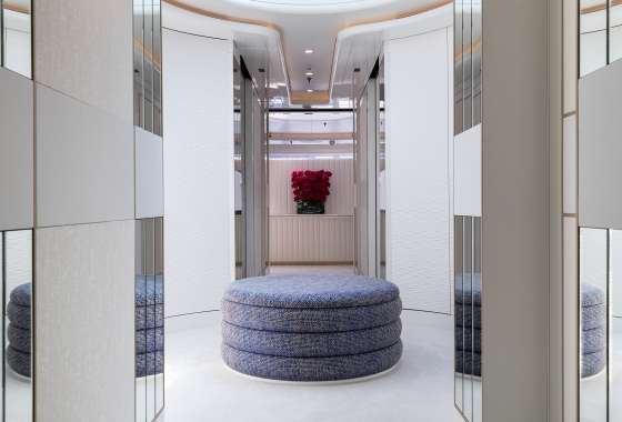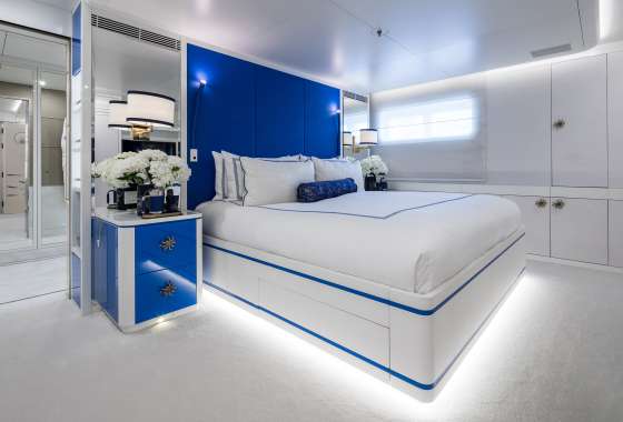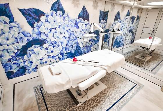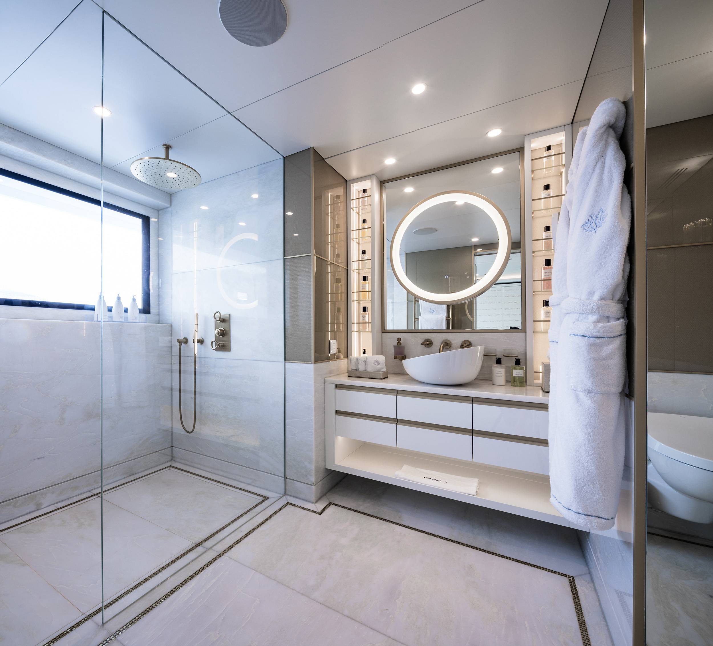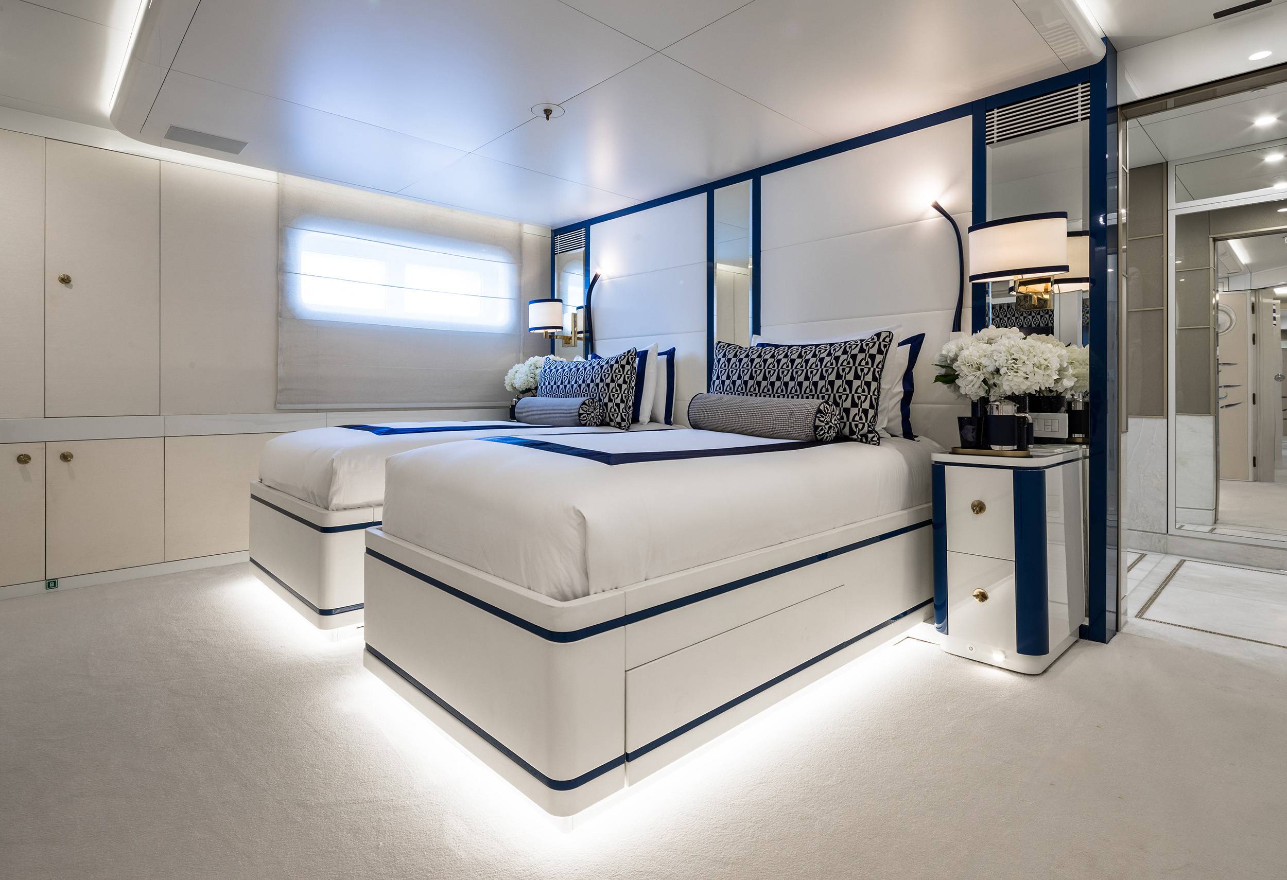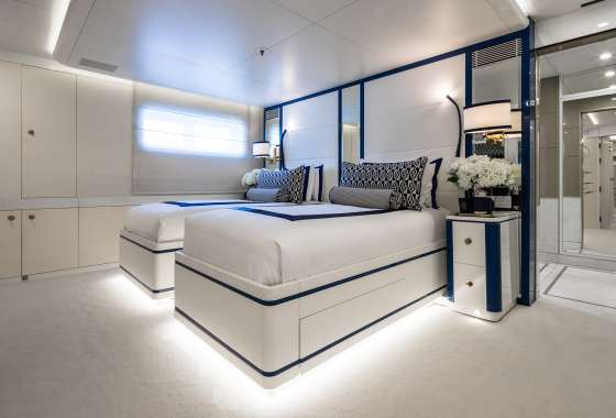 The master bedroom treatment room is equipped with an infrared sauna, a hair salon, luxurious bathrooms, and an onboard beauty therapist for massages, manicures, pedicures, and facials.