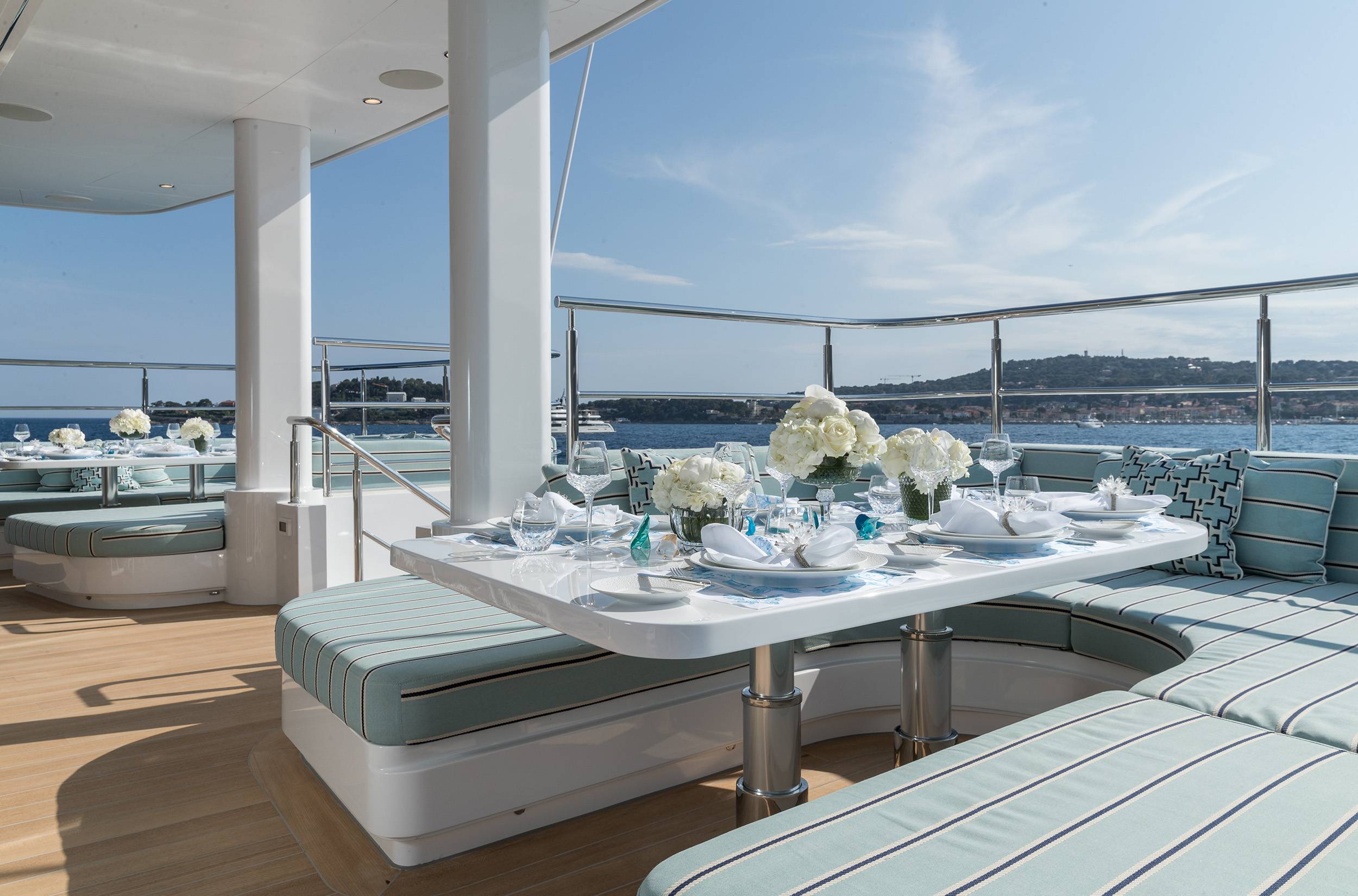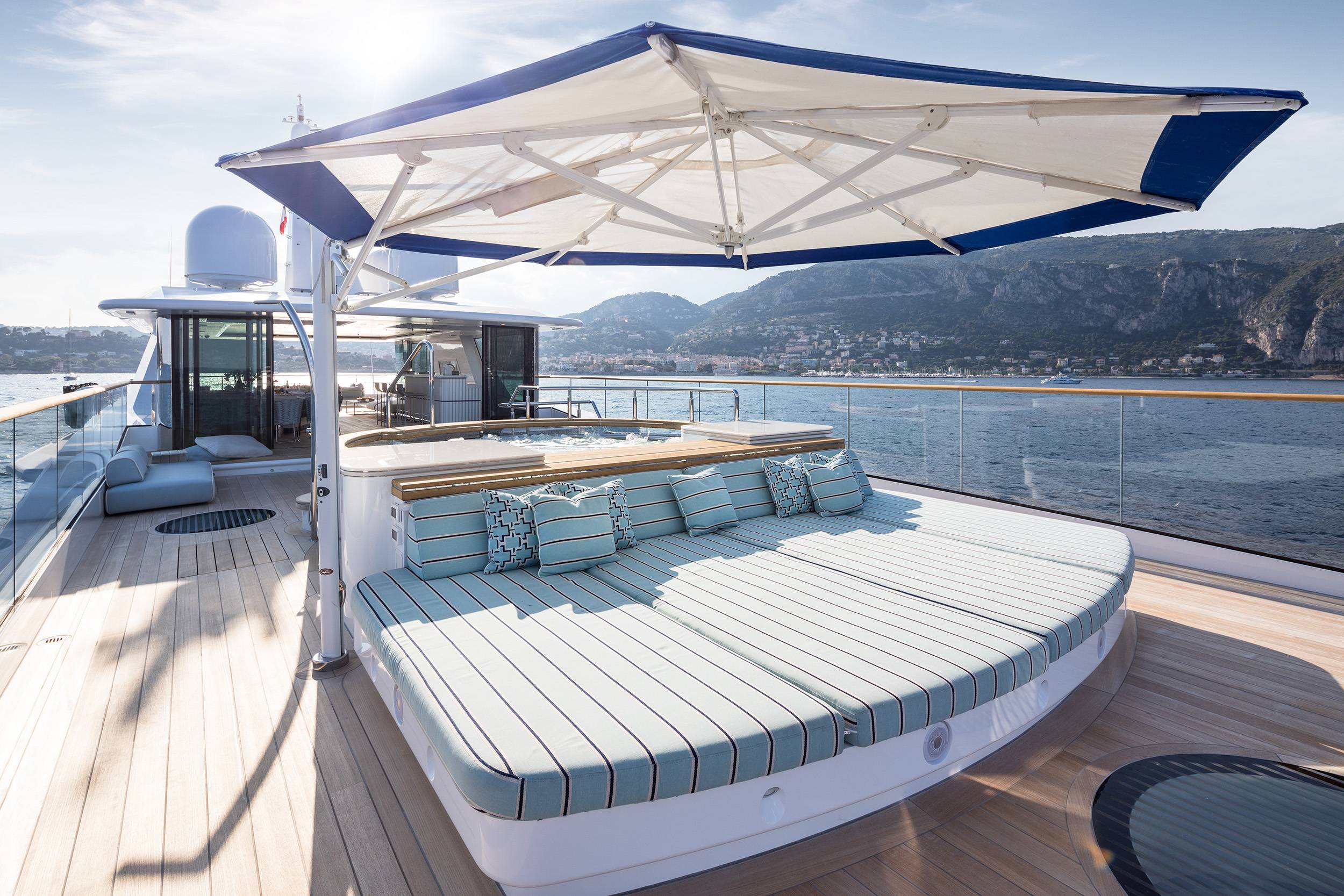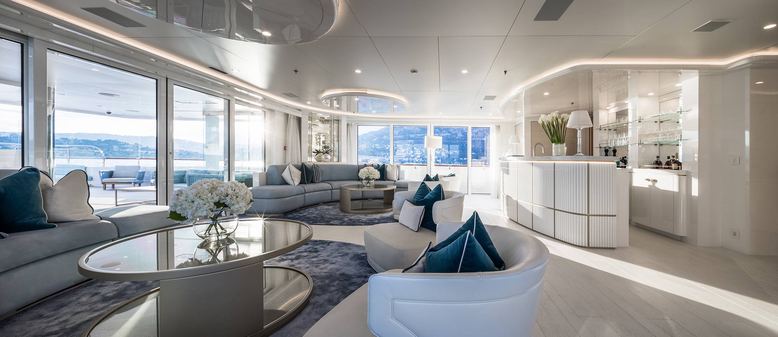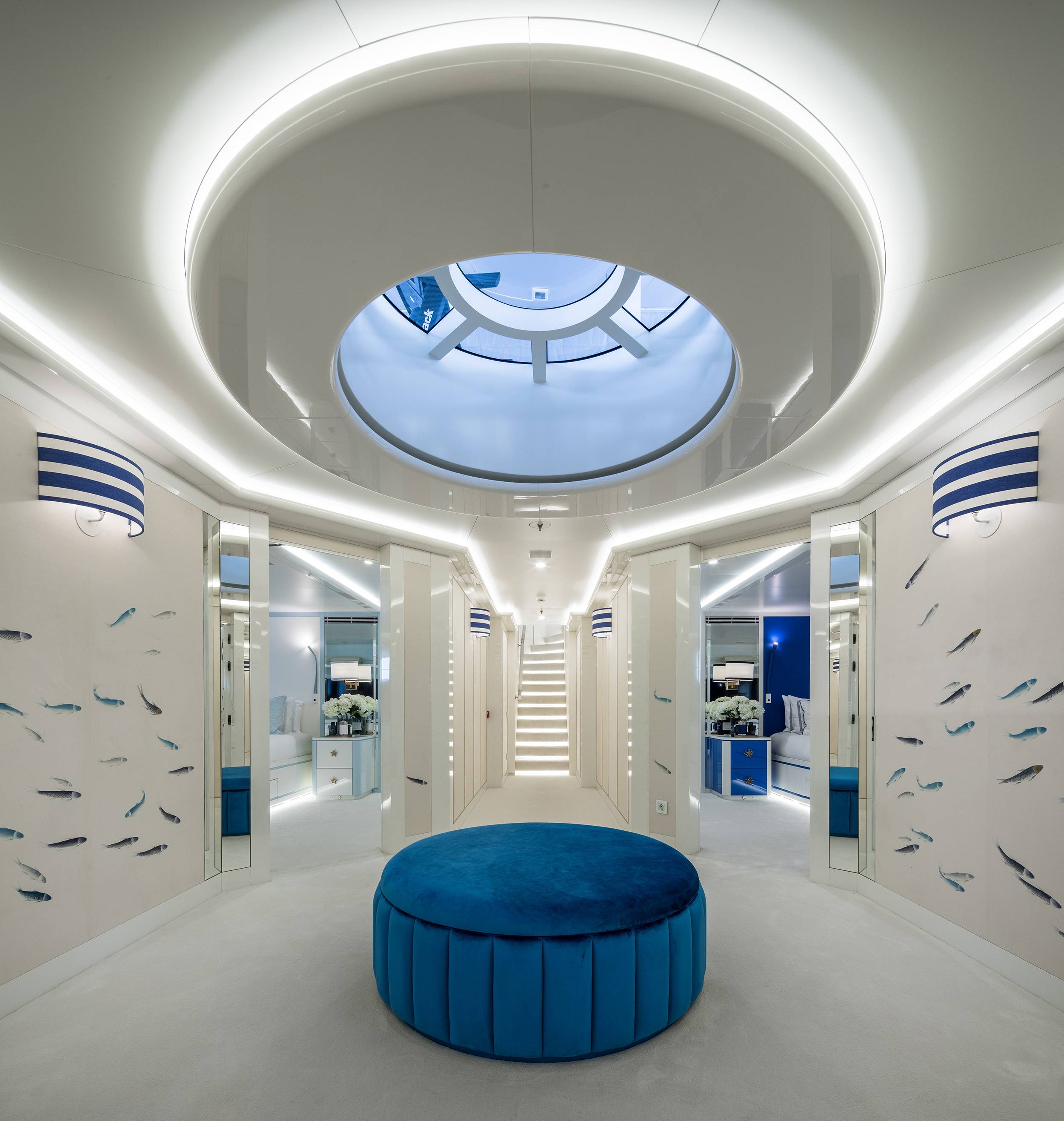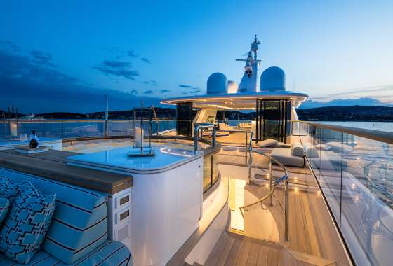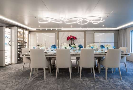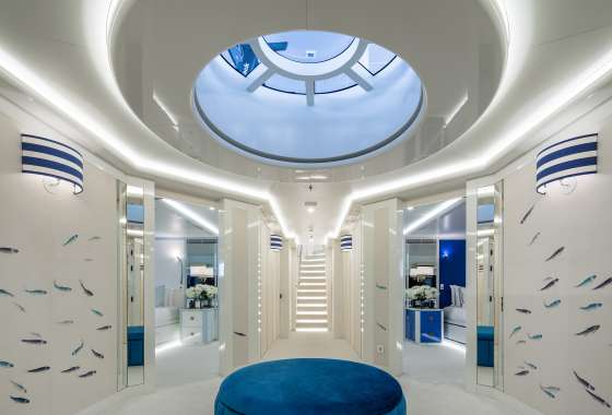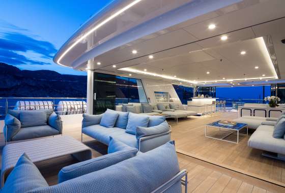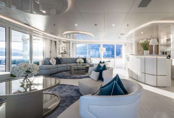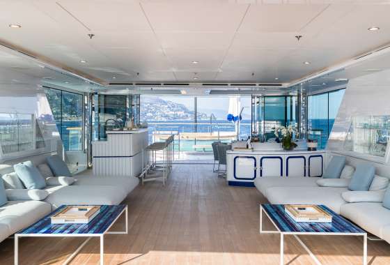 The yacht offers exceptional entertainment areas, including a full-service bar, dining spaces, an observation area, an indoor sunbed with a retractable roof, and an outdoor area convertible into a disco. The Master Bedroom features panoramic views, skylights, en-suite facilities, and a private lounge. Additionally, the yacht includes a VIP Suite with a private lounge and four lavish guest bedrooms.