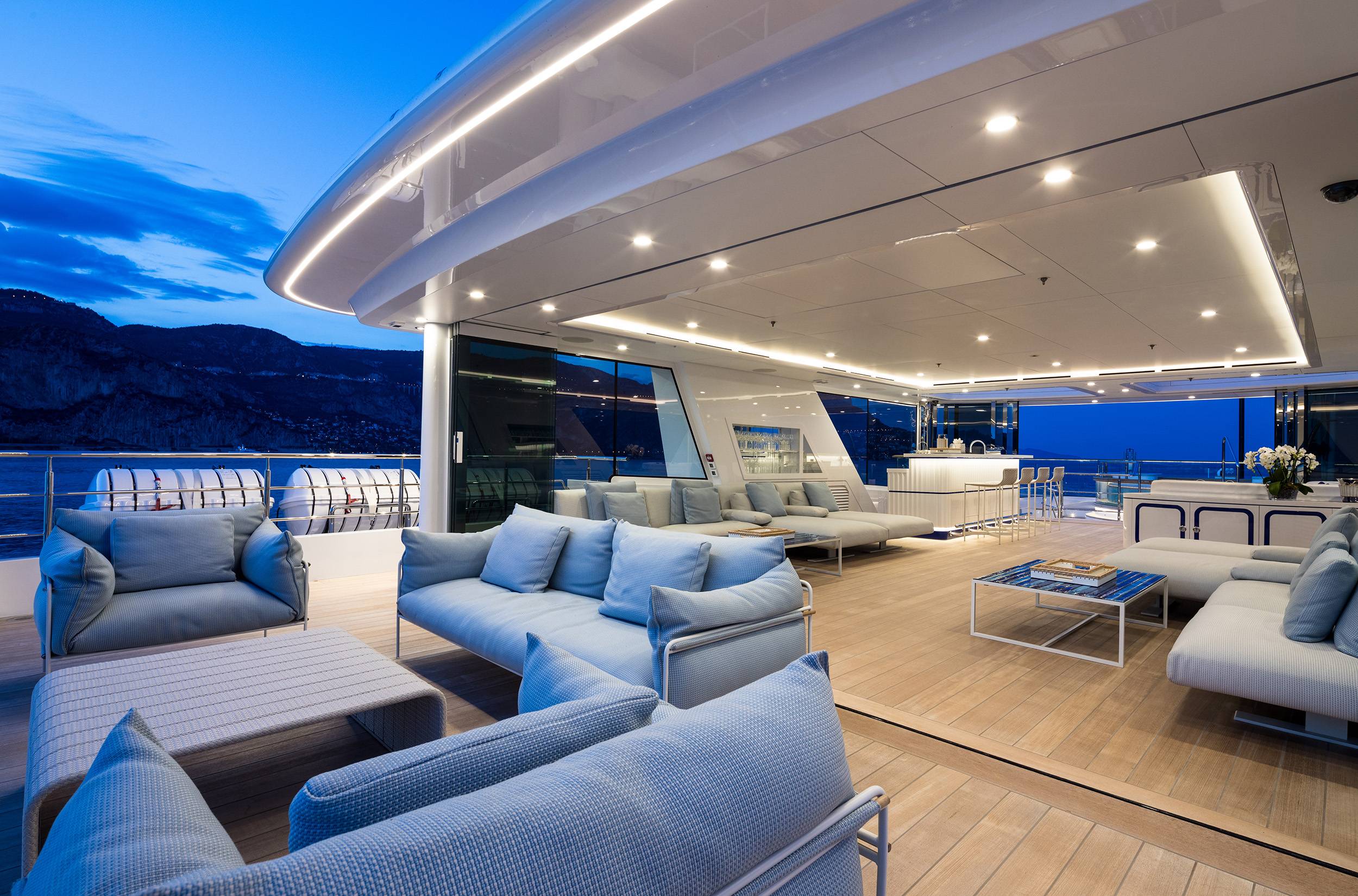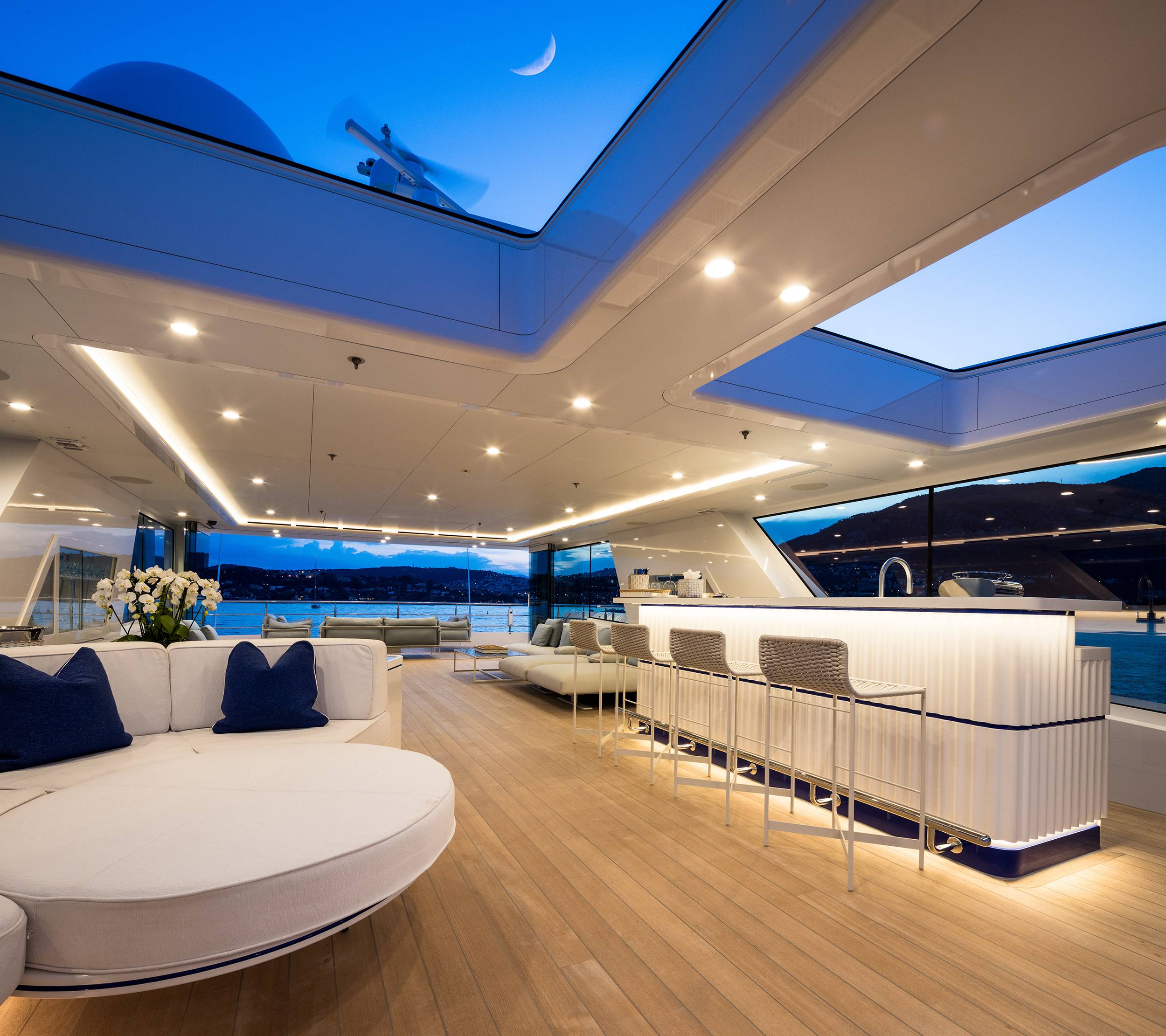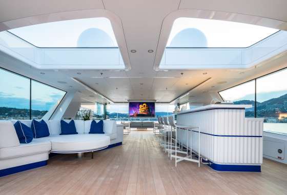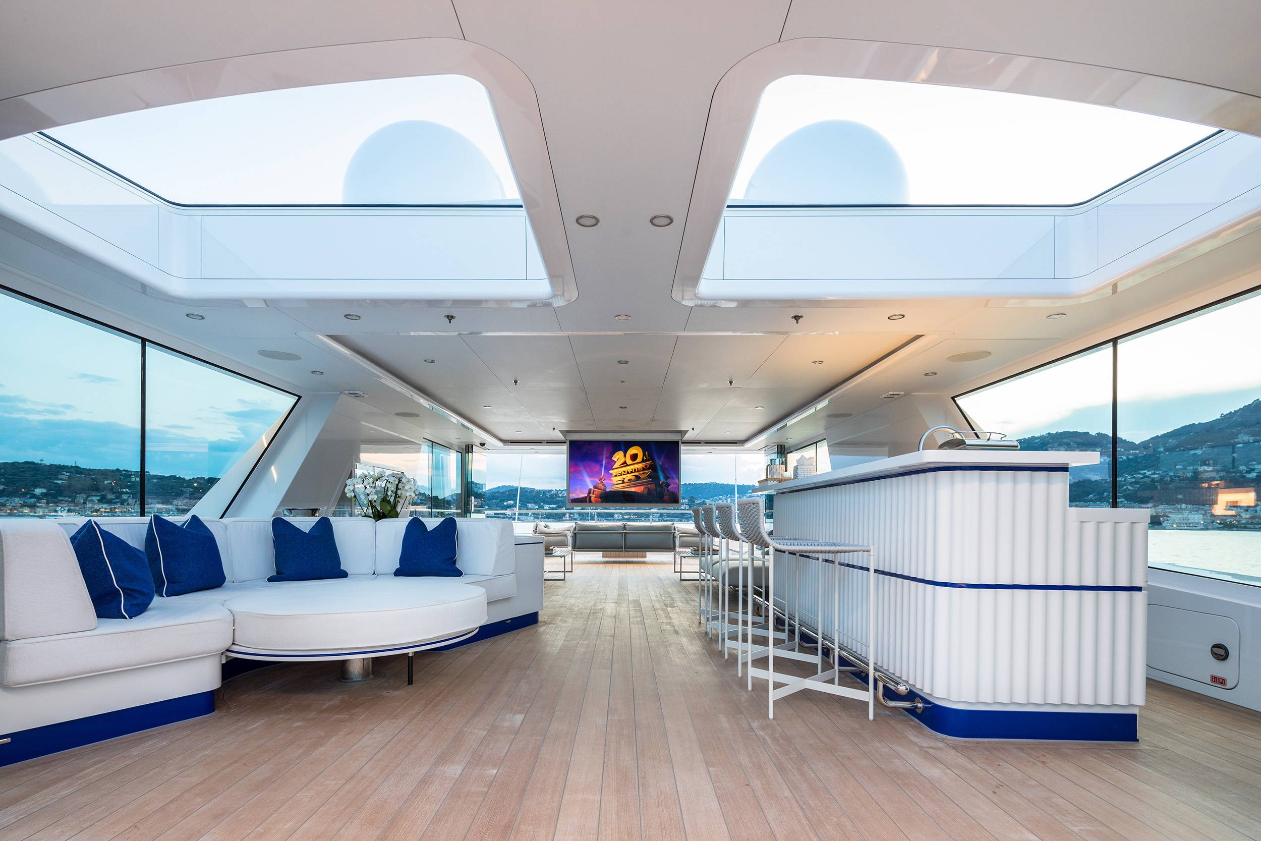 Sundeck with open, flexible space, a full-service bar, round dining table, aft balcony, observation area, sound system, electric skylight roof, and a retractable 85-inch TV, making it perfect for events, conferences, and cinema nights.