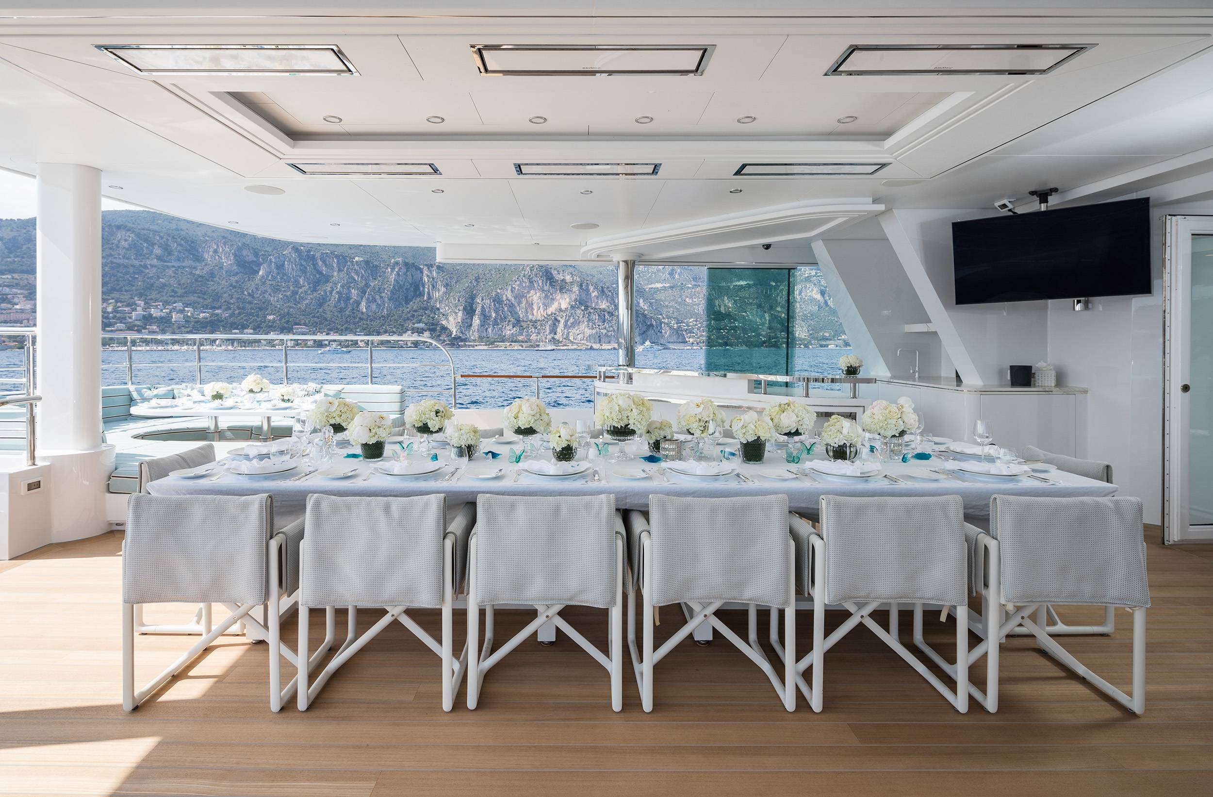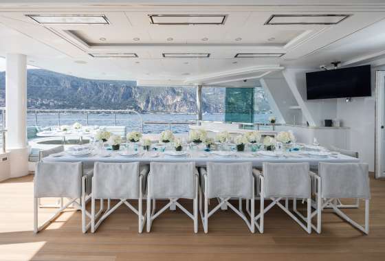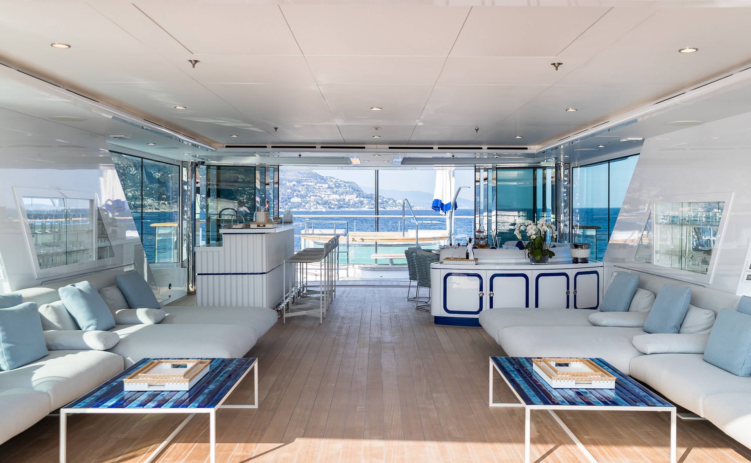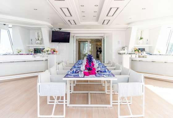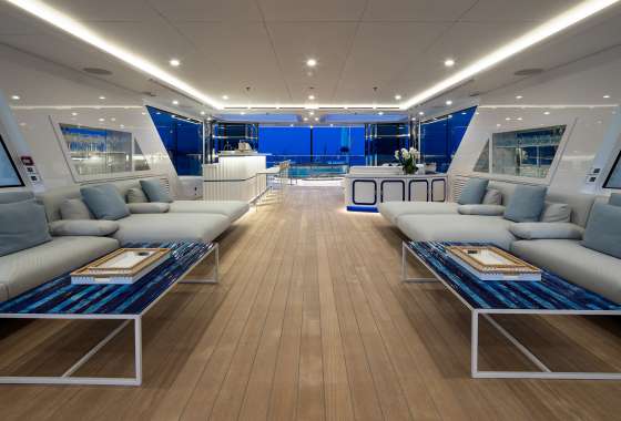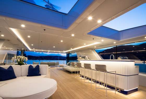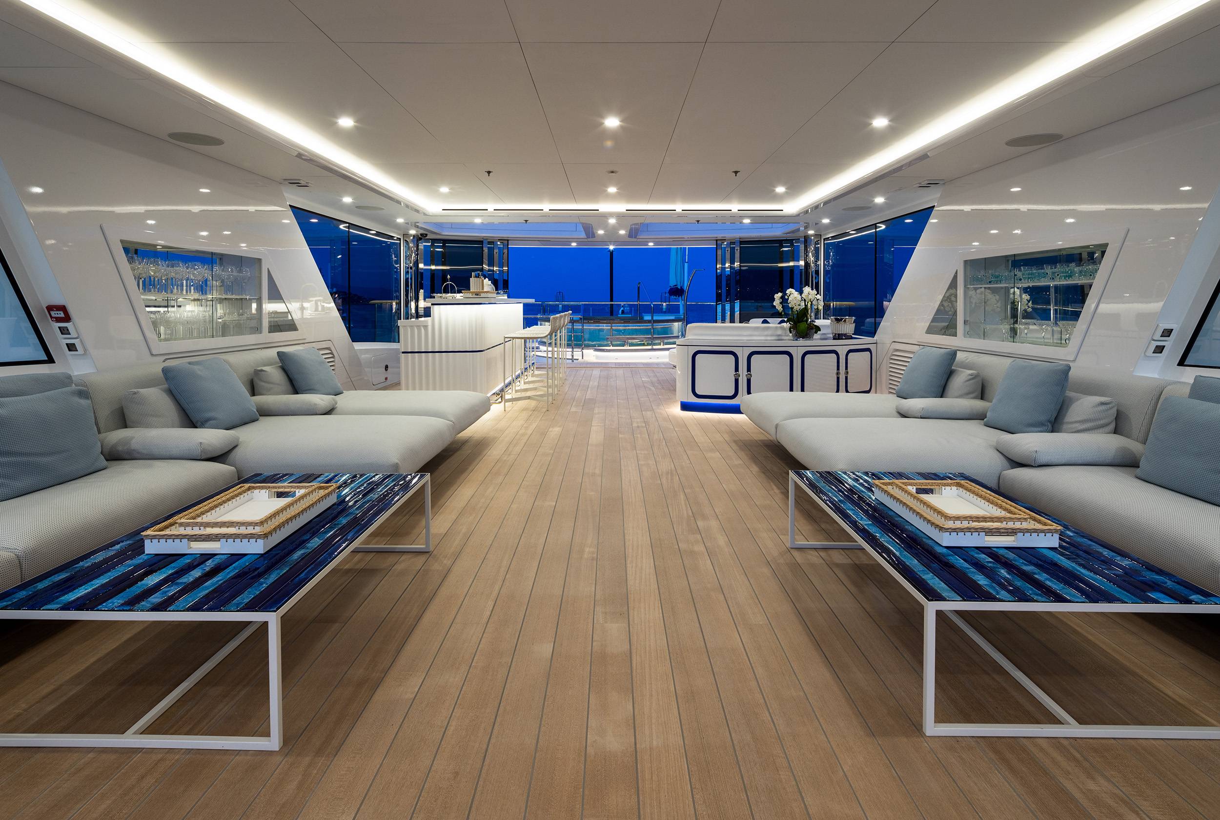 Sundeck with open, flexible space, a full-service bar, round dining table, aft balcony, observation area, sound system, electric skylight roof, and a retractable 85-inch TV, making it perfect for events, conferences, and cinema nights.