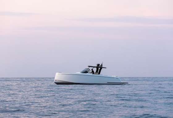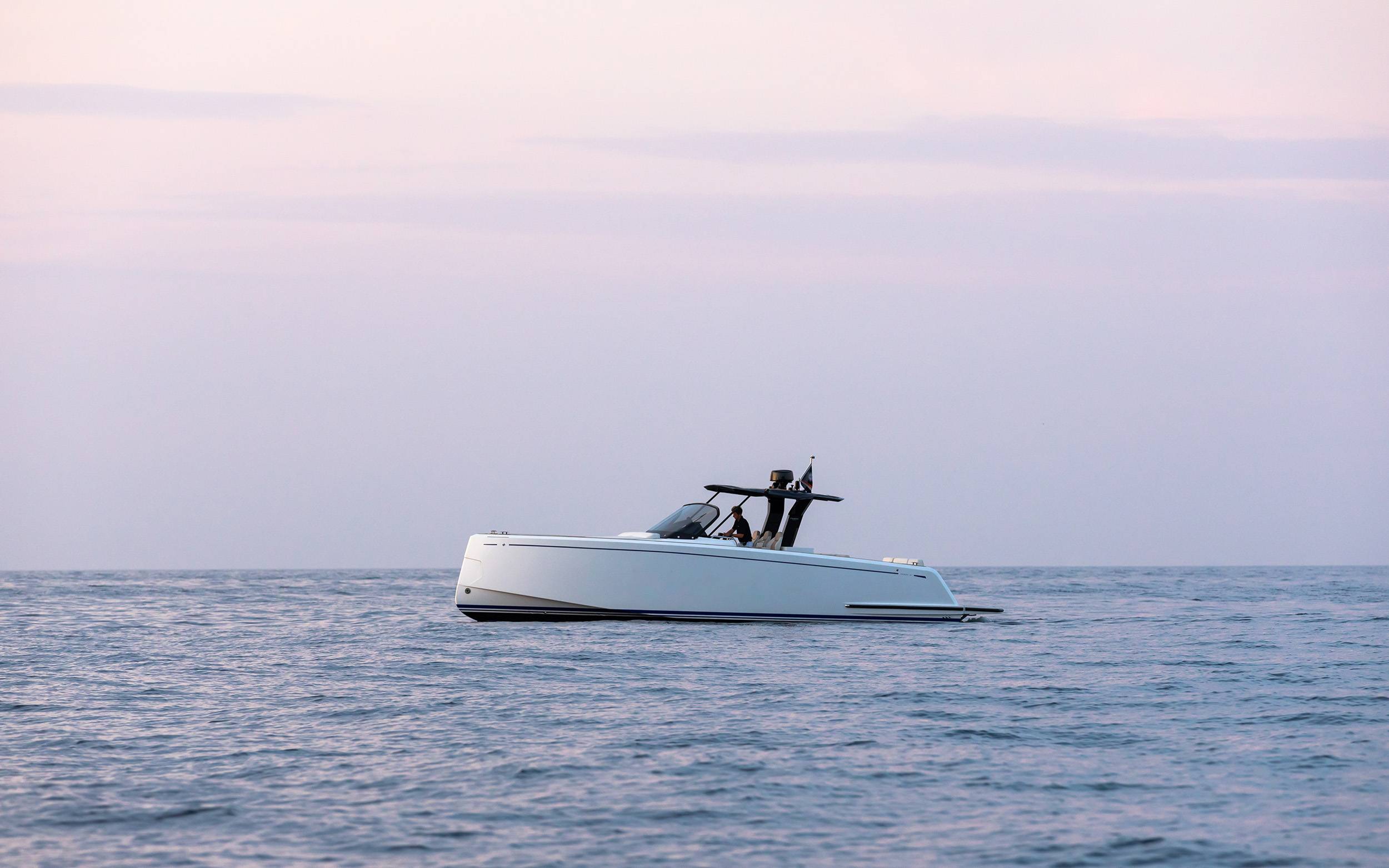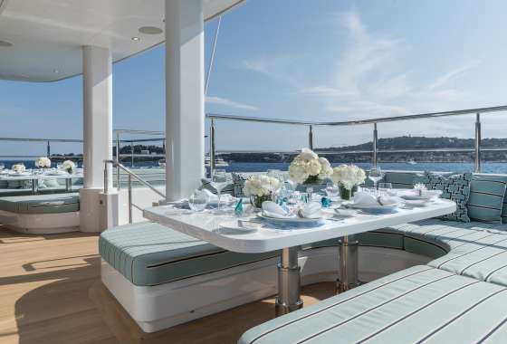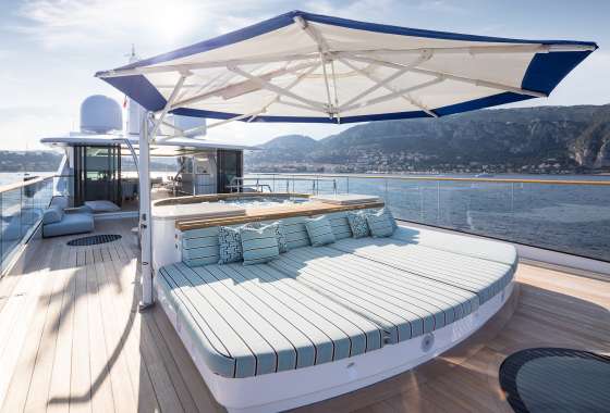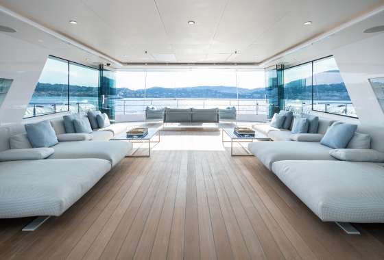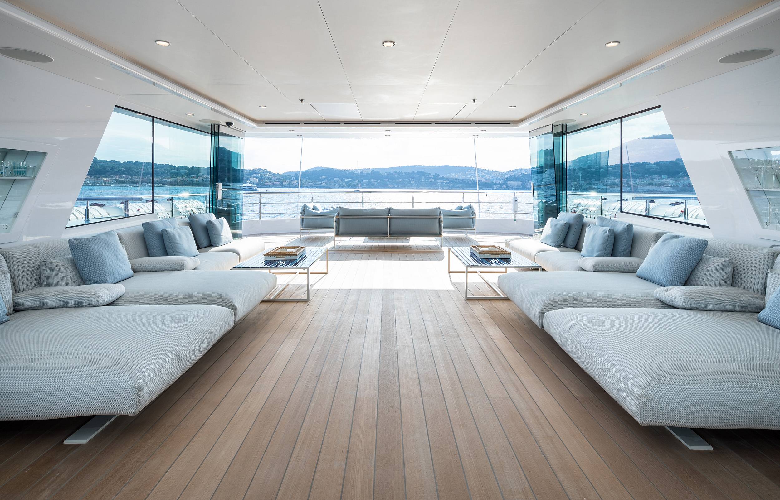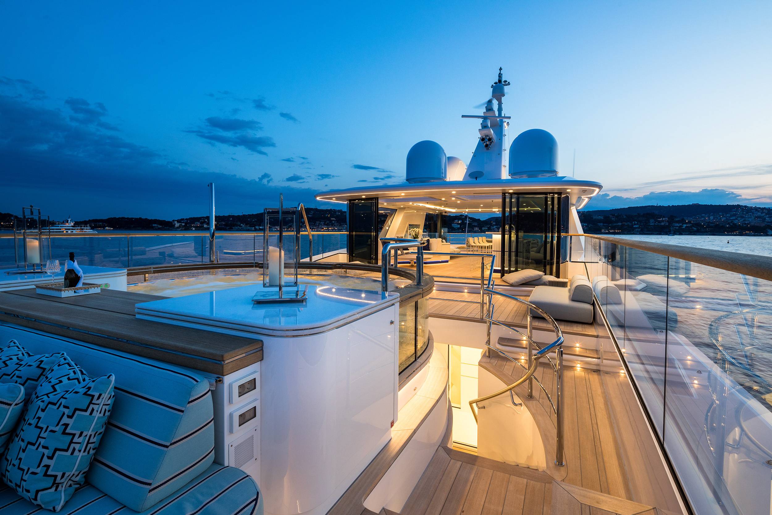 Sundeck with open, flexible space, a full-service bar, round dining table, aft balcony, observation area, sound system, electric skylight roof, and a retractable 85-inch TV, making it perfect for events, conferences, and cinema nights.