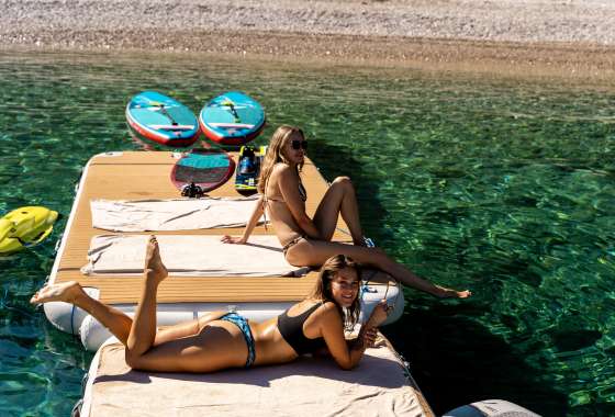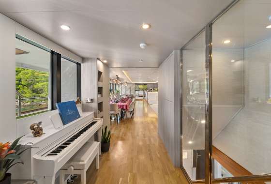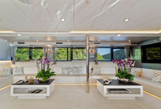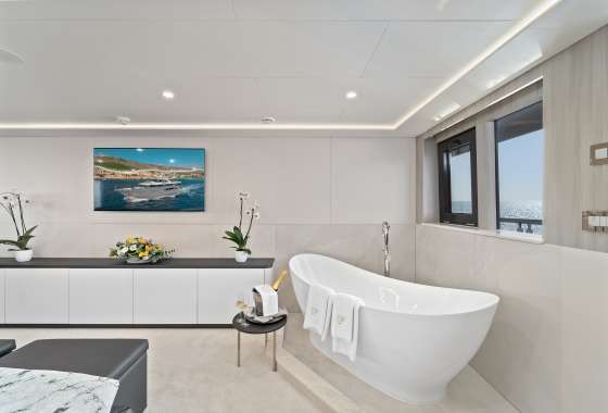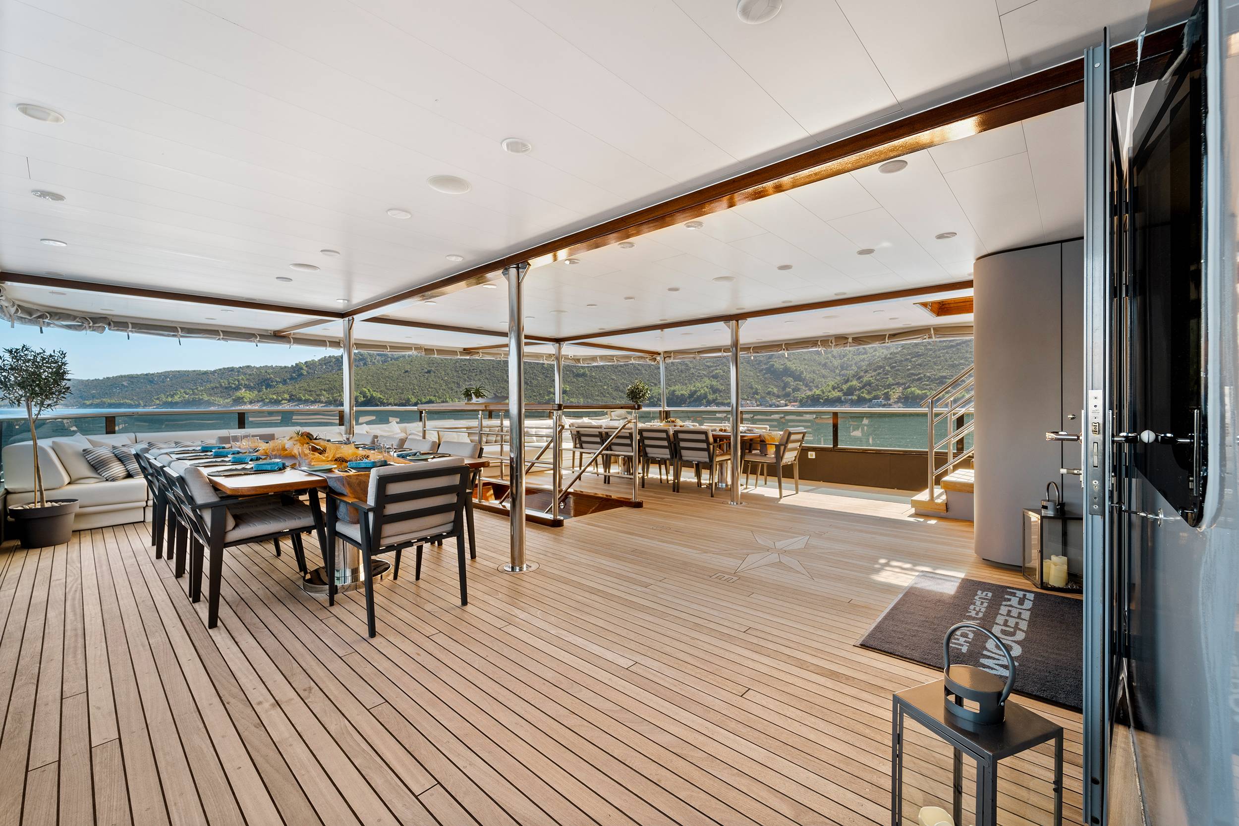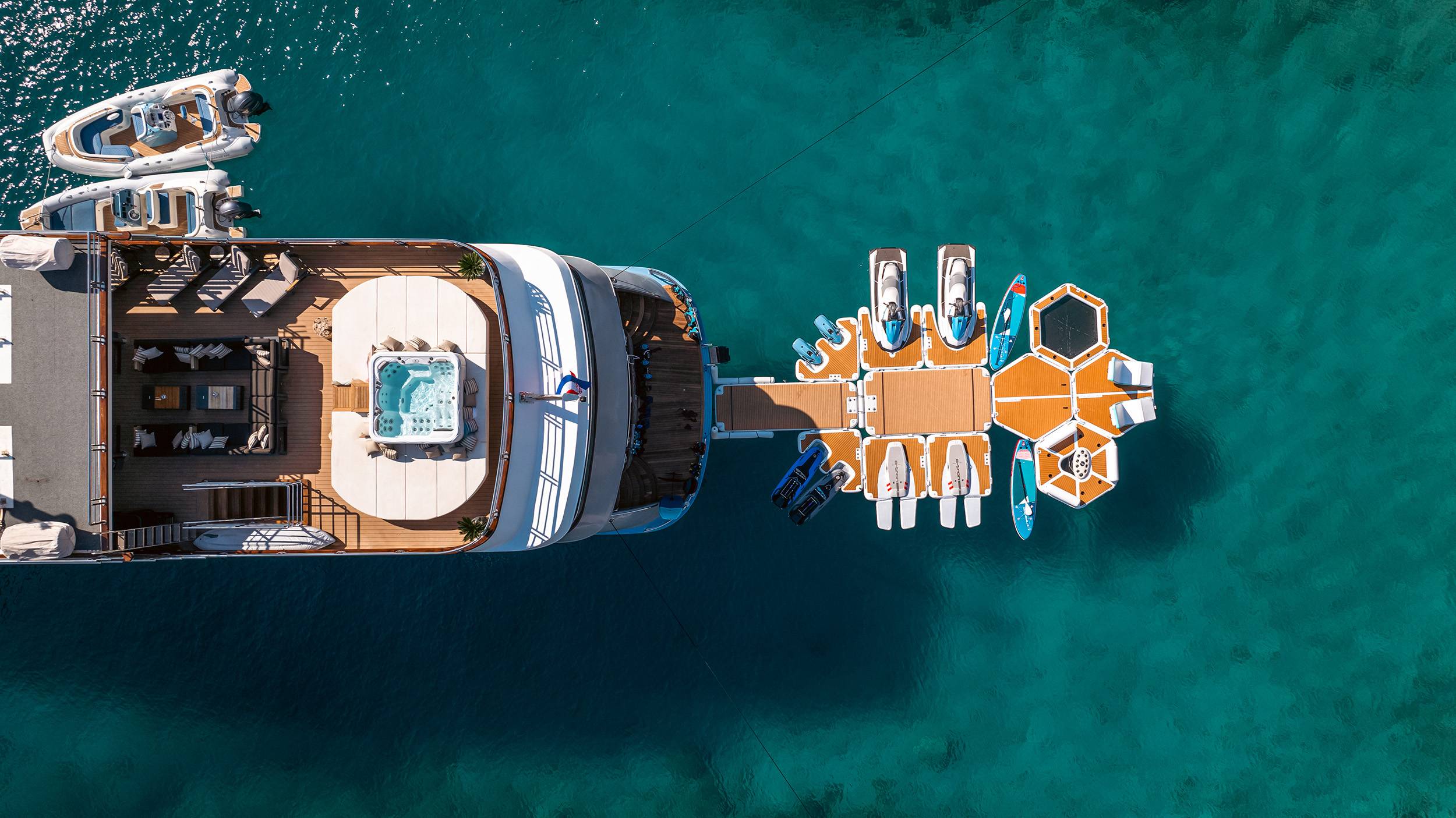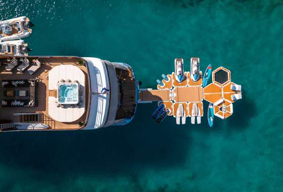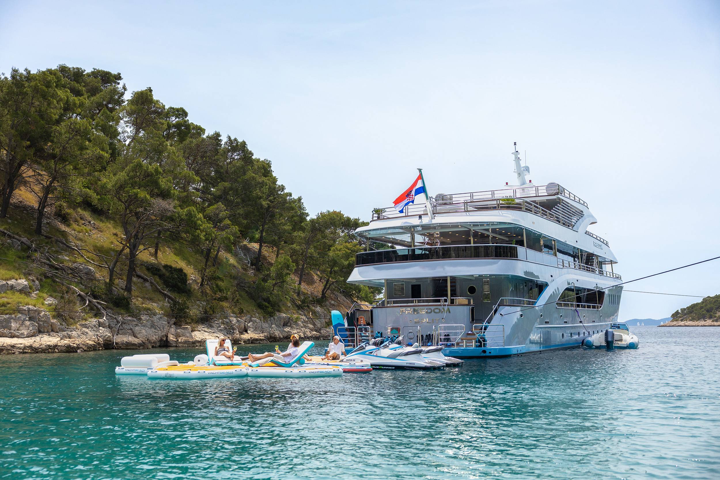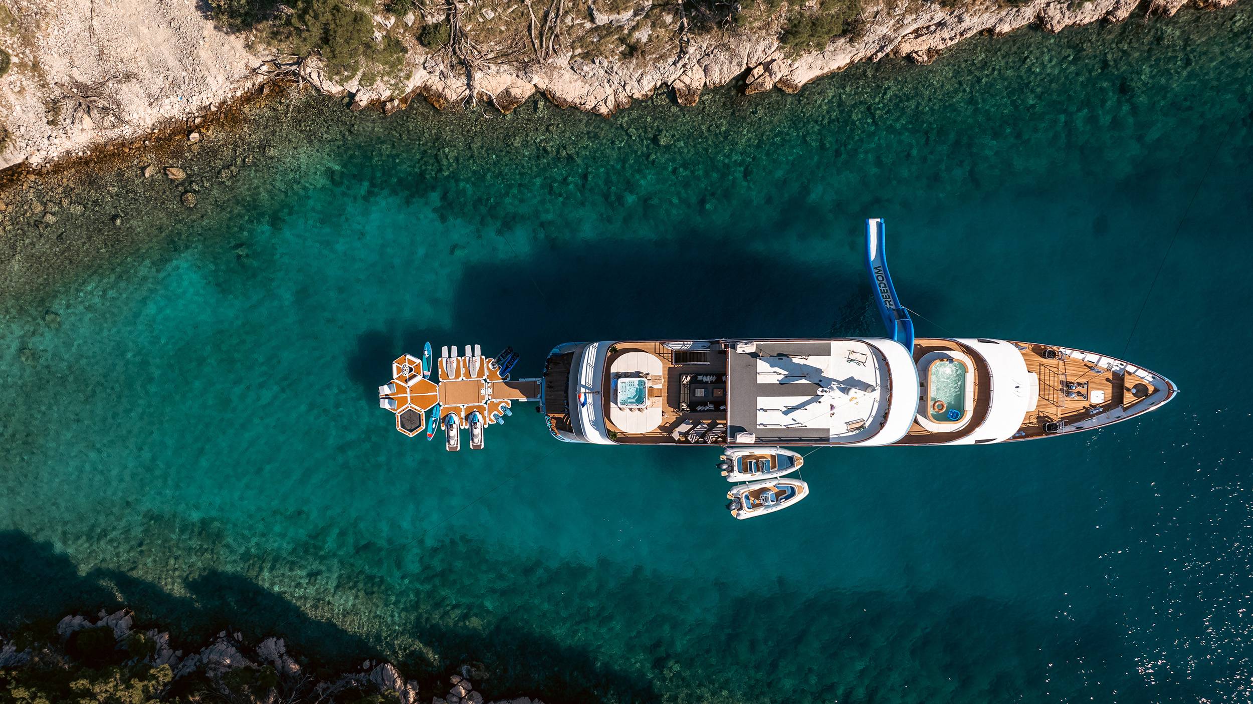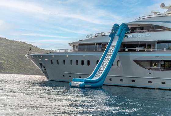 For guests who love water activities, FREEDOM features 2 jet skis, 2 SeaBobs, water skis, a wakeboard, a tube ride, a Ringo ride, 4 paddleboards, 2 electric paddleboards Lamp , 2 E-foils, a canoe, and a waterslide to choose from. FREEDOM also features a cinema and video gaming room, a sauna with a large shower, two open bars, and a spacious indoor dining area.