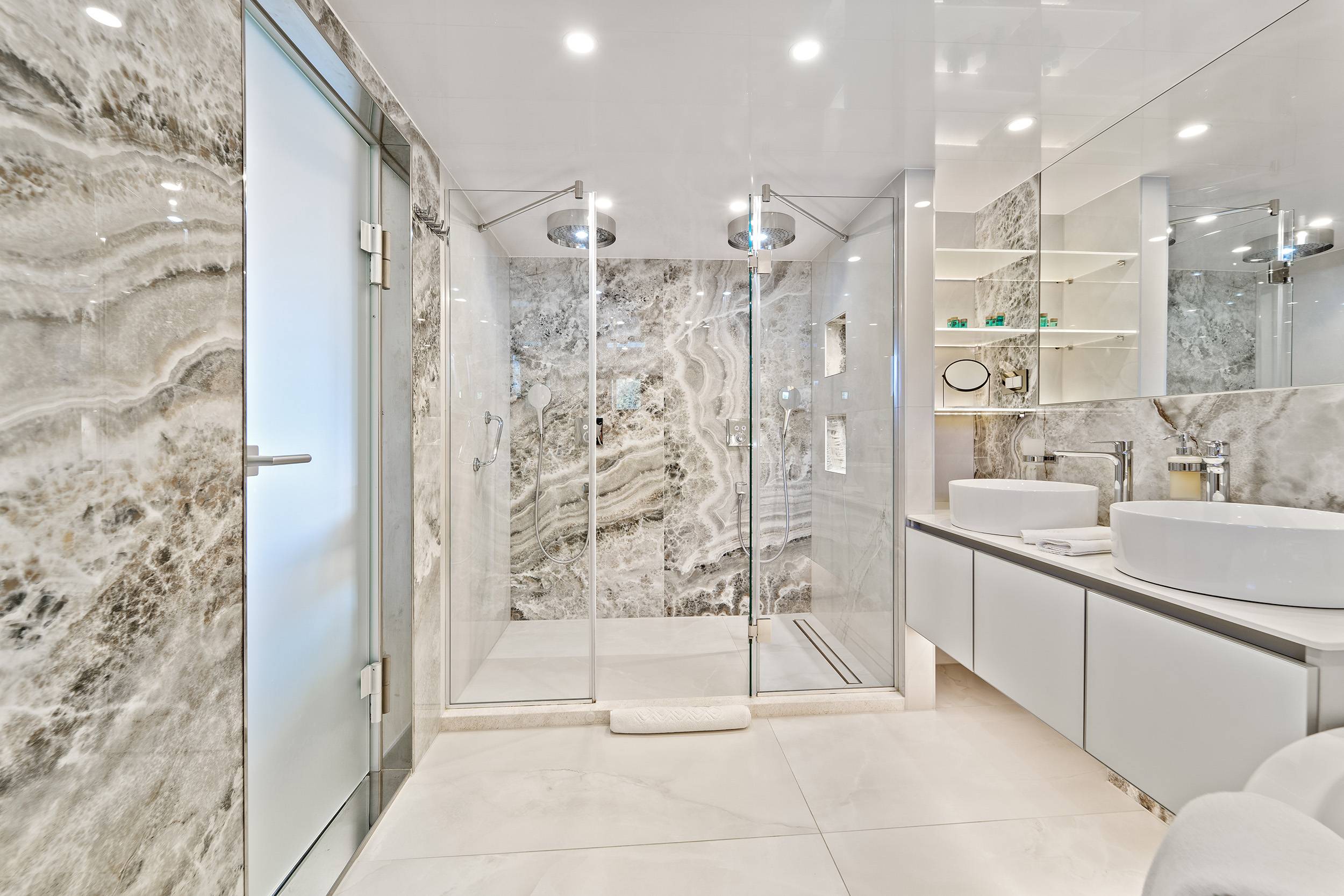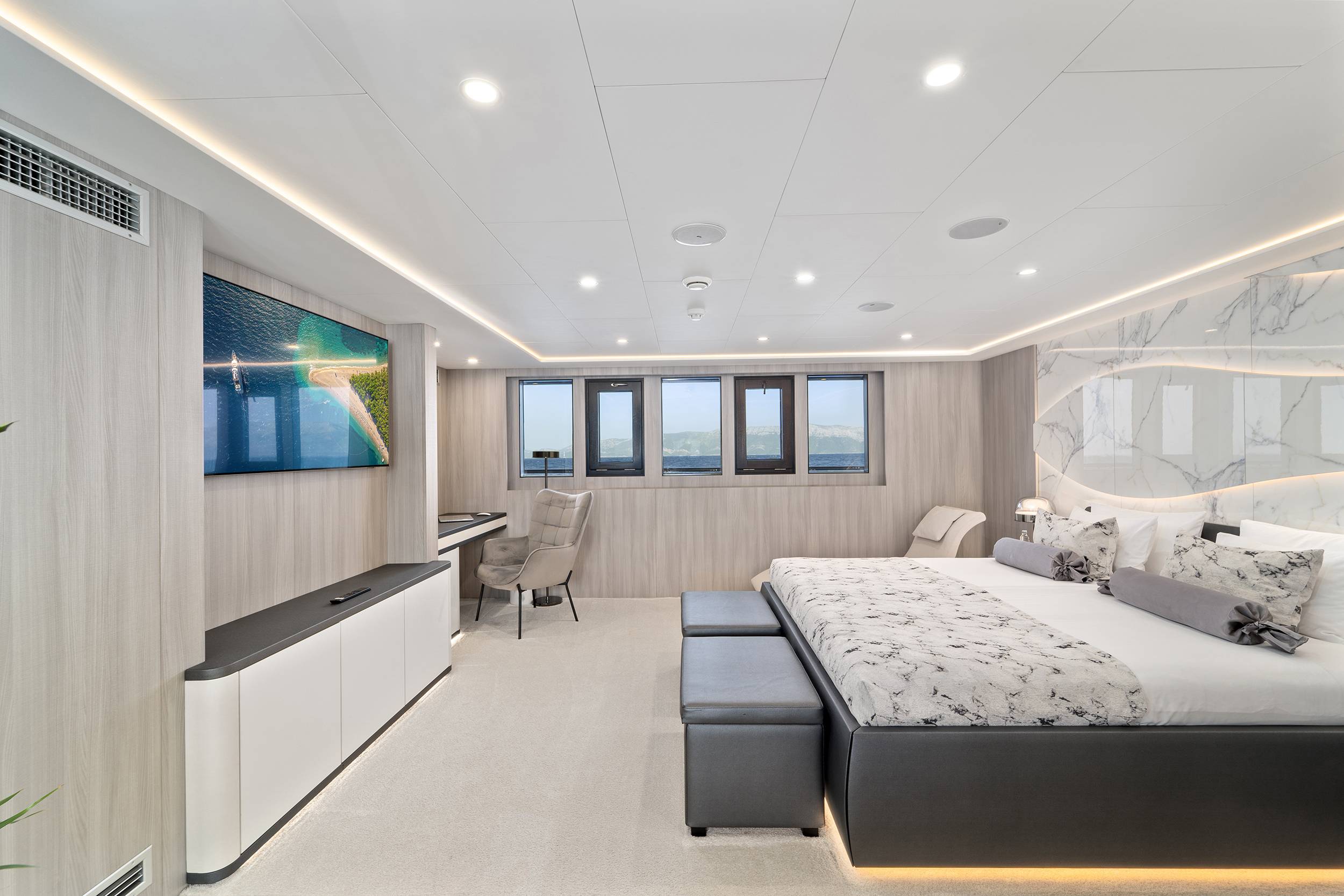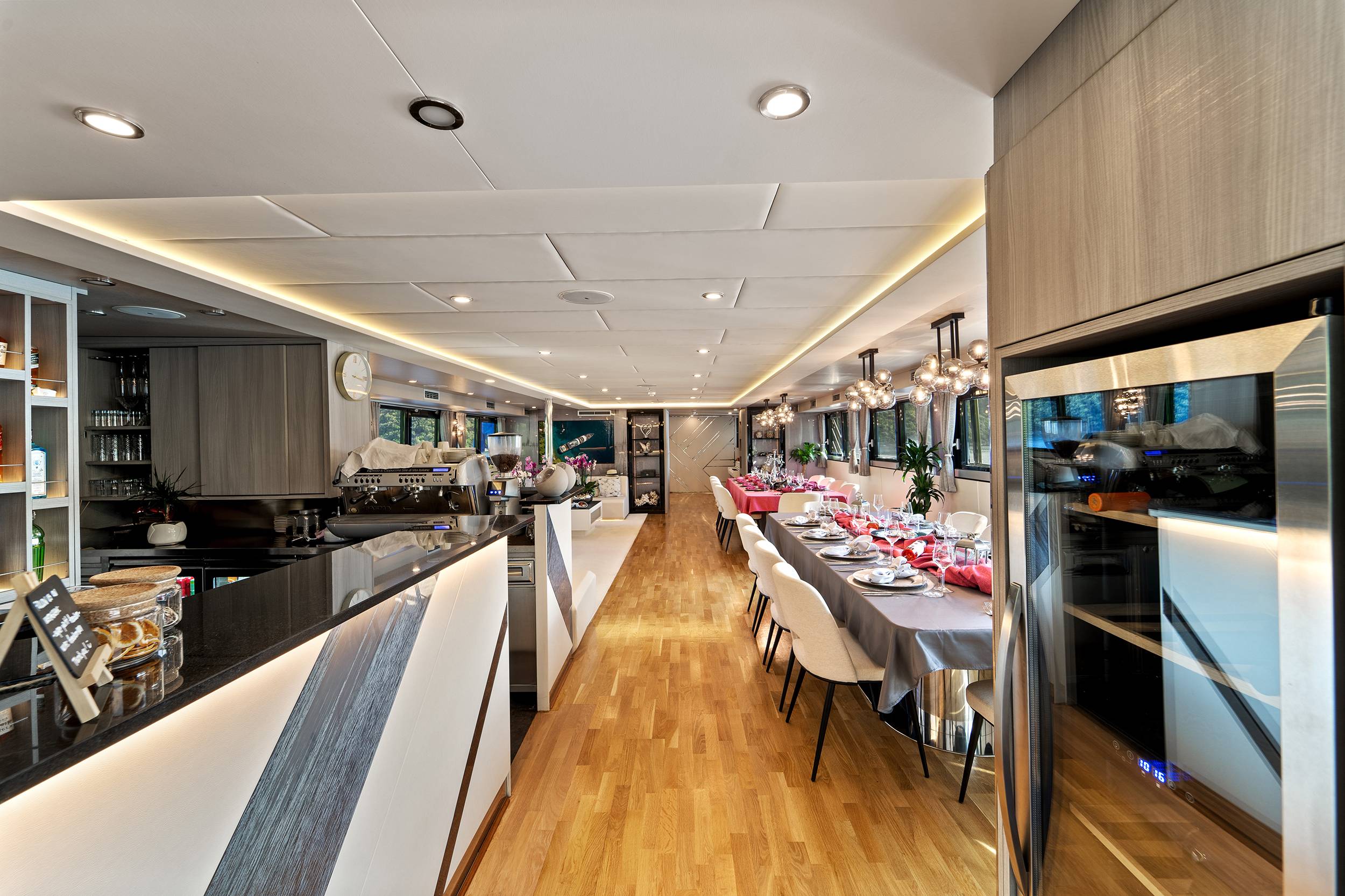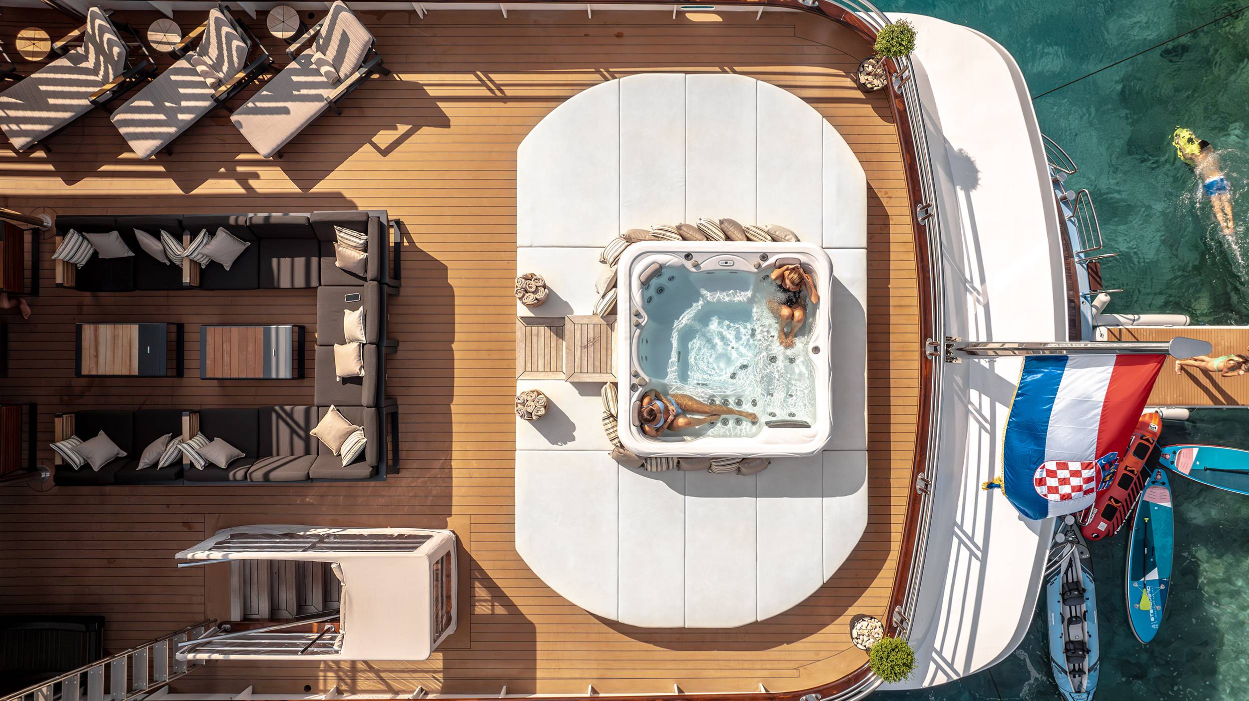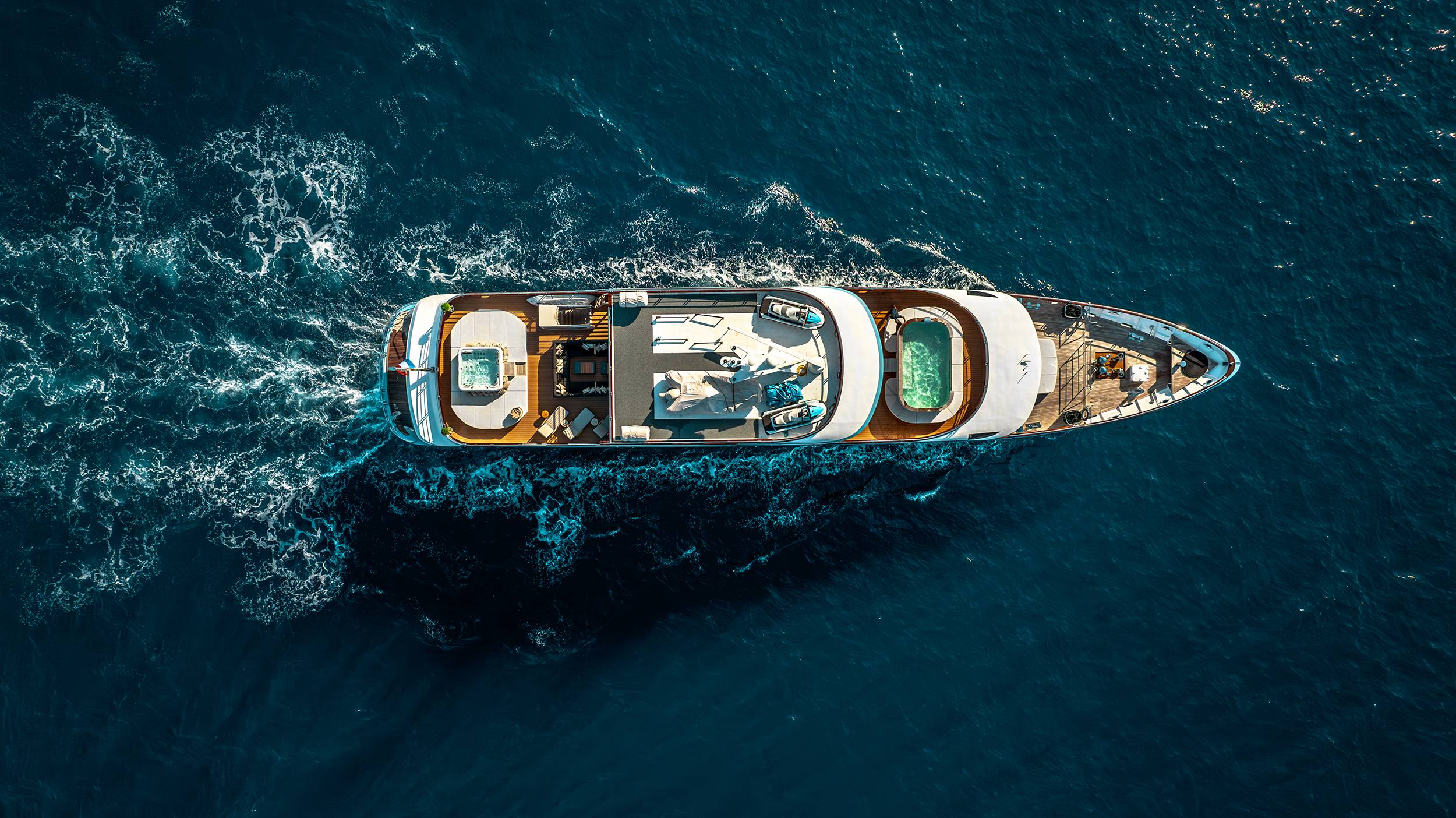 For guests who love water activities, FREEDOM features 2 jet skis, 2 SeaBobs, water skis, a wakeboard, a tube ride, a Ringo ride, 4 paddleboards, 2 electric paddleboards Lamp , 2 E-foils, a canoe, and a waterslide to choose from. FREEDOM also features a cinema and video gaming room, a sauna with a large shower, two open bars, and a spacious indoor dining area.