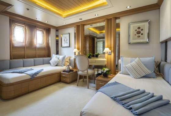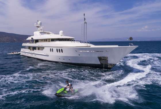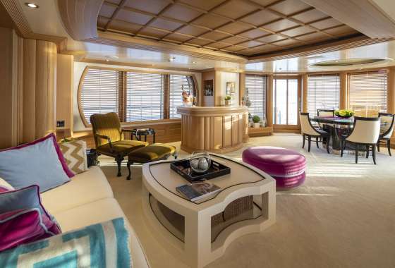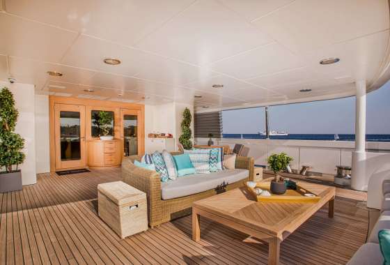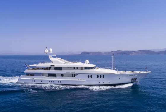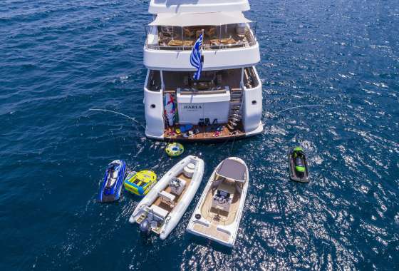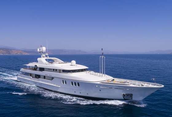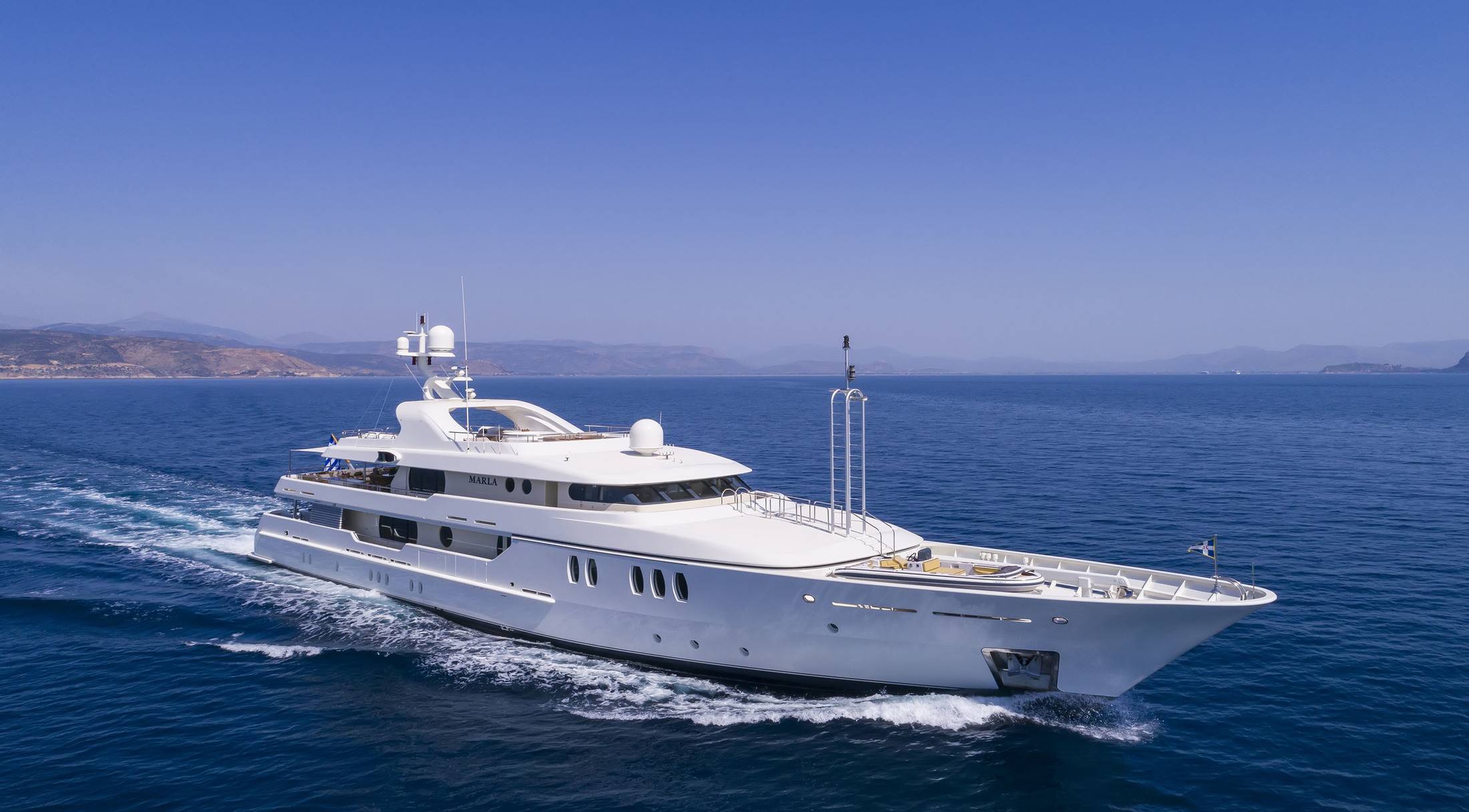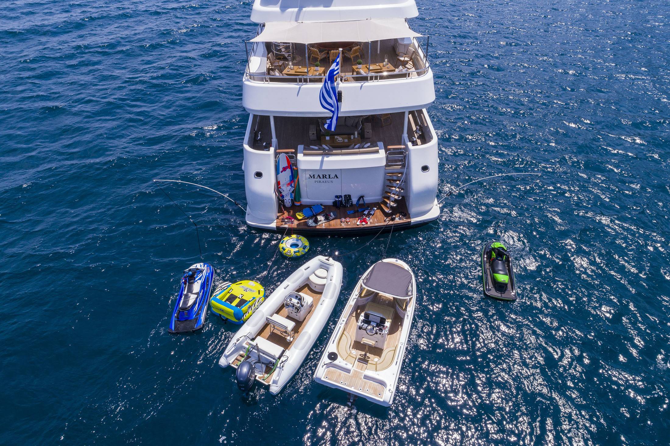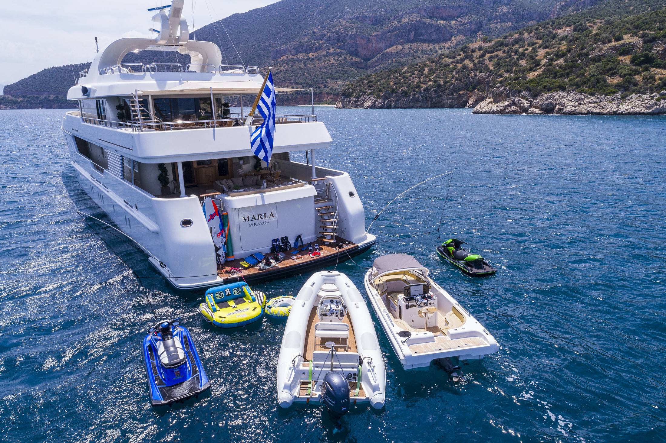 The yacht was designed by Terence Disdale, who is responsible for her stunning exterior and interior. Her sleek and beautiful lines, gorgeous furnishings as well as her impressive leisure and entertainment facilities, make her the ideal charter yacht for socializing and entertaining with family and friends. Her exceptional Captain Manolis, leads the highly experienced and professional crew of 12. Marla' sleeps up to 12 guests in 6 rooms, including a master suite, 2 double cabins and 2 twin cabins and 1 pullman bed, ensuring a relaxed luxury yachting experience. Made of steel and aluminum, she can achieve a top speed of 15.4 knots and a cruising speed of 13 knots. Please note that she has zero speed stabilizers. Previous refits on 2012 and 2014. Main engines were rebuilt to 0 hours and surveyed by Lloyd’s; generators replaced in 2010 and surveyed by Lloyd’s. Yacht has completed all class surveys. Intermediate ISM and ISPS carried out by flag in 2010. Galley fully equipped with commercial professional equipment. Her hull was repainted and her decks were refitted where necessary in the winter of 2009.