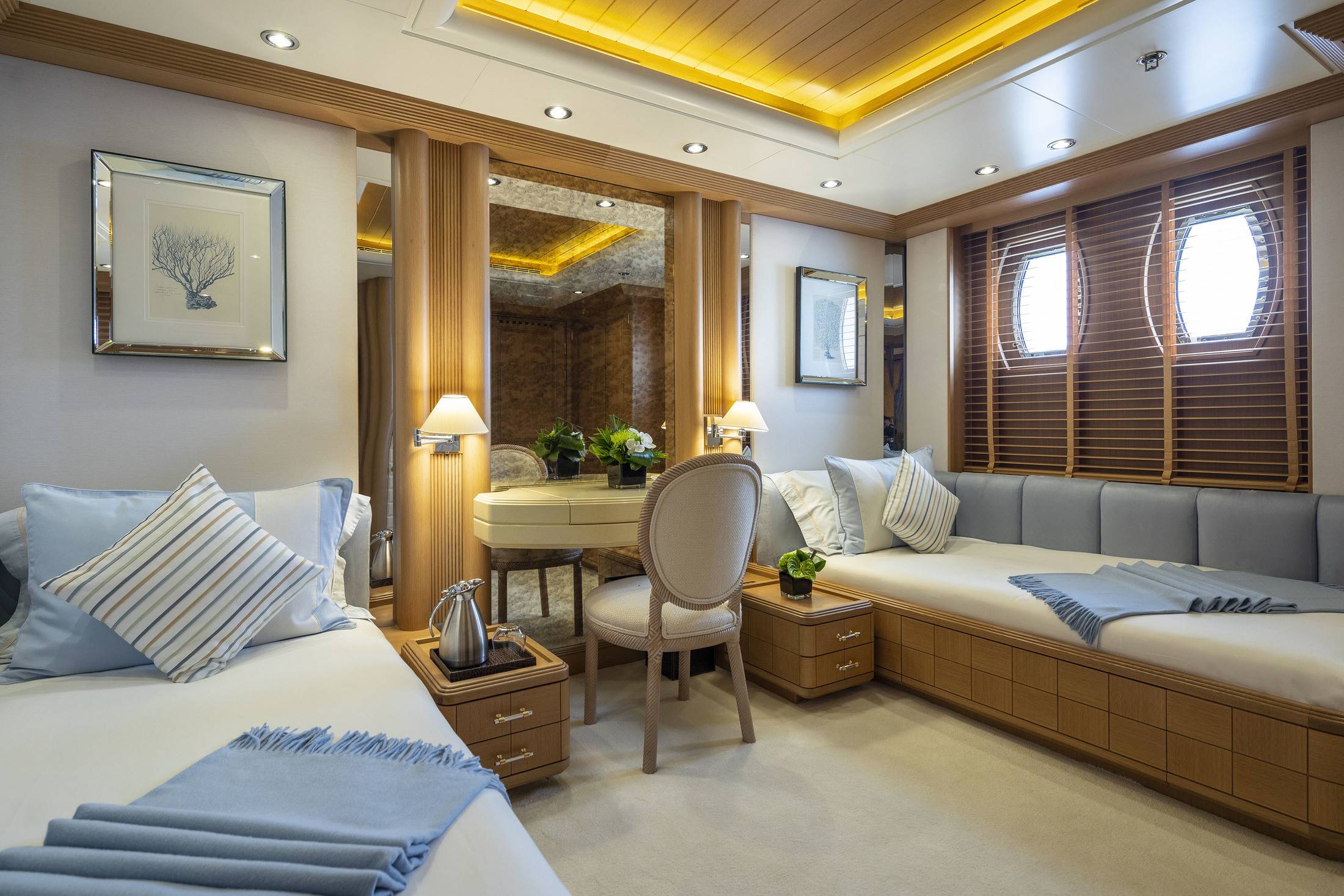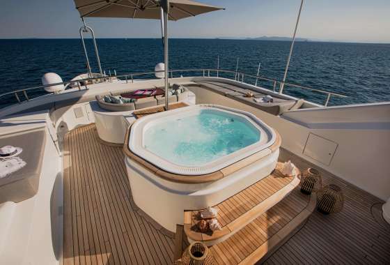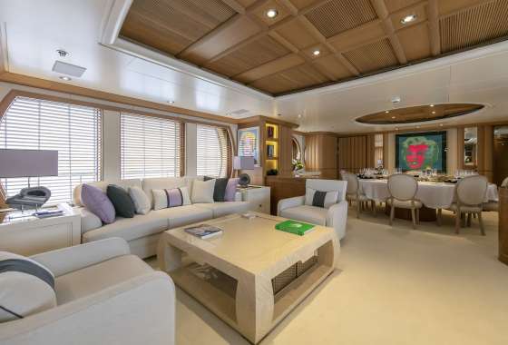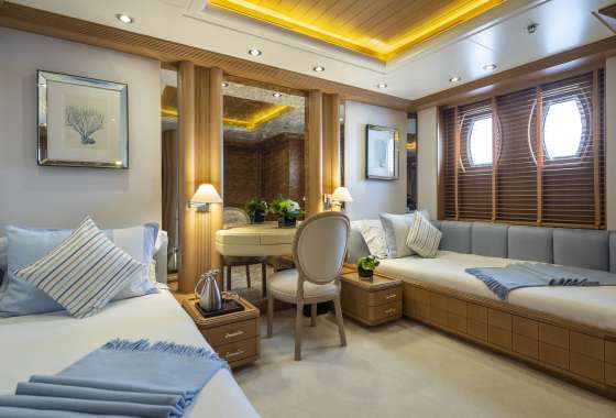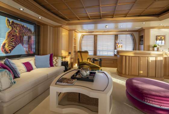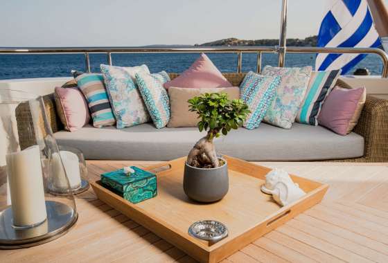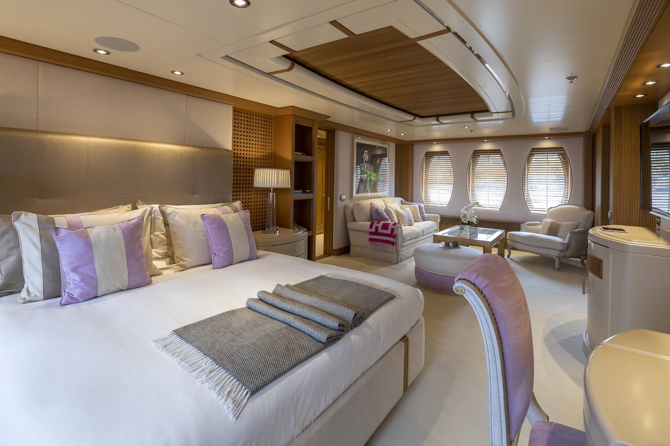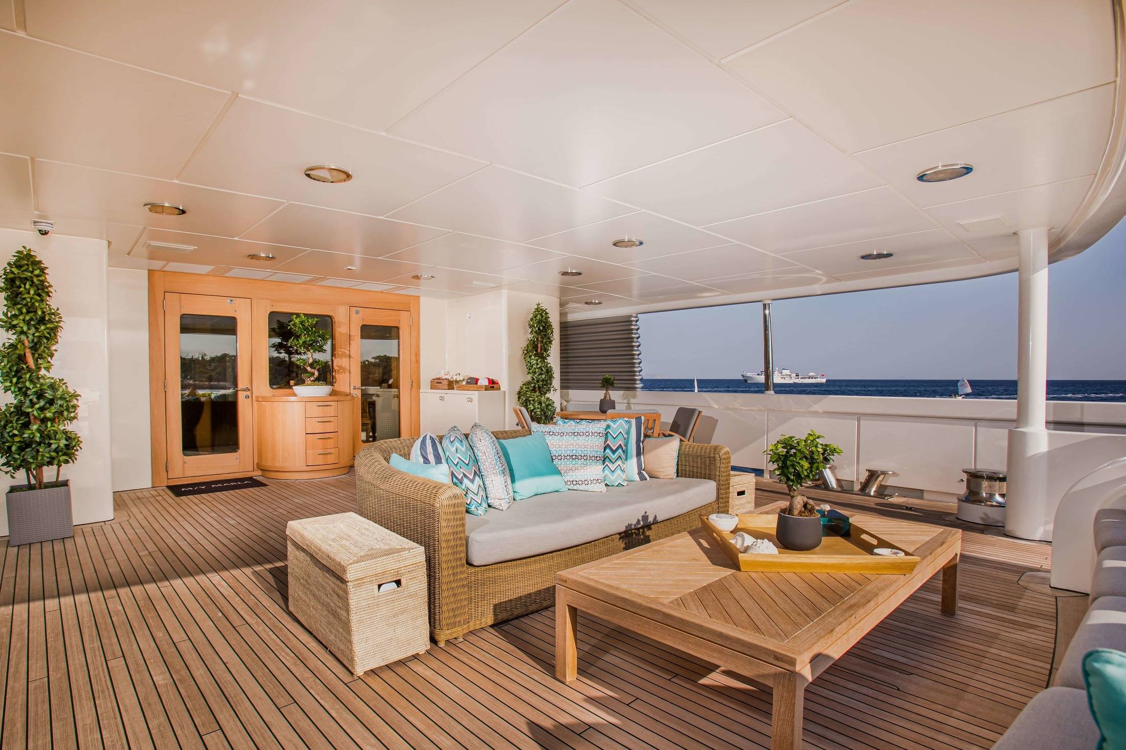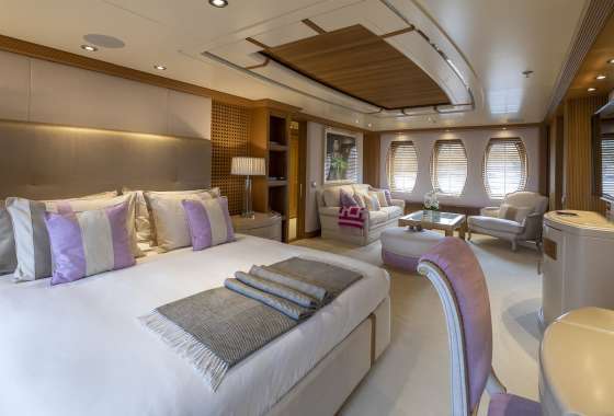 The yacht was designed by Terence Disdale, who is responsible for her stunning exterior and interior. Her sleek and beautiful lines, gorgeous furnishings as well as her impressive leisure and entertainment facilities, make her the ideal charter yacht for socializing and entertaining with family and friends. Her exceptional Captain Manolis, leads the highly experienced and professional crew of 12. Marla' sleeps up to 12 guests in 6 rooms, including a master suite, 2 double cabins and 2 twin cabins and 1 pullman bed, ensuring a relaxed luxury yachting experience. Made of steel and aluminum, she can achieve a top speed of 15.4 knots and a cruising speed of 13 knots. Please note that she has zero speed stabilizers. Previous refits on 2012 and 2014. Main engines were rebuilt to 0 hours and surveyed by Lloyd’s; generators replaced in 2010 and surveyed by Lloyd’s. Yacht has completed all class surveys. Intermediate ISM and ISPS carried out by flag in 2010. Galley fully equipped with commercial professional equipment. Her hull was repainted and her decks were refitted where necessary in the winter of 2009.