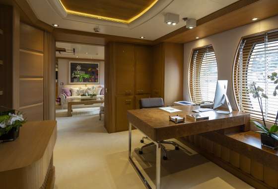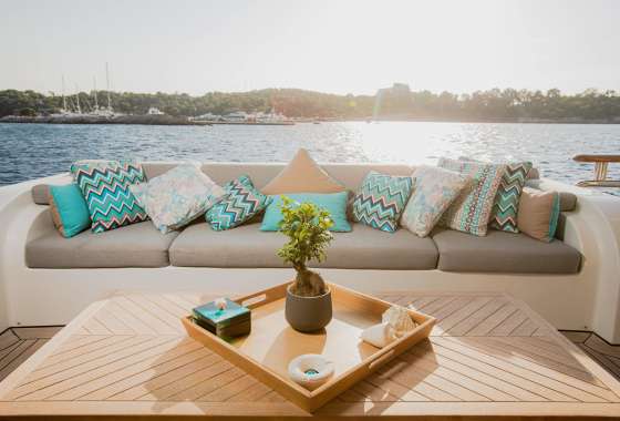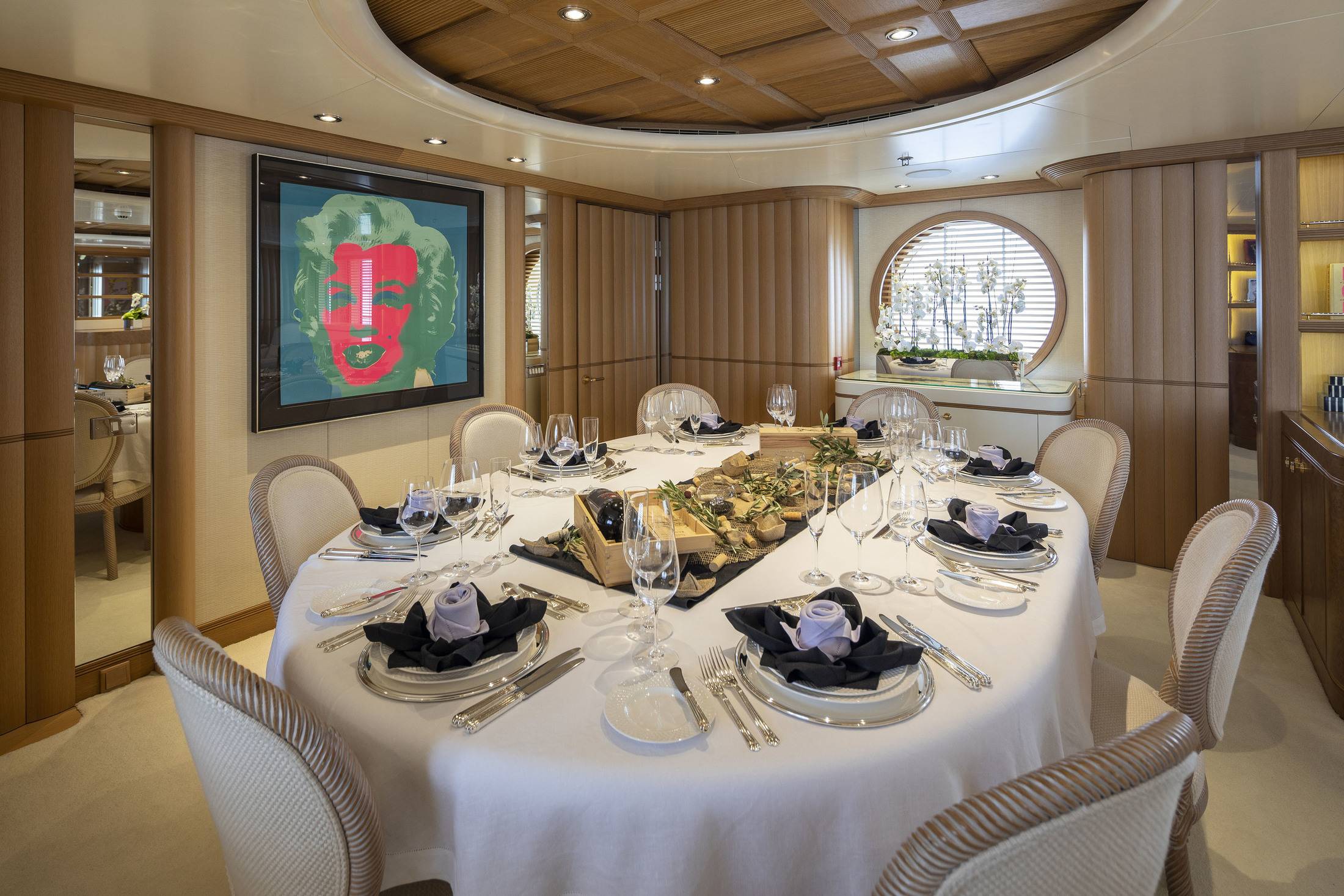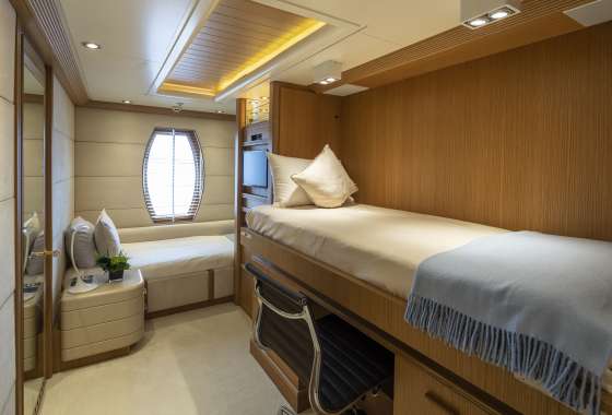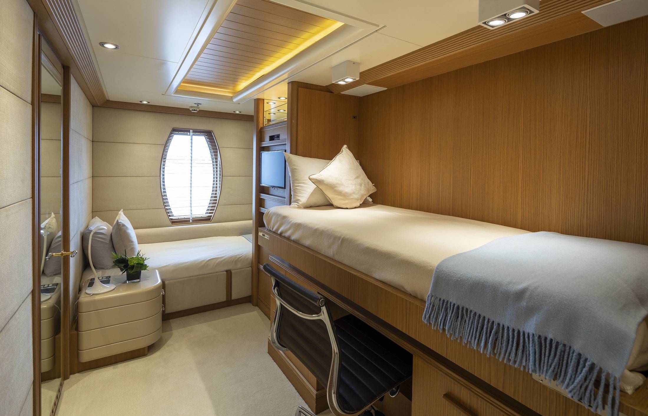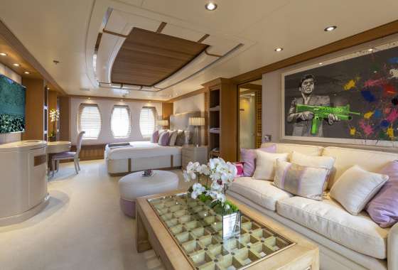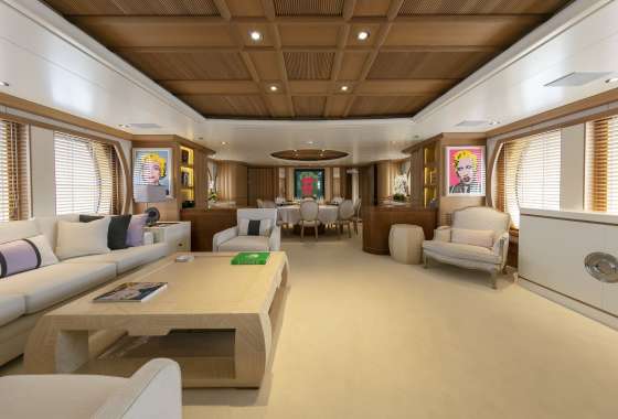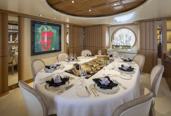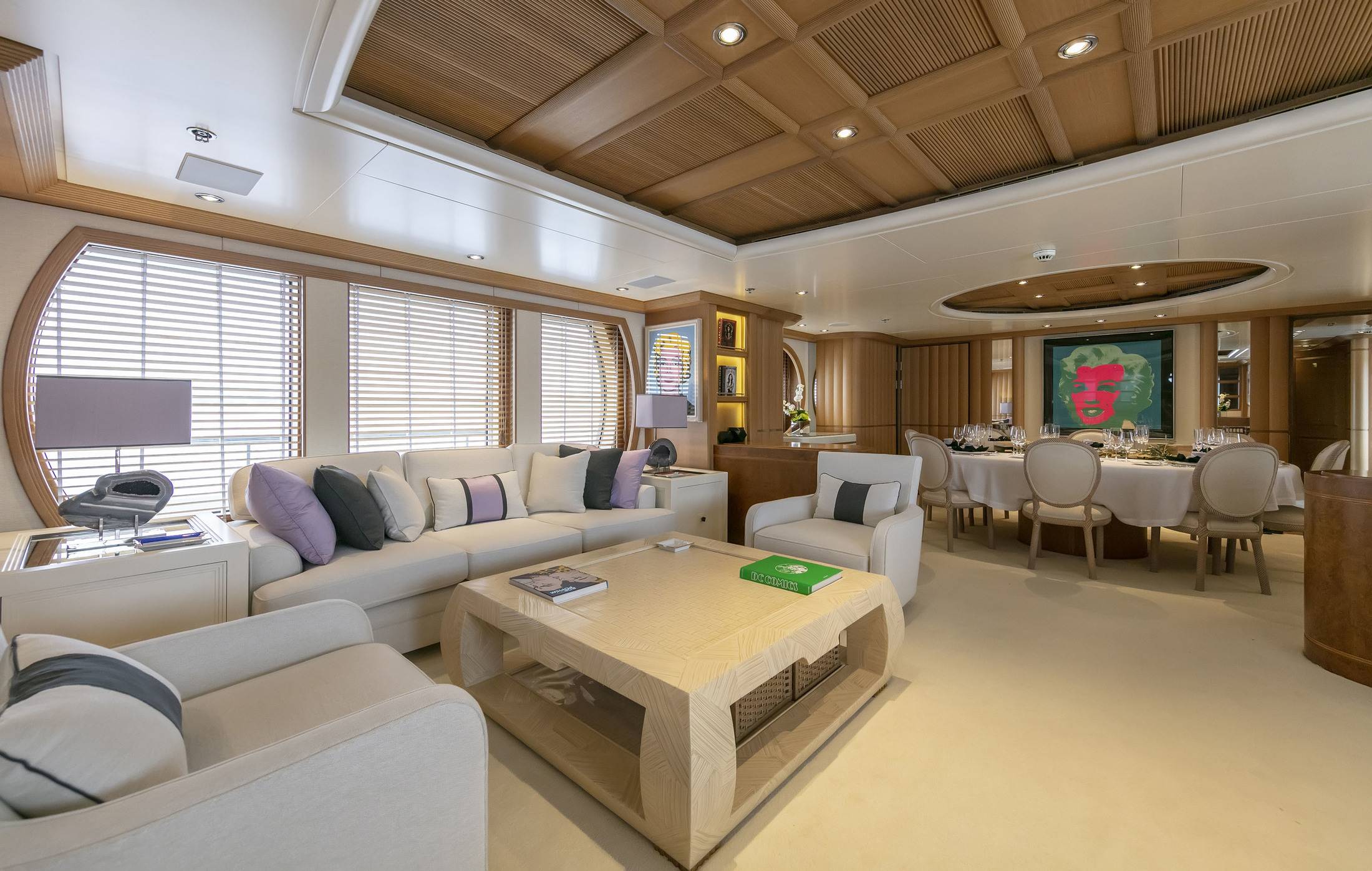 The yacht was designed by Terence Disdale, who is responsible for her stunning exterior and interior. Her sleek and beautiful lines, gorgeous furnishings as well as her impressive leisure and entertainment facilities, make her the ideal charter yacht for socializing and entertaining with family and friends. Her exceptional Captain Manolis, leads the highly experienced and professional crew of 12. Marla' sleeps up to 12 guests in 6 rooms, including a master suite, 2 double cabins and 2 twin cabins and 1 pullman bed, ensuring a relaxed luxury yachting experience. Made of steel and aluminum, she can achieve a top speed of 15.4 knots and a cruising speed of 13 knots. Please note that she has zero speed stabilizers. Previous refits on 2012 and 2014. Main engines were rebuilt to 0 hours and surveyed by Lloyd’s; generators replaced in 2010 and surveyed by Lloyd’s. Yacht has completed all class surveys. Intermediate ISM and ISPS carried out by flag in 2010. Galley fully equipped with commercial professional equipment. Her hull was repainted and her decks were refitted where necessary in the winter of 2009.
