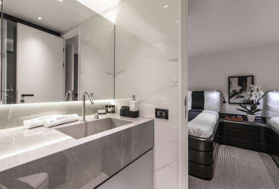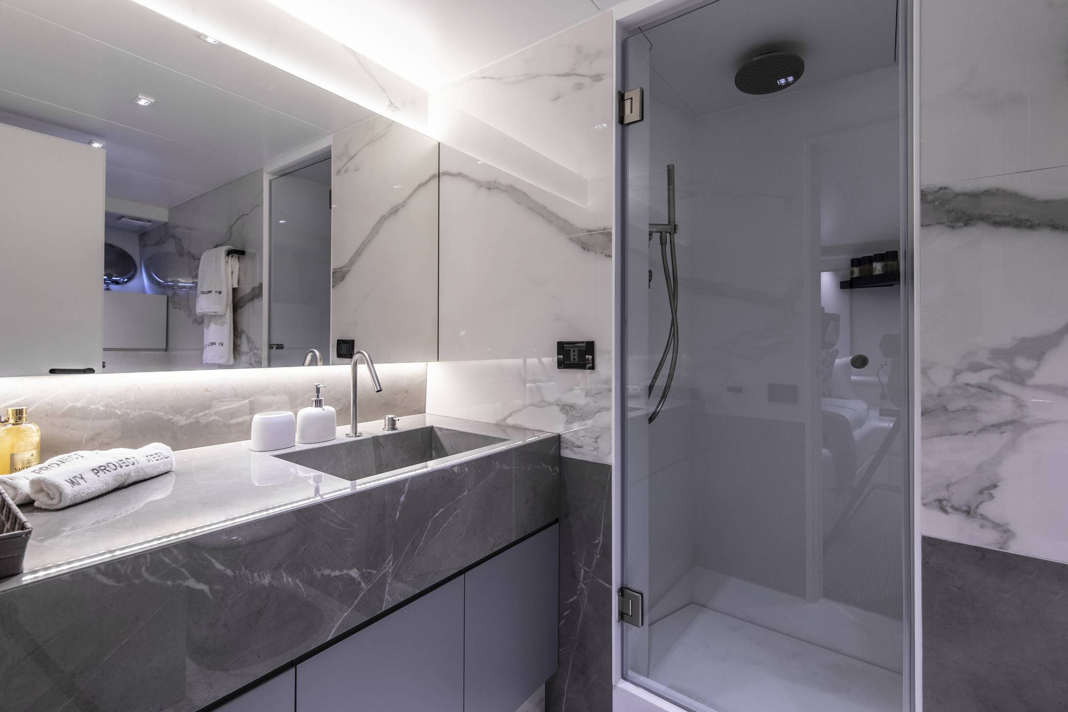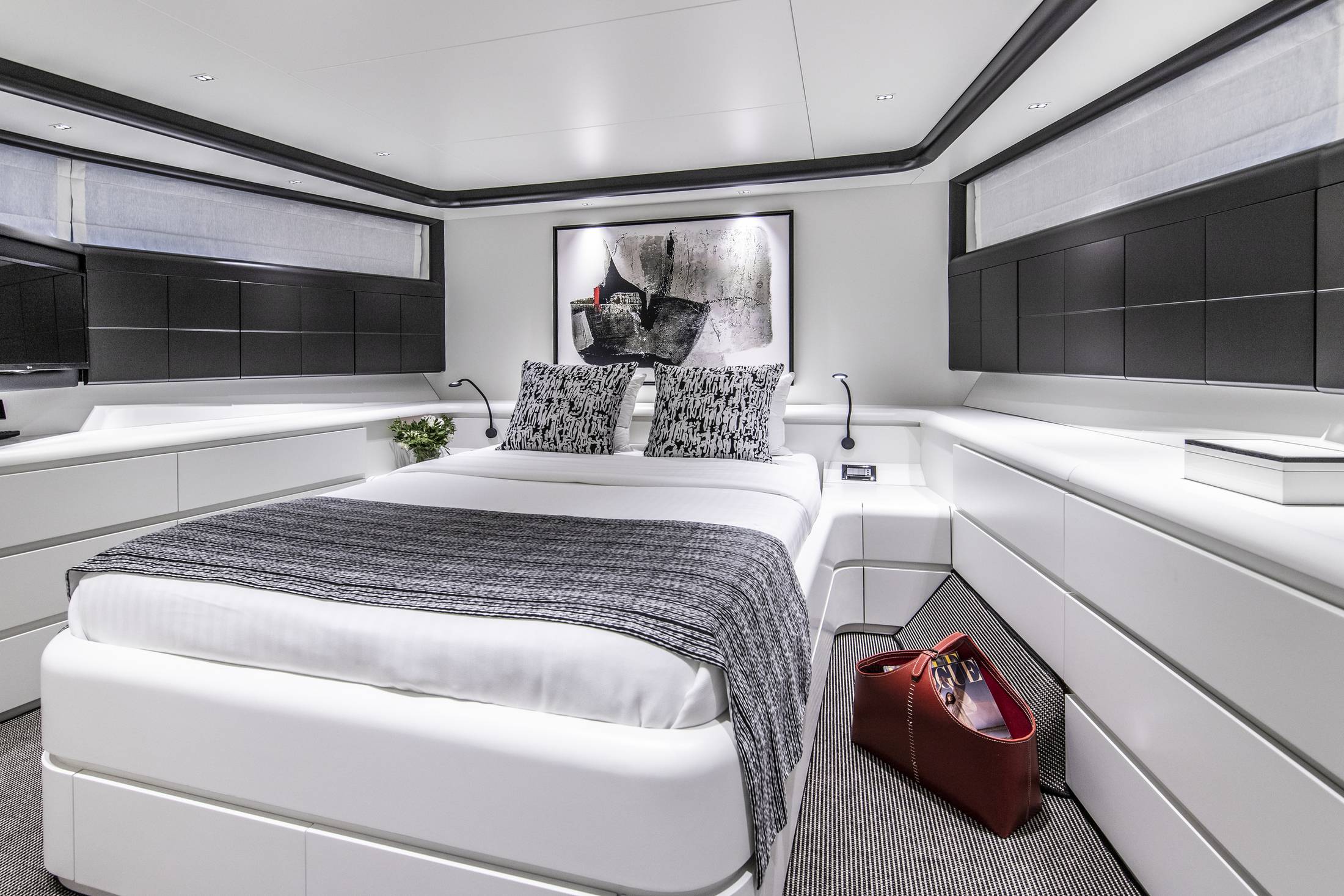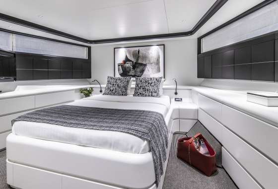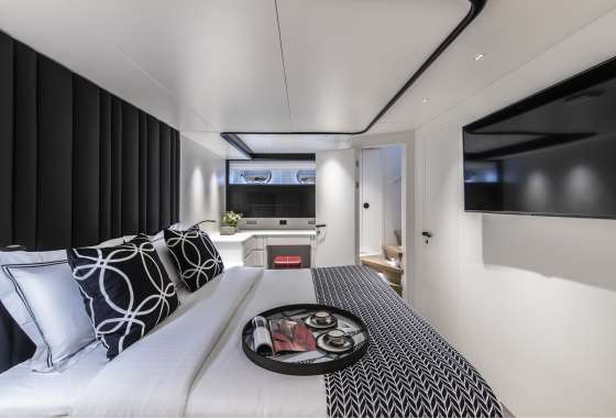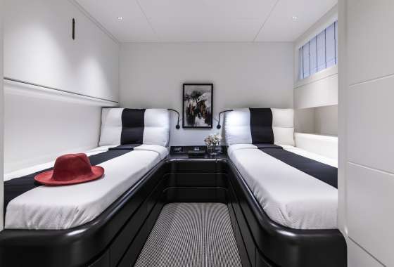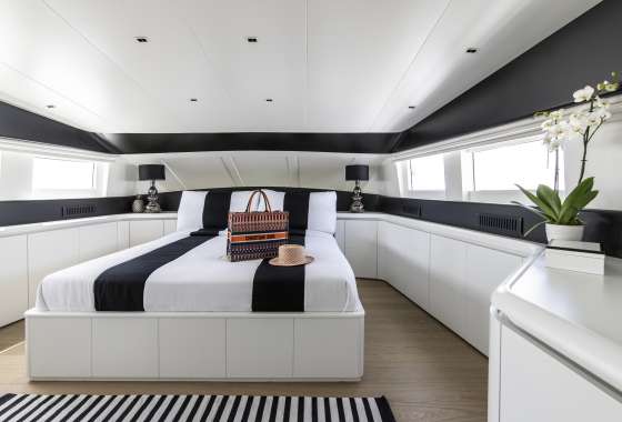 12 guests in 1 Master Suite (King), 1 VIP (Queen), 1 Double convertible to playroom & 2 twin cabins each with an additional single upper pullman, all fully air-conditioned and with en-suite facilities.