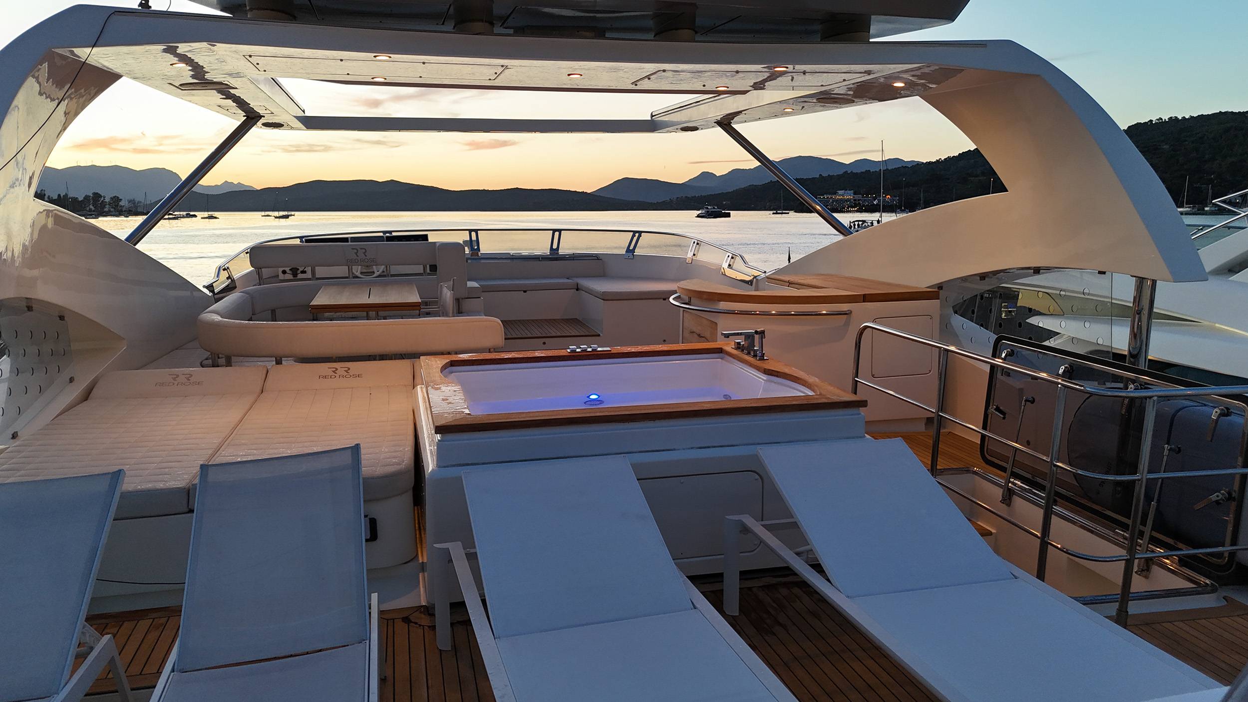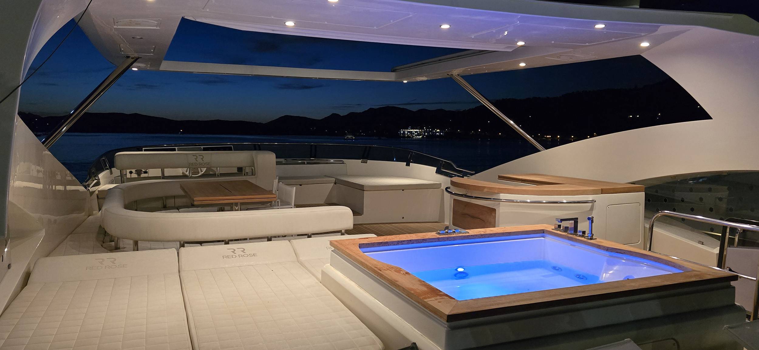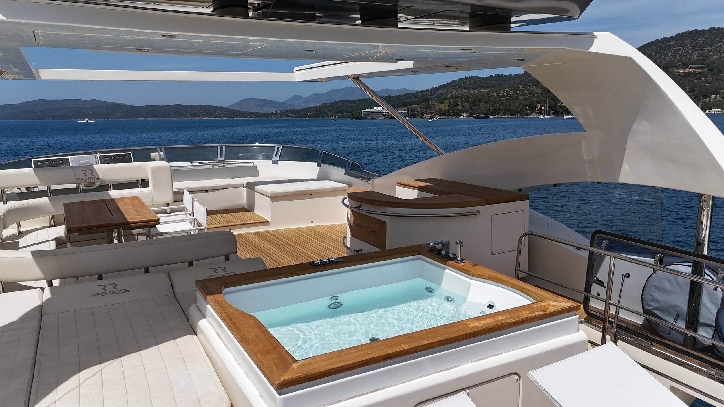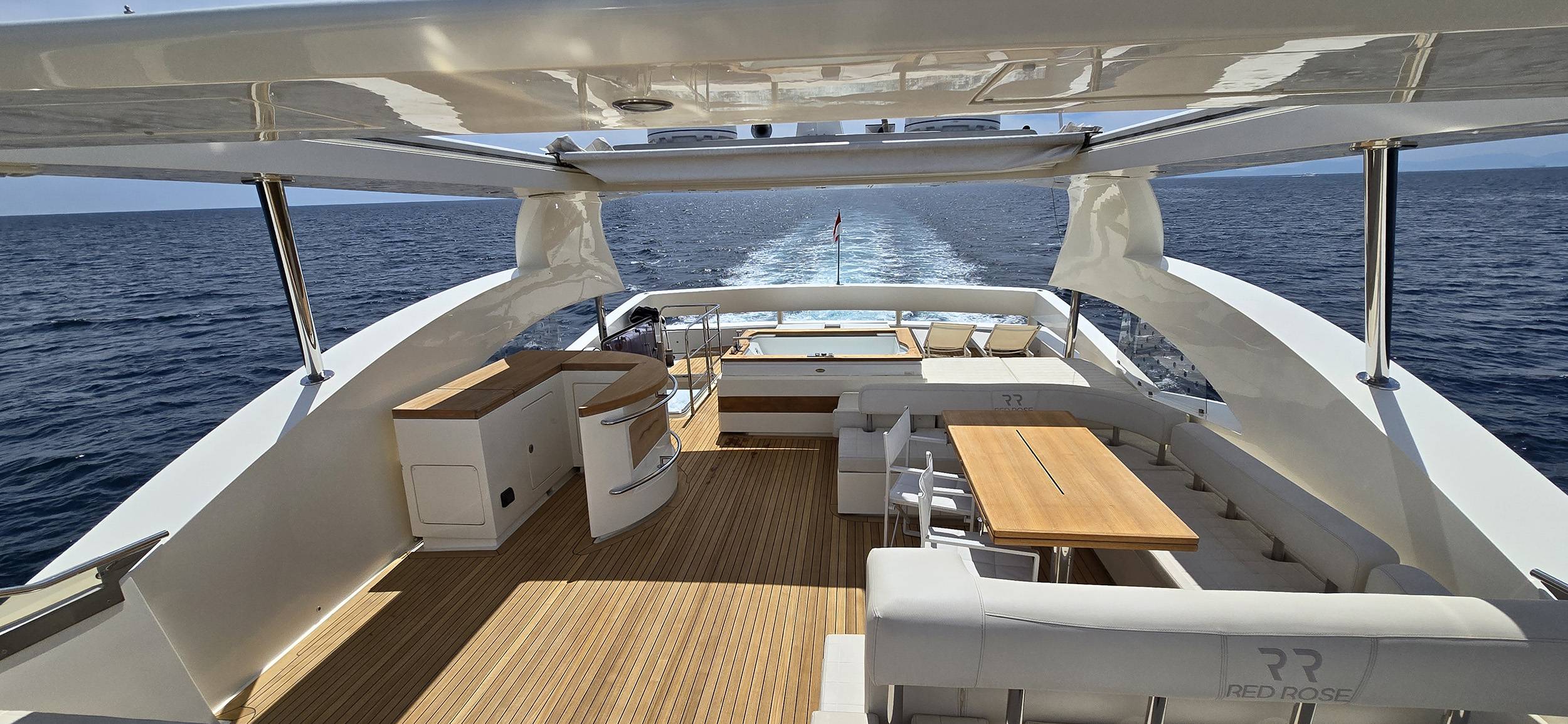 Designed for outdoor indulgence, Red Rose offers expansive deck spaces featuring a spacious jacuzzi and a larger hardtop than most yachts in her class. Her generous seating areas create the perfect setting for all-day alfresco dining, from a light morning breakfast to a leisurely lunch and an exquisite evening feast under the stars.