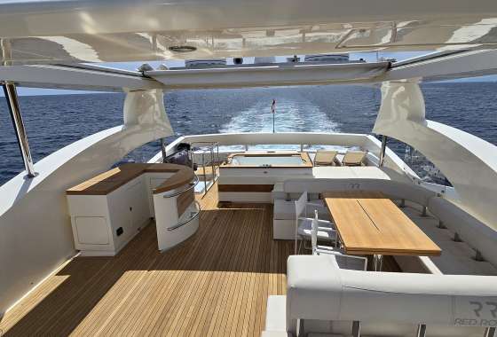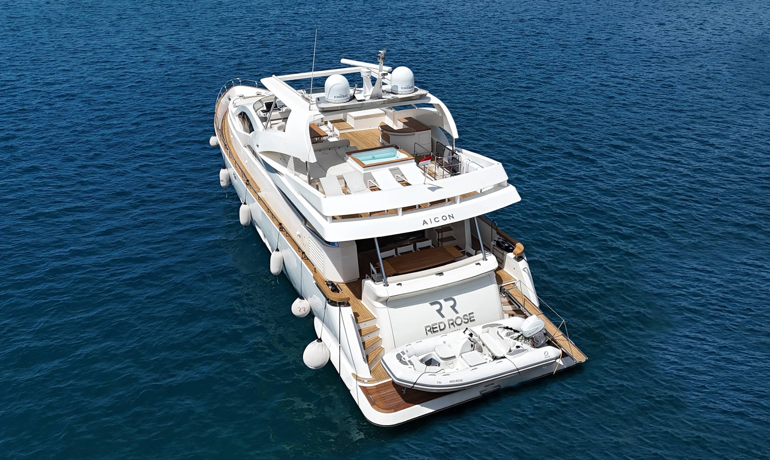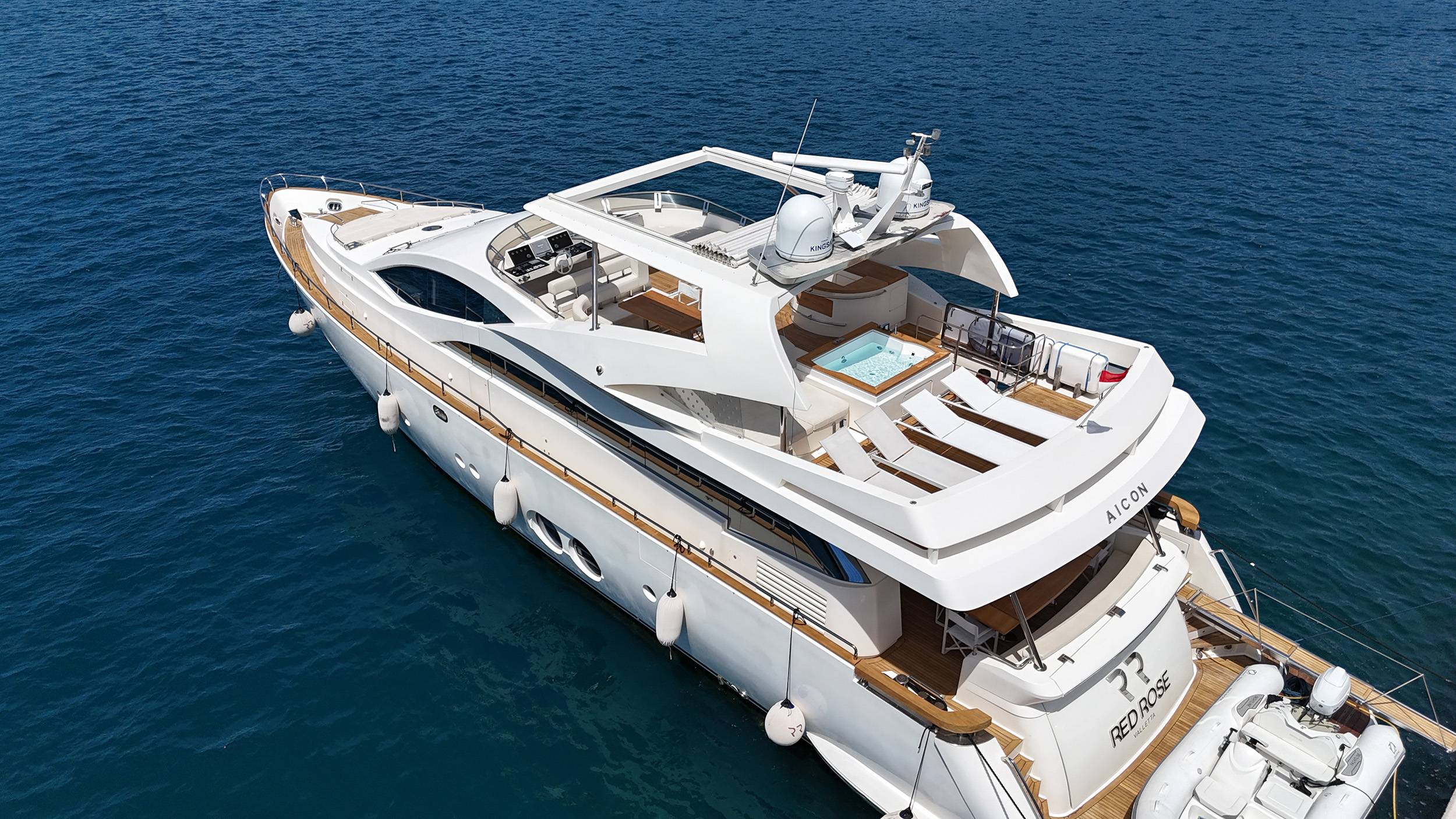 The Aicon 85 Flybridge Red Rose is a striking luxurious motor yacht that seamlessly blends sleek design with exceptional comfort, delivering an unforgettable yachting experience. Her modern yet sophisticated profile makes her a true standout on the water, while zero-speed stabilizers ensure supreme comfort even at anchor.