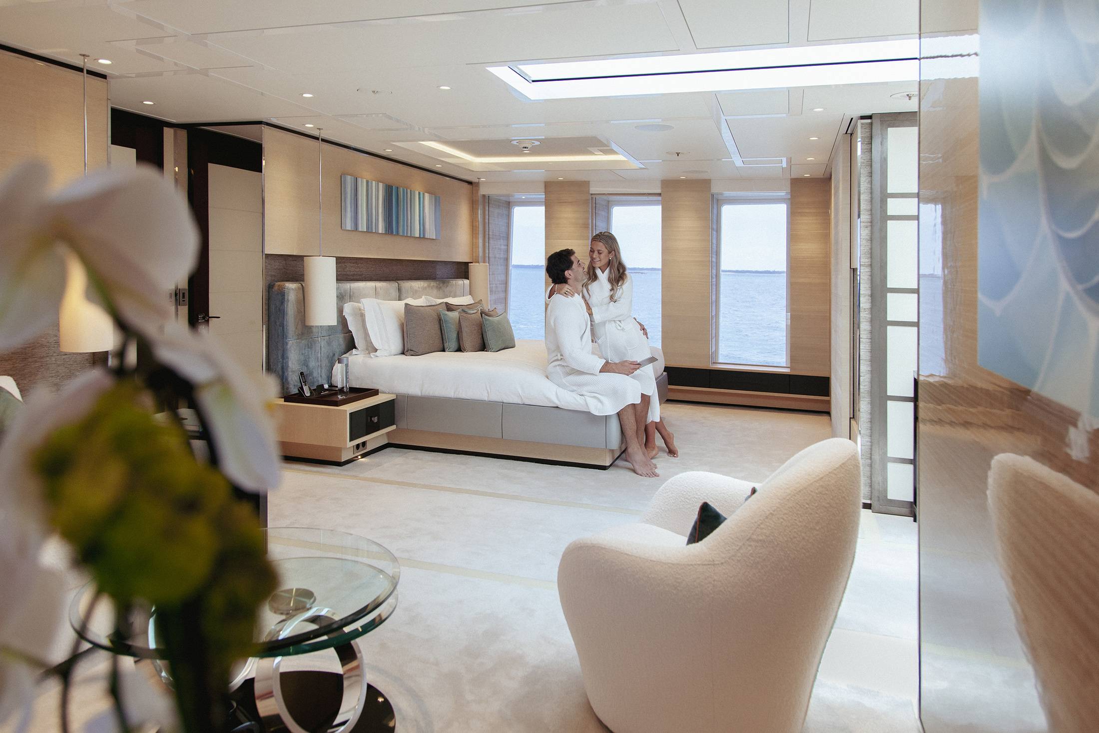 Main deck master – a massive 87.1 m², full beam, forward facing, floor to ceiling windows, with skylight overhead flooding room with natural light, separate seating area with en suite shower room
