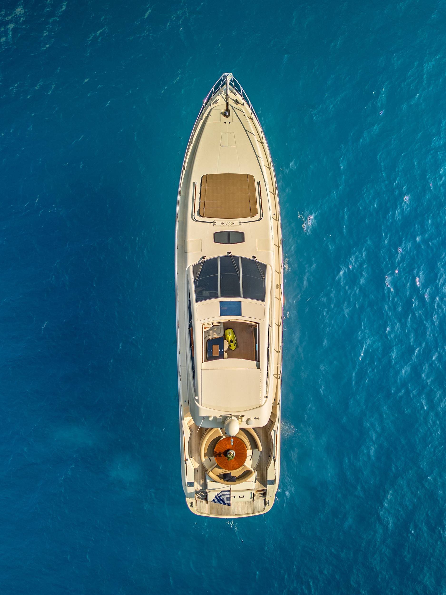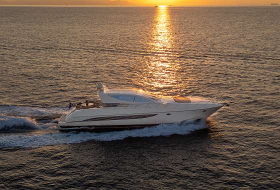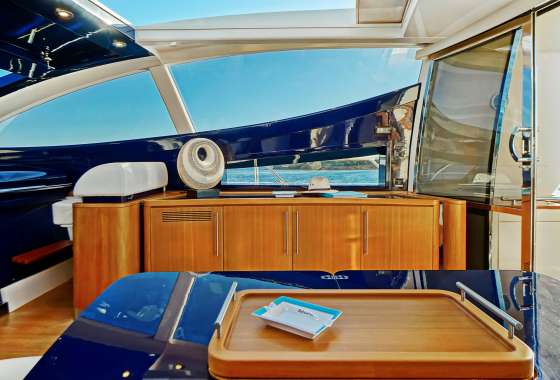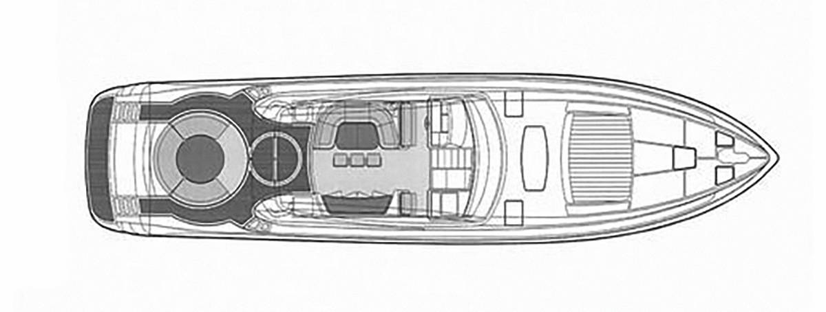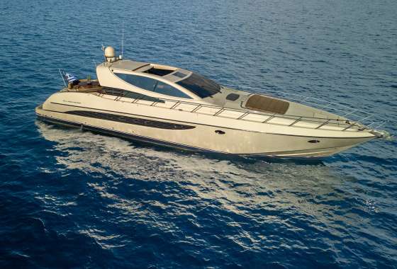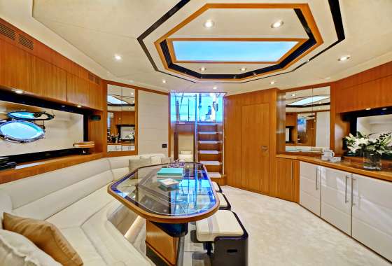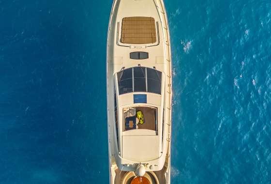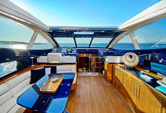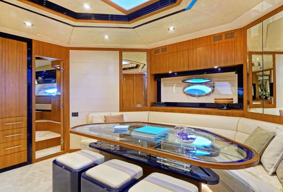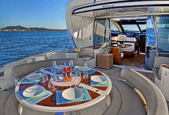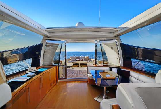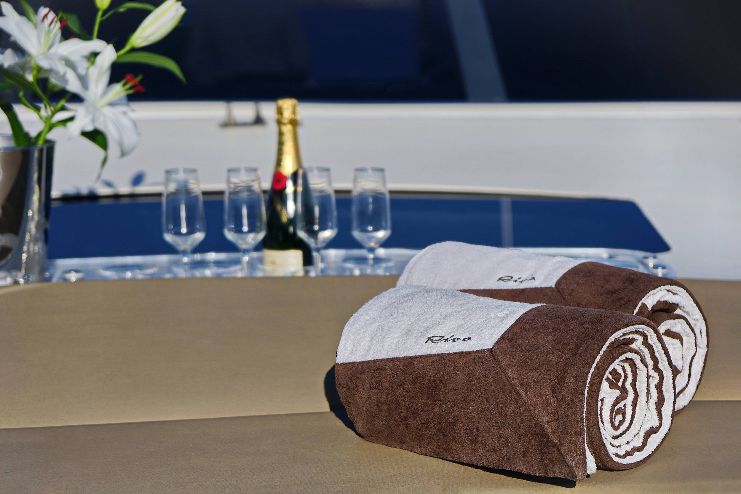 An elegant yacht that Riva describes as a "cabriolet sports cruiser". She features a retractable sunroof on her main deck salon, flooding the interior with sunlight and at her lower deck there is a large semi-transparent skylight, also allowing natural light to enter.