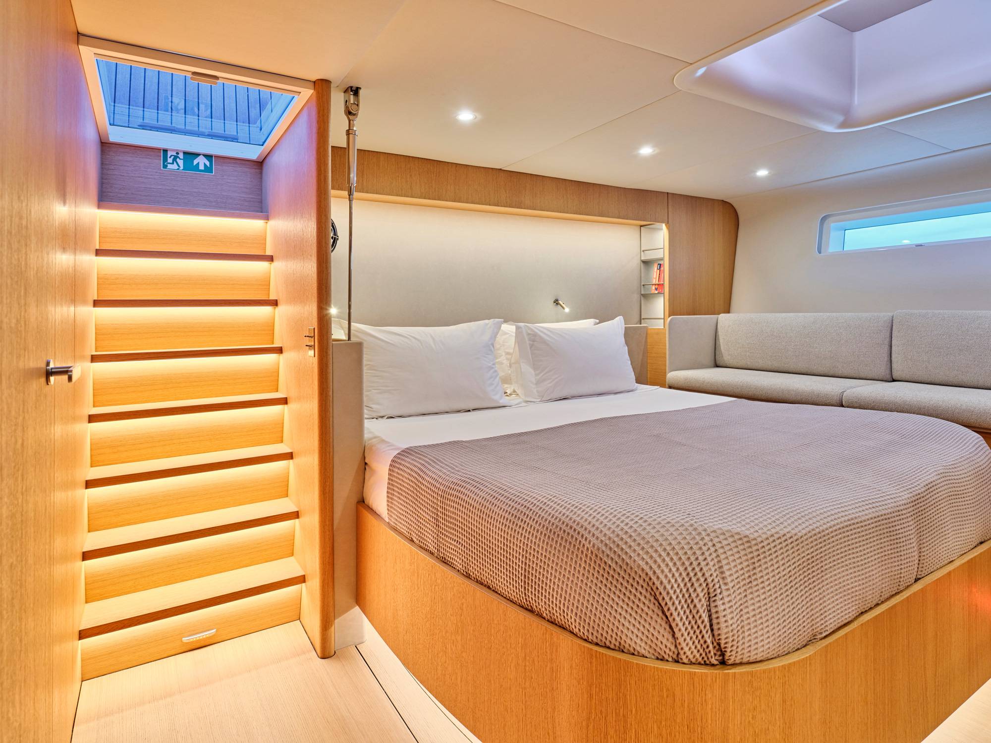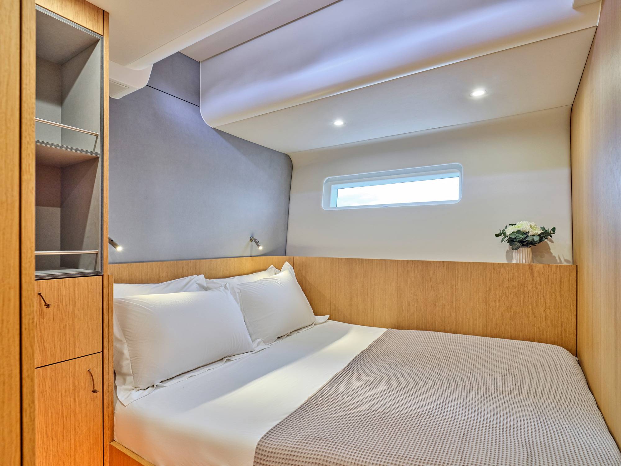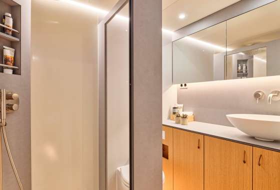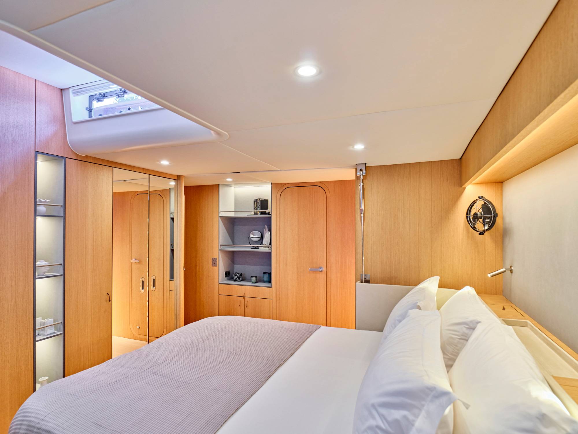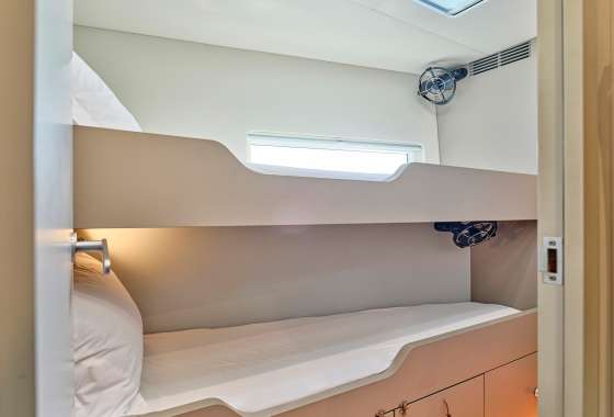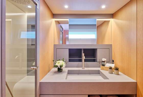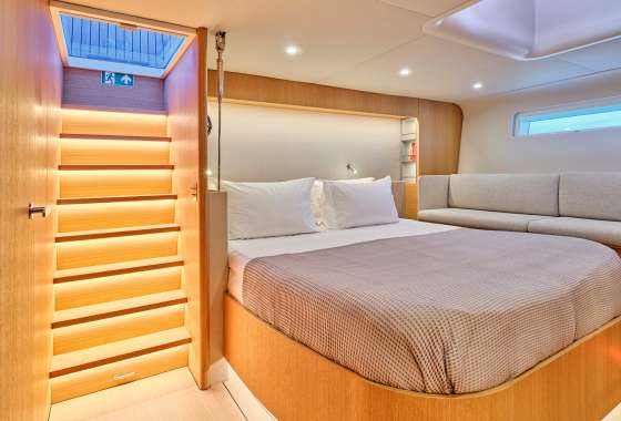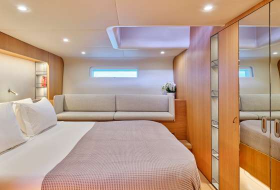 Water maker 300 liters/hour, Air conditioning, Ice maker, Wine cooler, Safe in Master cabin, Hair dryer.