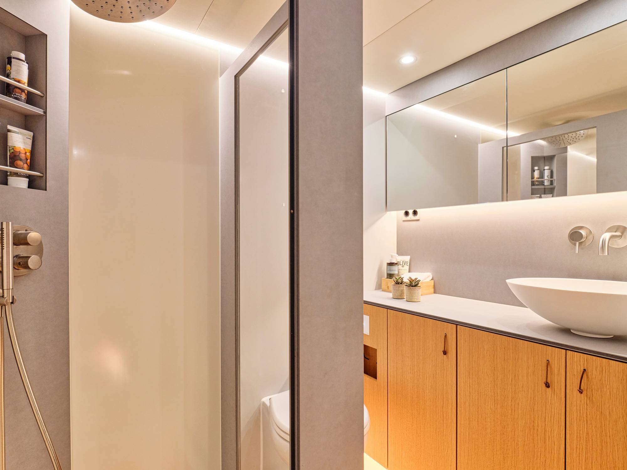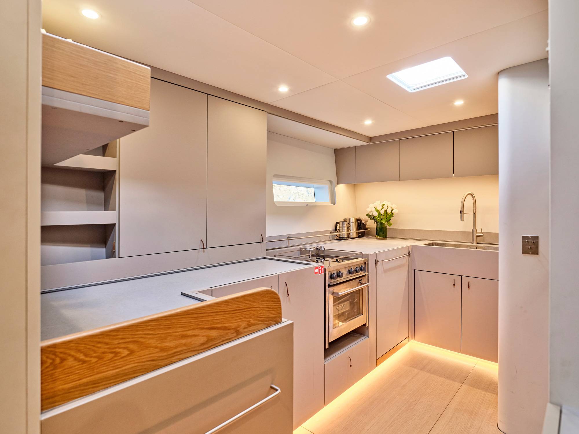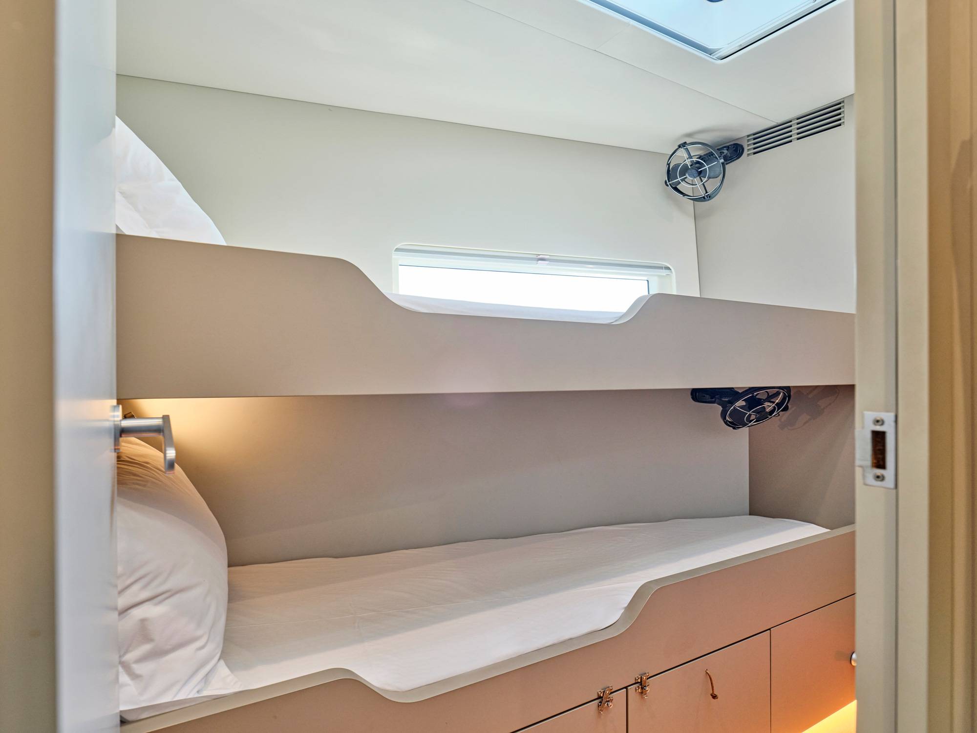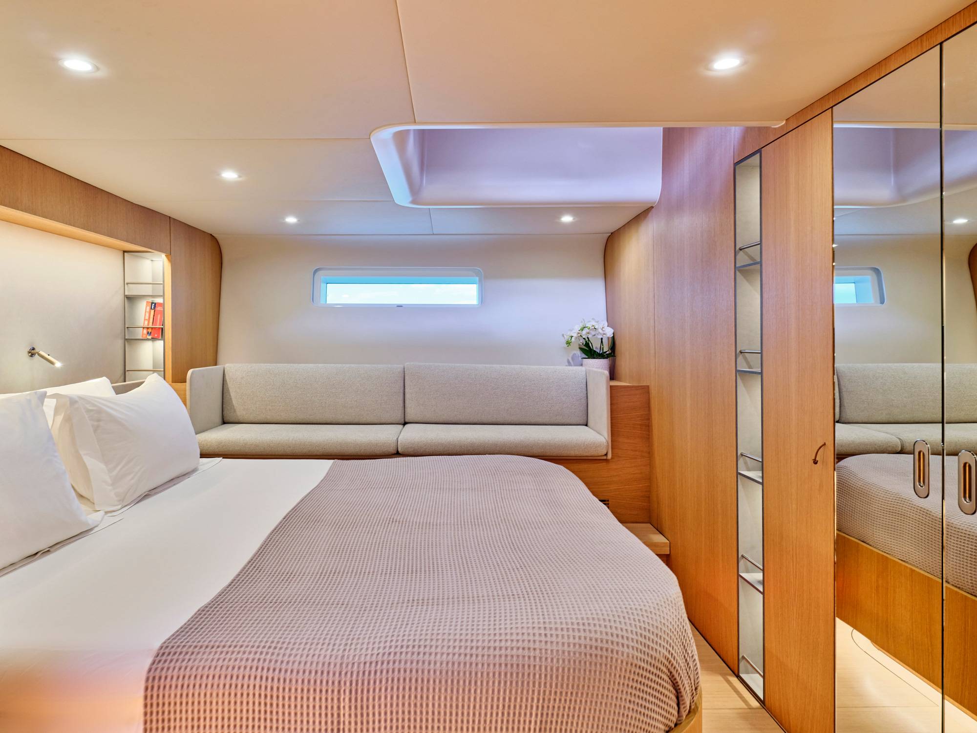Water maker 300 liters/hour, Air conditioning, Ice maker, Wine cooler, Safe in Master cabin, Hair dryer.