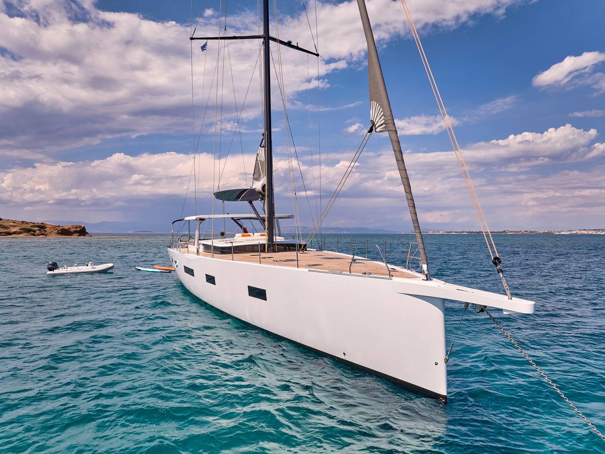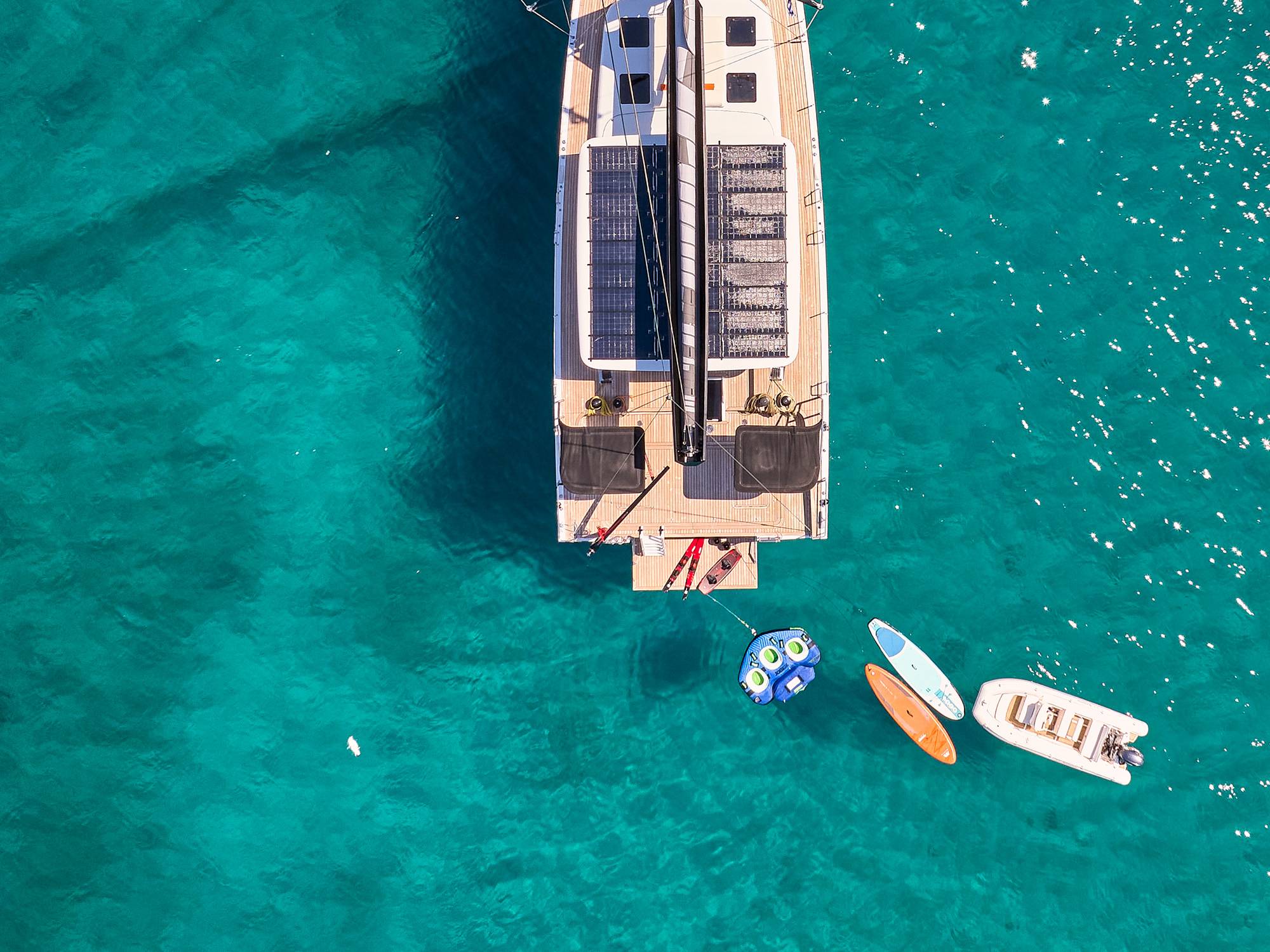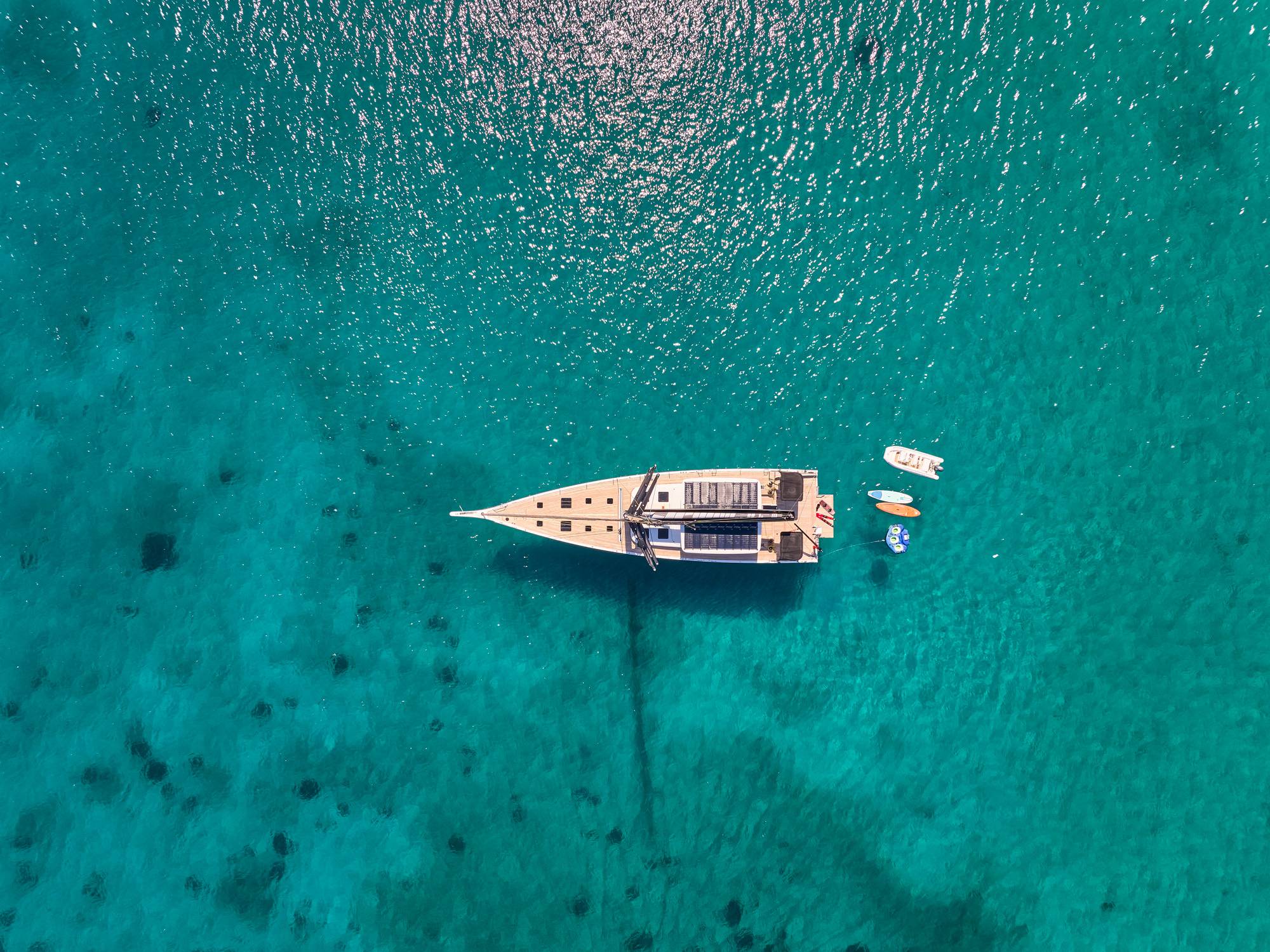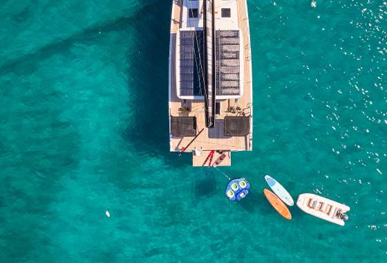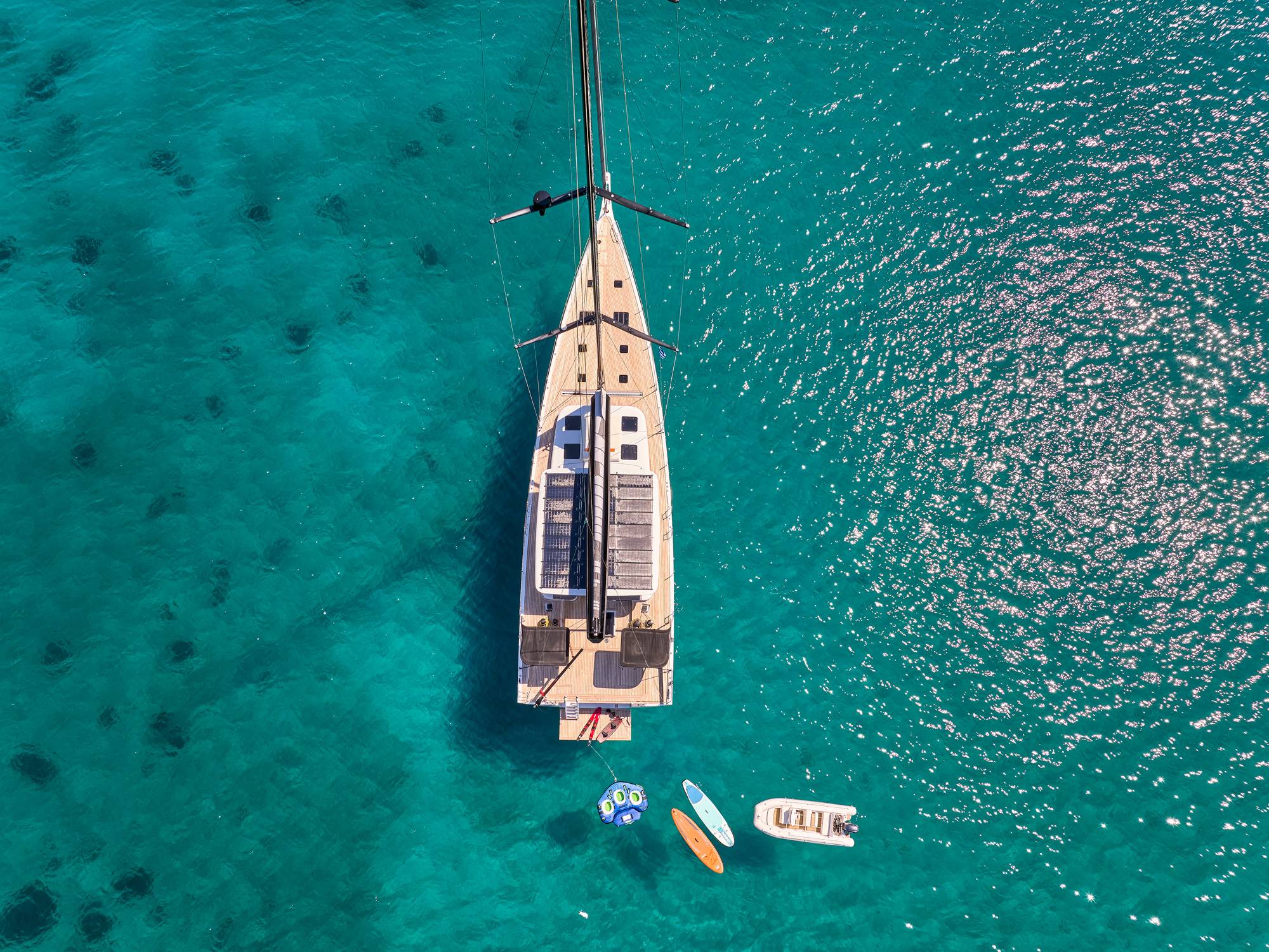 Tender Aer Marine 4.2 meters plus 60hp Yamaha outboard, Skis (adult and kid), Wakeboard (adult and kid), Donut, Yamaha Jet Pod Pro sea scooter, 2x SUP, Fins and snorkels.