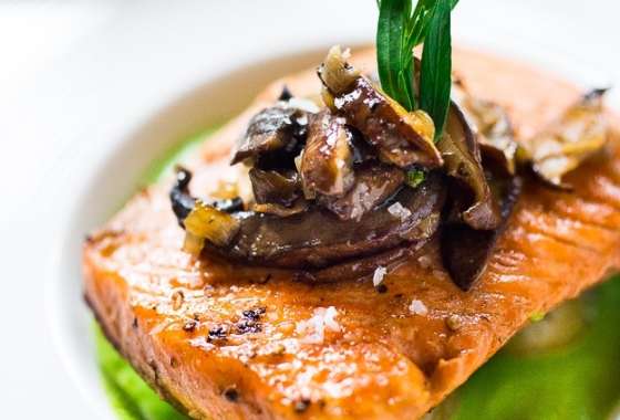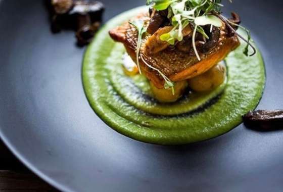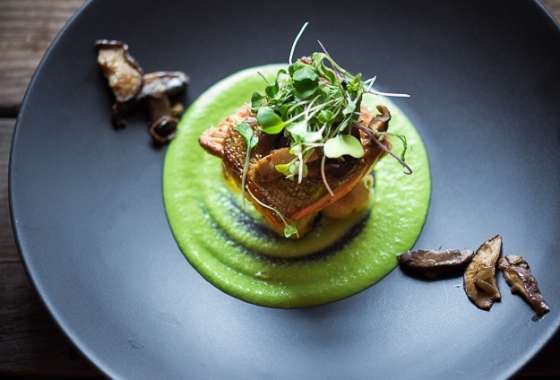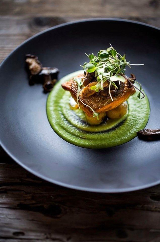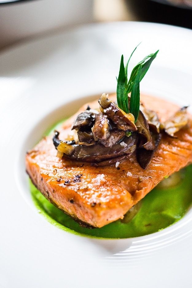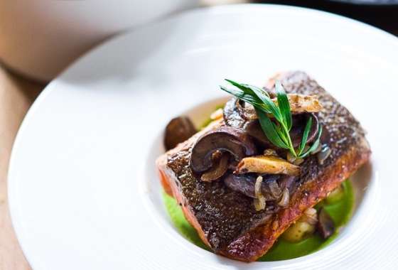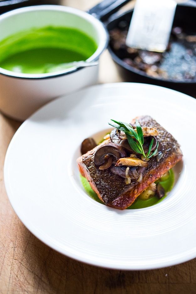 • Divide sauce among plates. Top with 3-4 potatoes and put on the fish (the skin side up ) Top with the mushrooms. Finish with few drops of truffle oil and some fresh herbs.